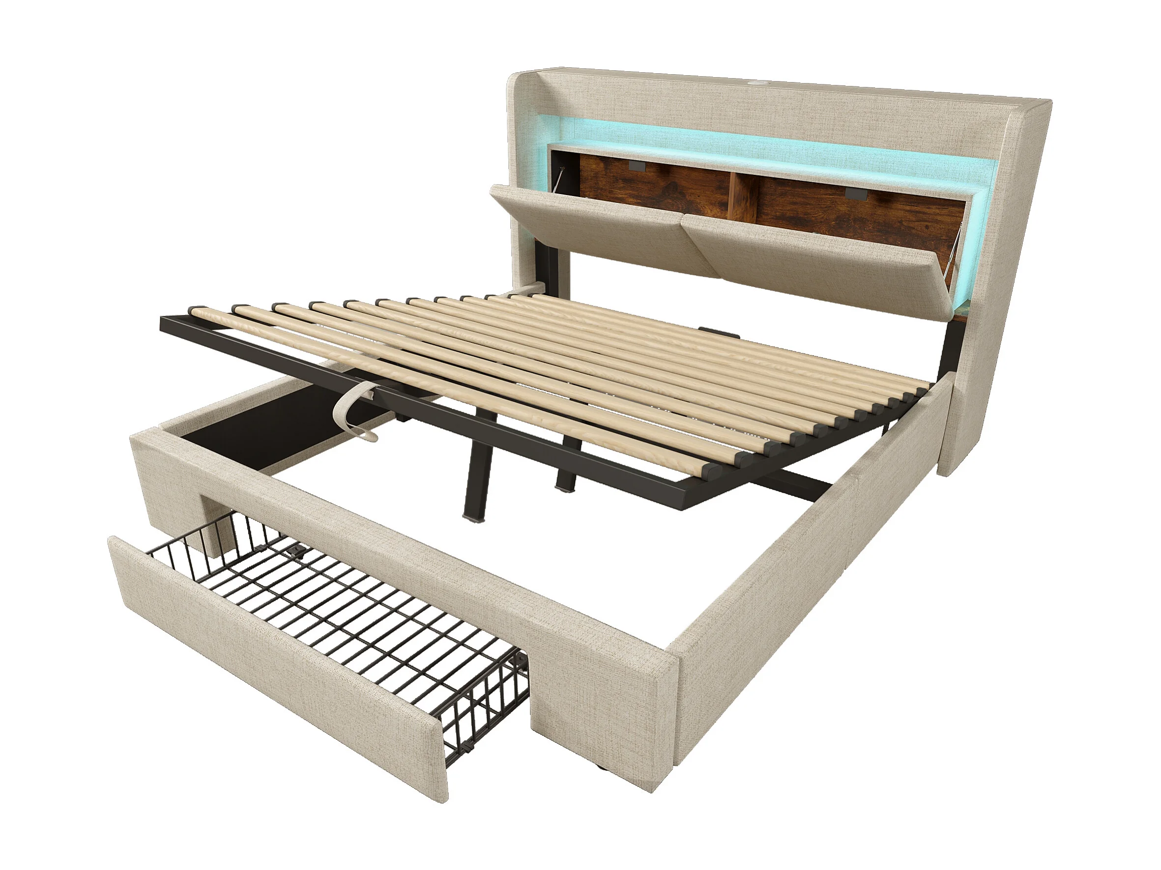Cama doble de 160x200 cm con canapé en lino beige - Cama para adultos con iluminación LED, puertos USB y cabecero con canapé