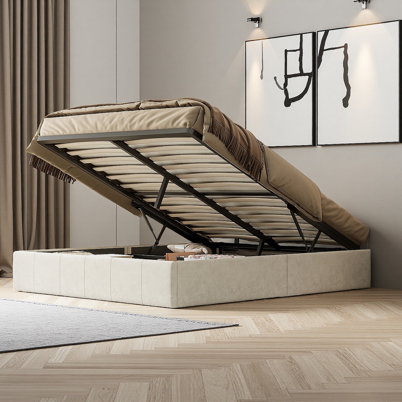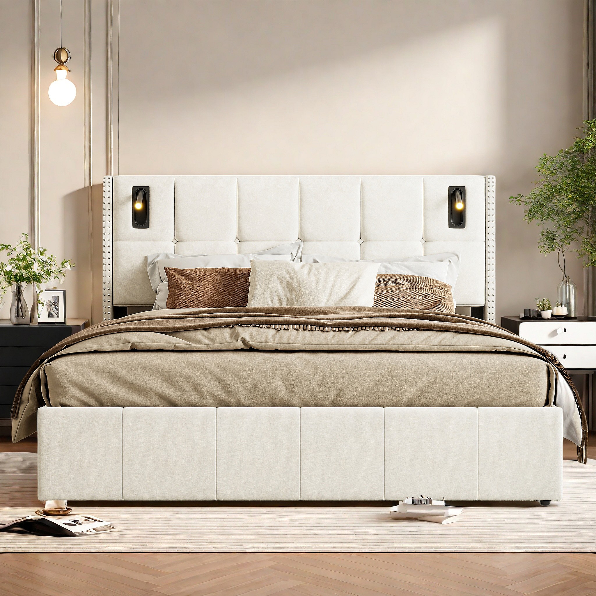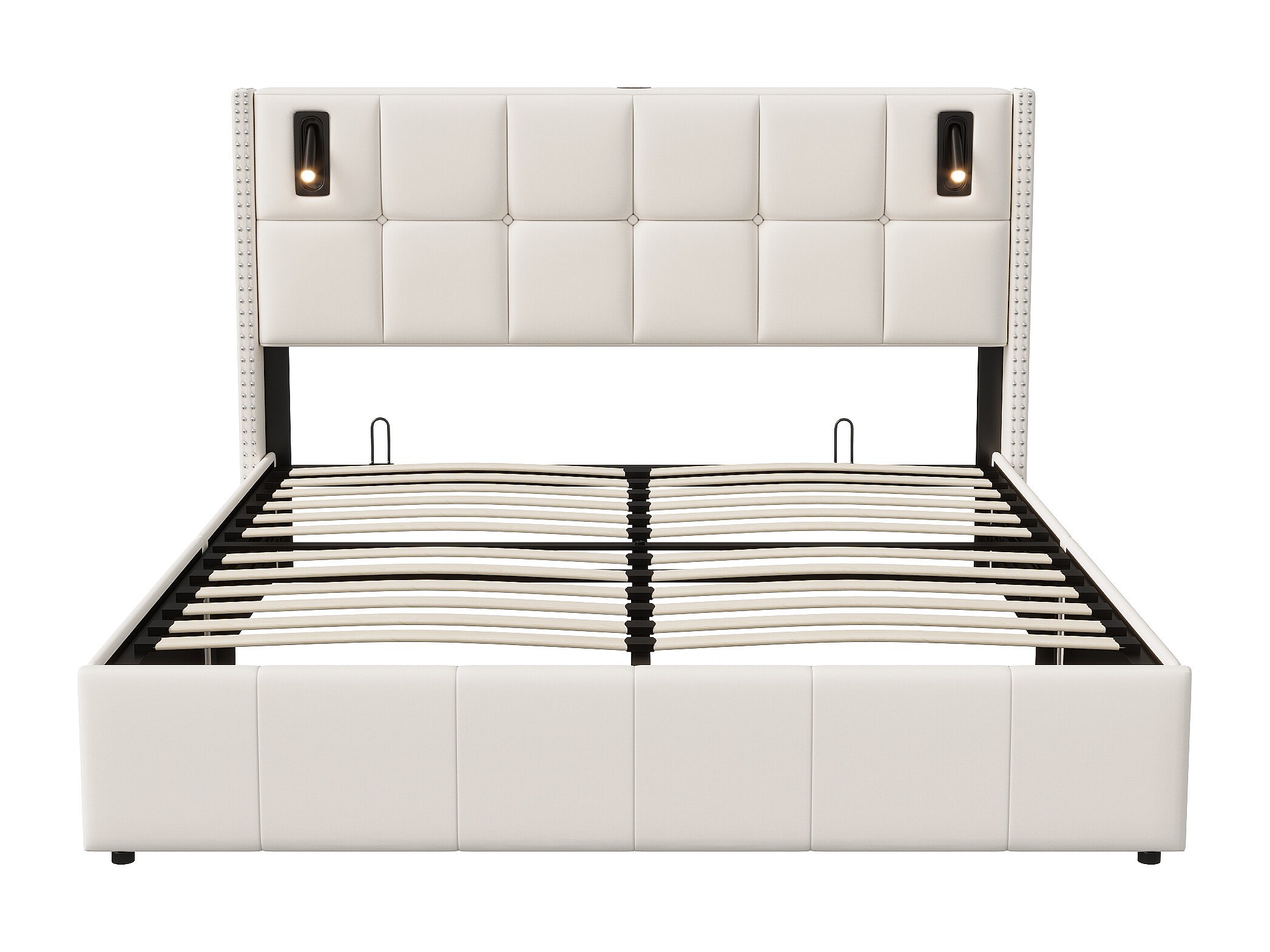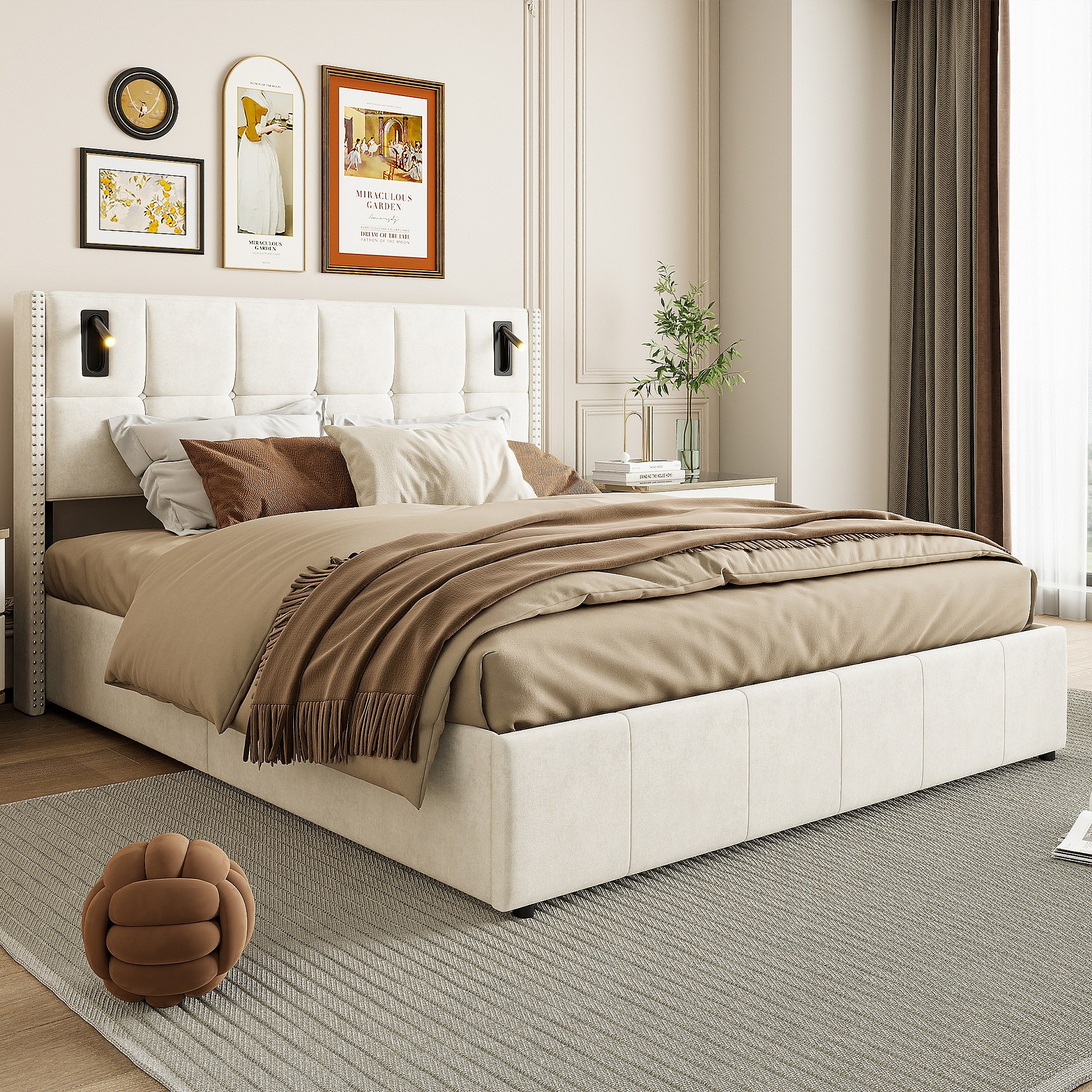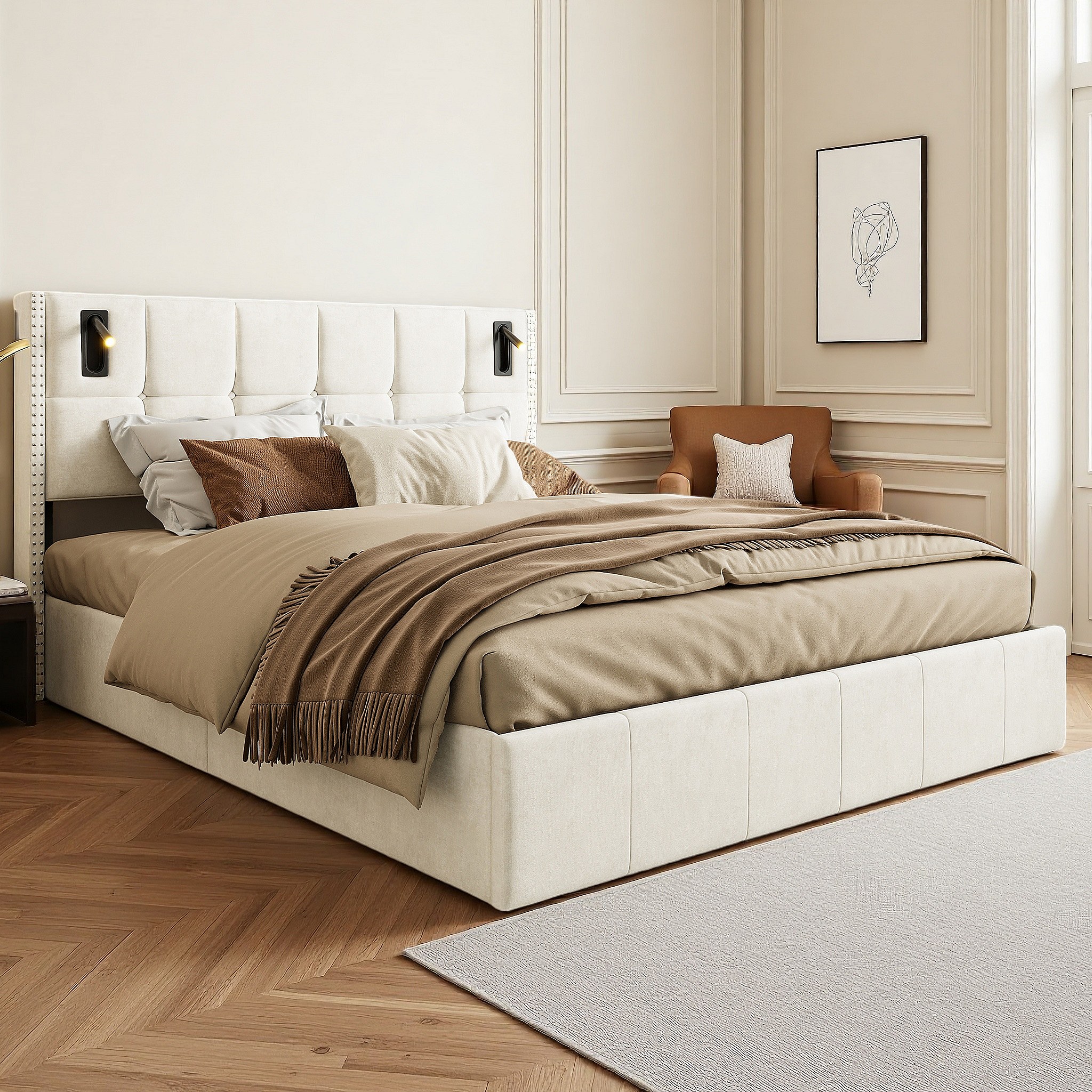 Cama doble de 160x200 cm en terciopelo beige con compartimento de almacenamiento hidráulico, cabecero con tachuelas y luces de lectura integradas