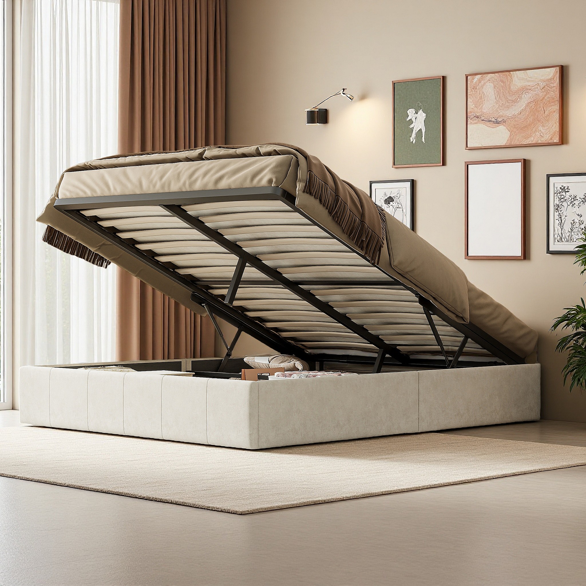 Cama doble hidráulica con plataforma tapizada de 160 x 200 cm, somier de láminas de madera, beige (sin colchón).