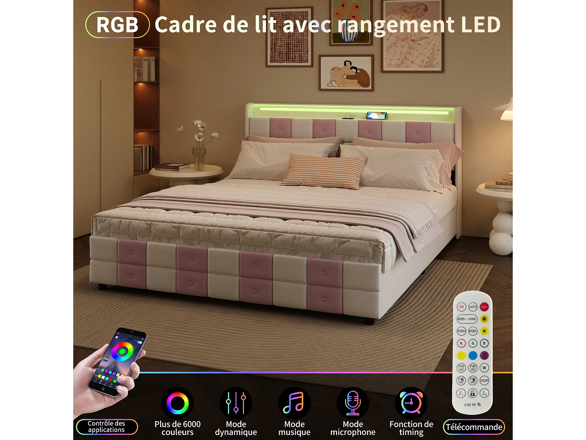 Cama doble de 160x200 cm, terciopelo blanco y rosa con somier de láminas, iluminación LED, puertos USB y 4 cajones de almacenaje.