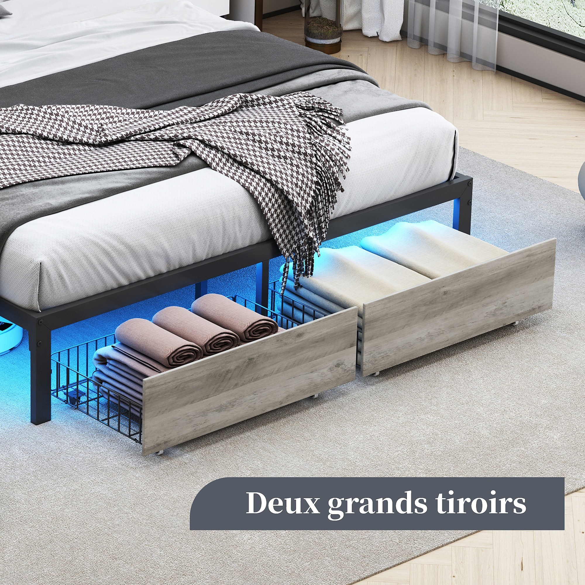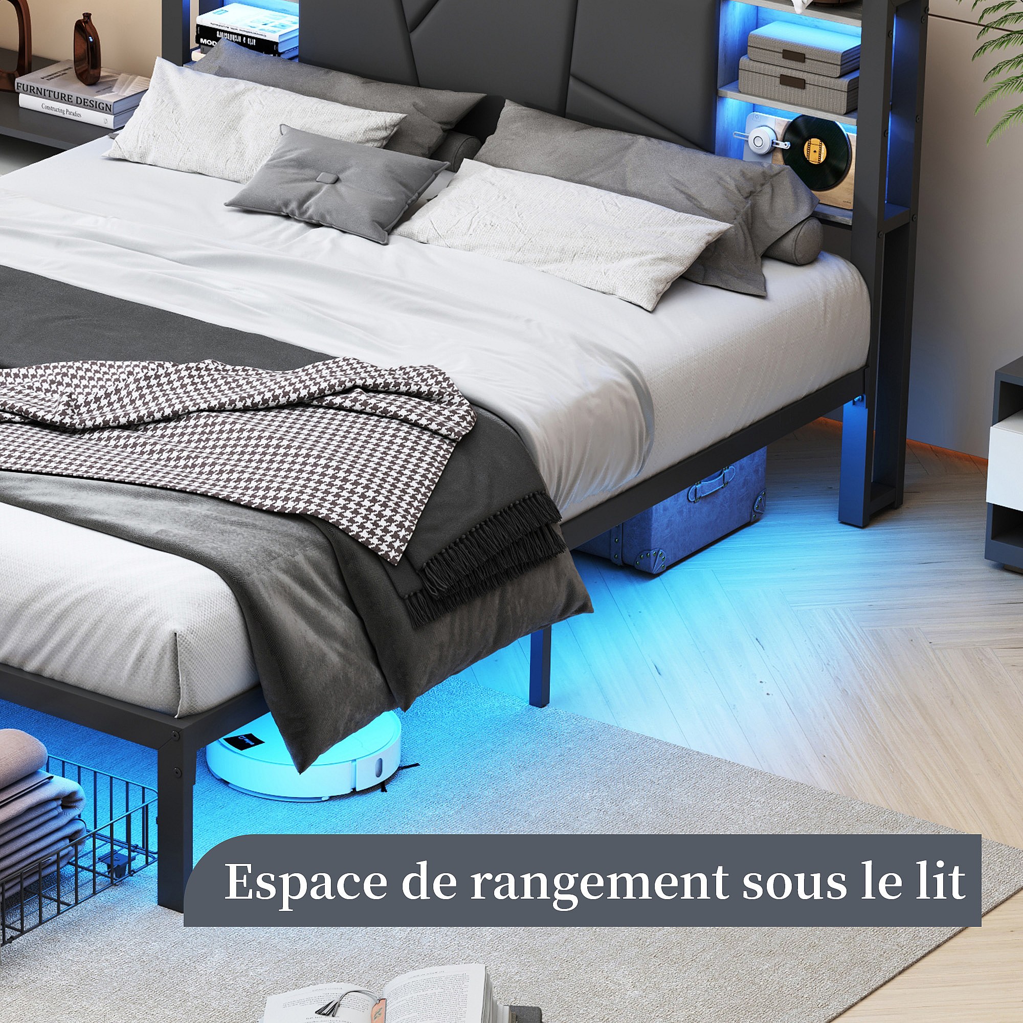 Cama doble de metal de 160 x 200 cm con LED y USB, con almacenaje, somier de láminas, color negro