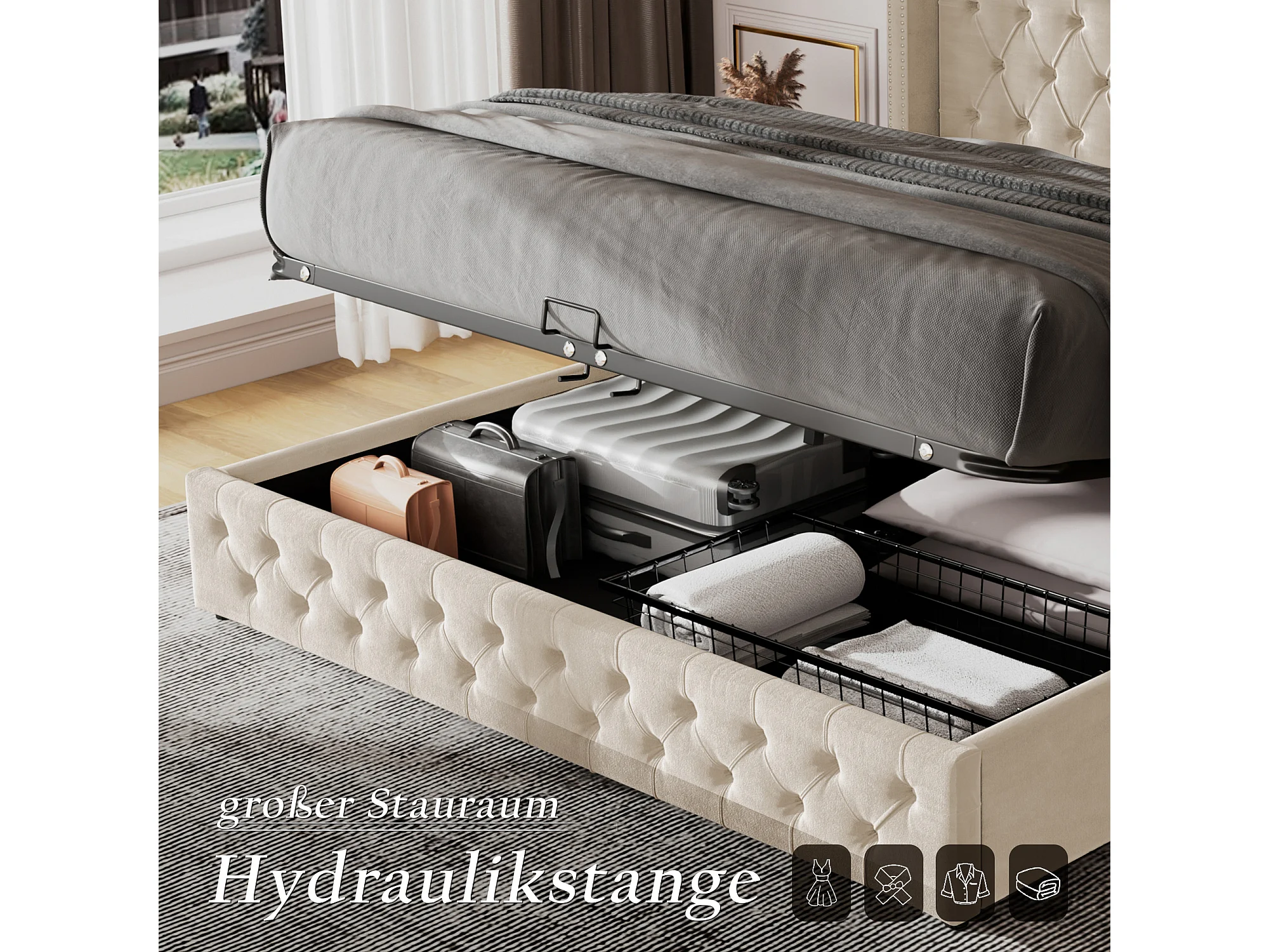 Cama doble hidráulica, con cabecero ajustable, tejido terciopelo, beige, 160x200 cm