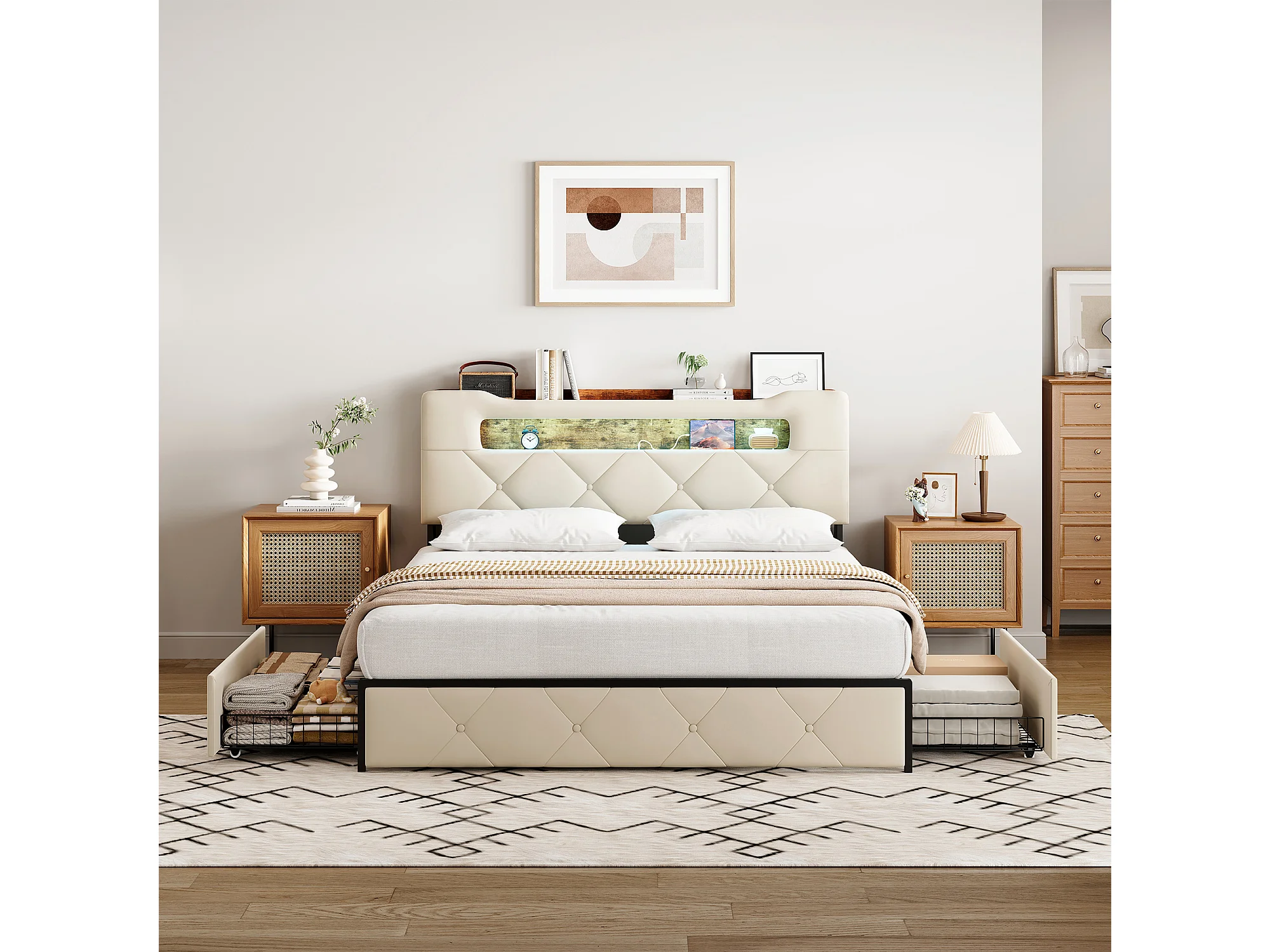 Cama doble tapizada, 140 x 190 cm, con iluminación LED, con 4 cajones, con somier de láminas, Beige