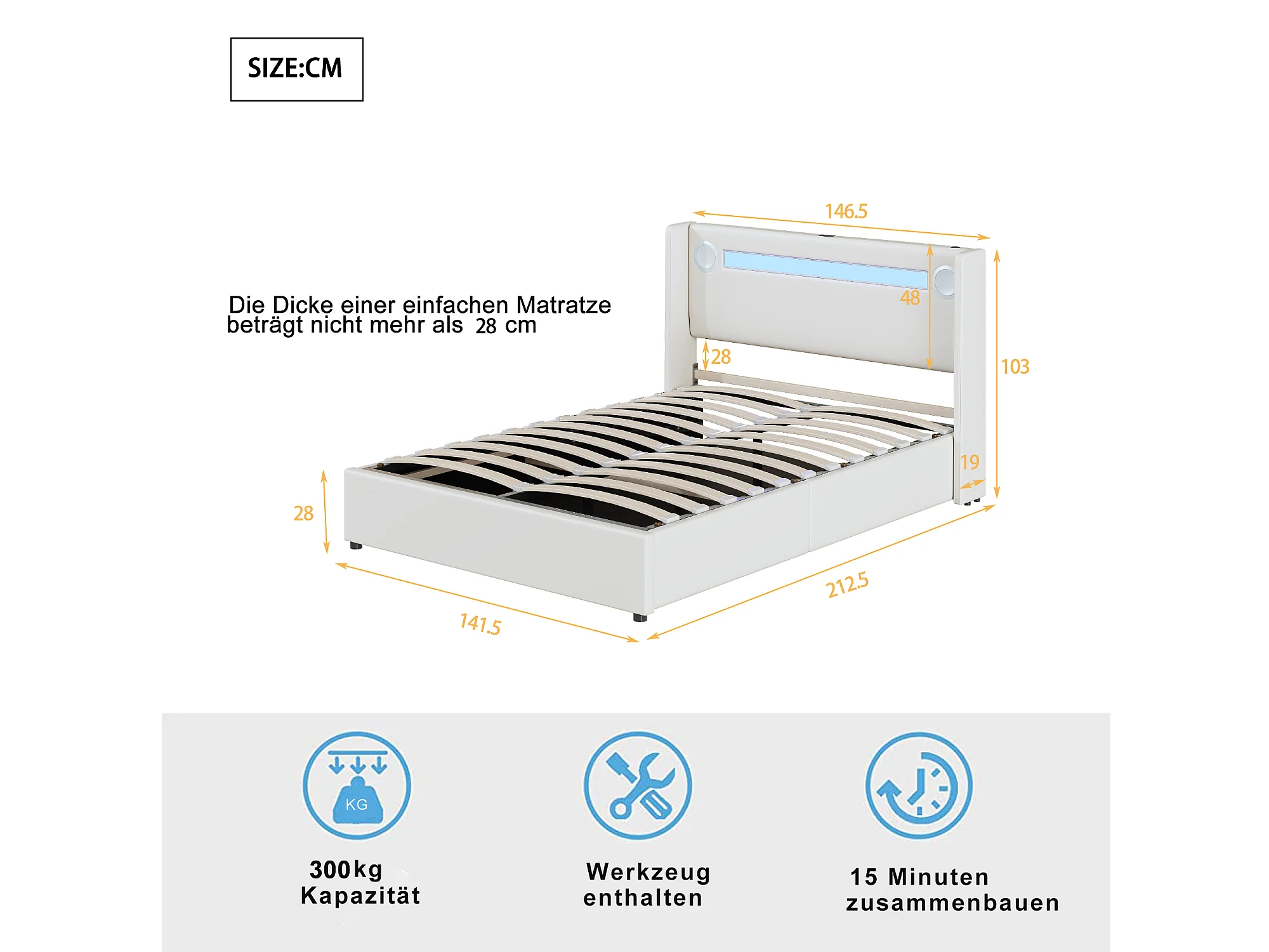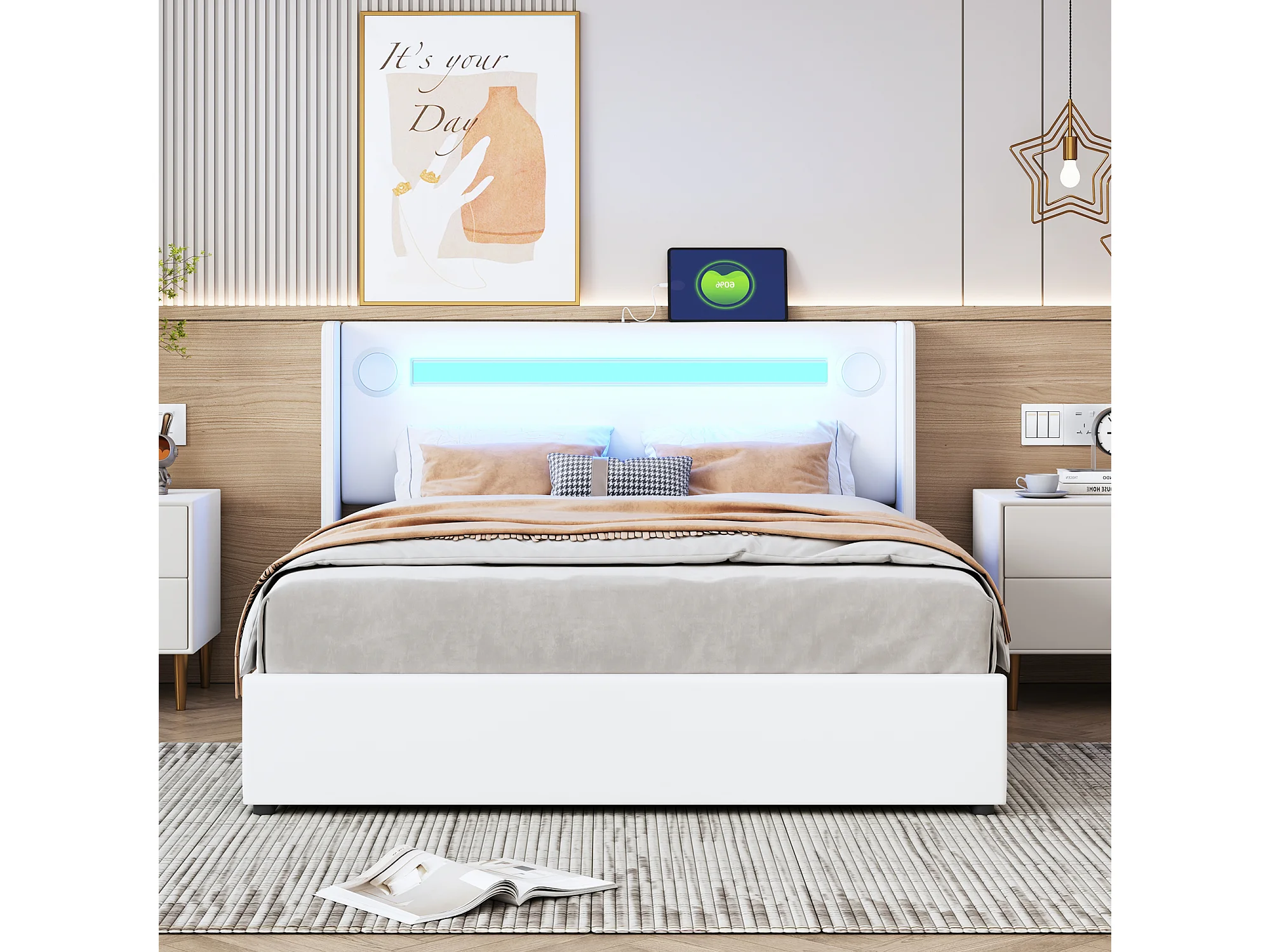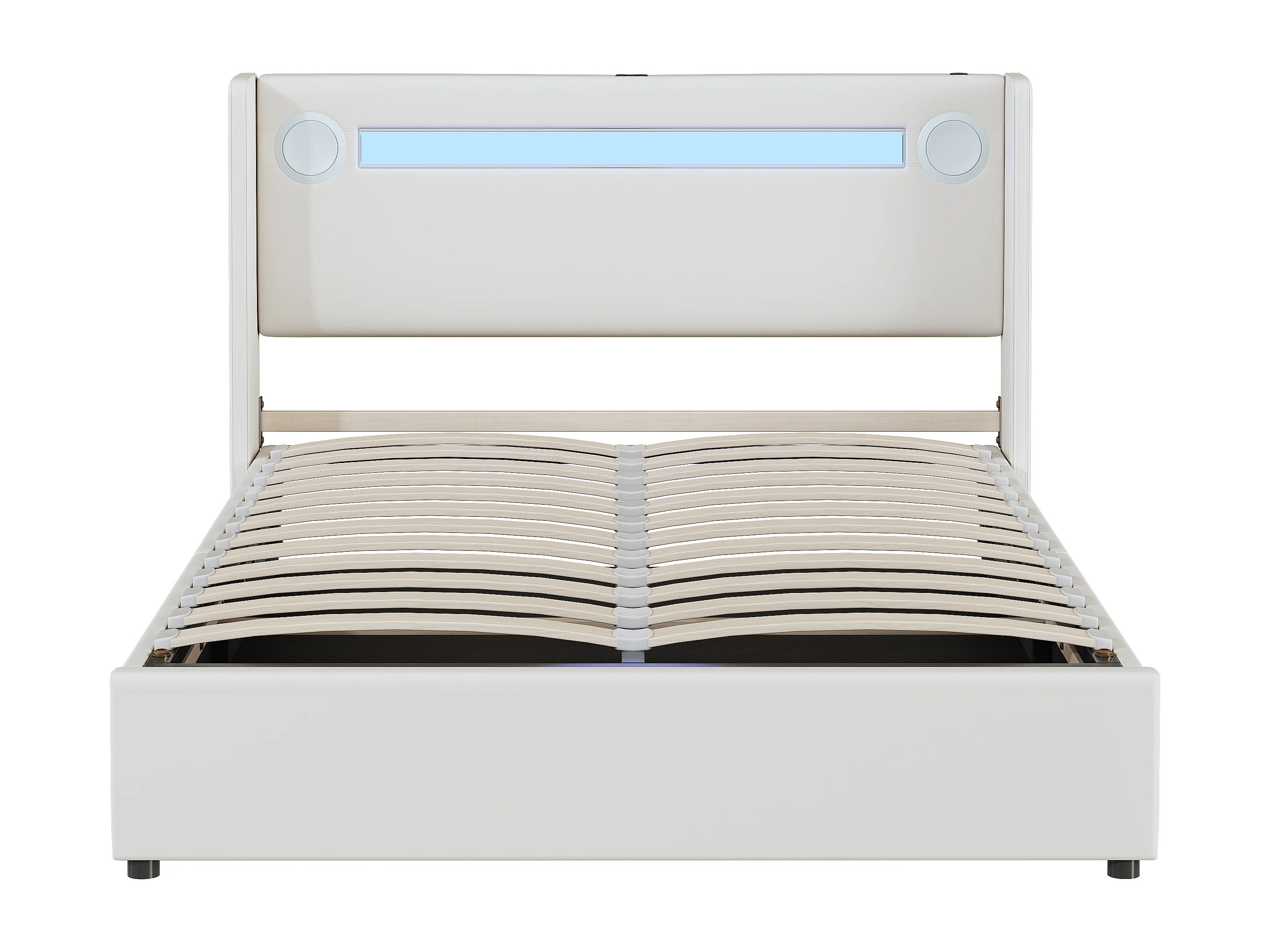 Cama doble tapizada 140x200 blanca, cama de almacenaje con lámpara LED, reproductor Bluetooth y carga USB, pu piel