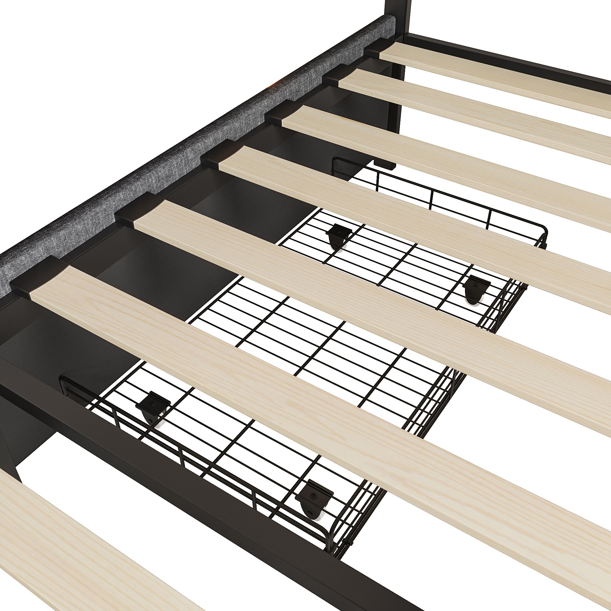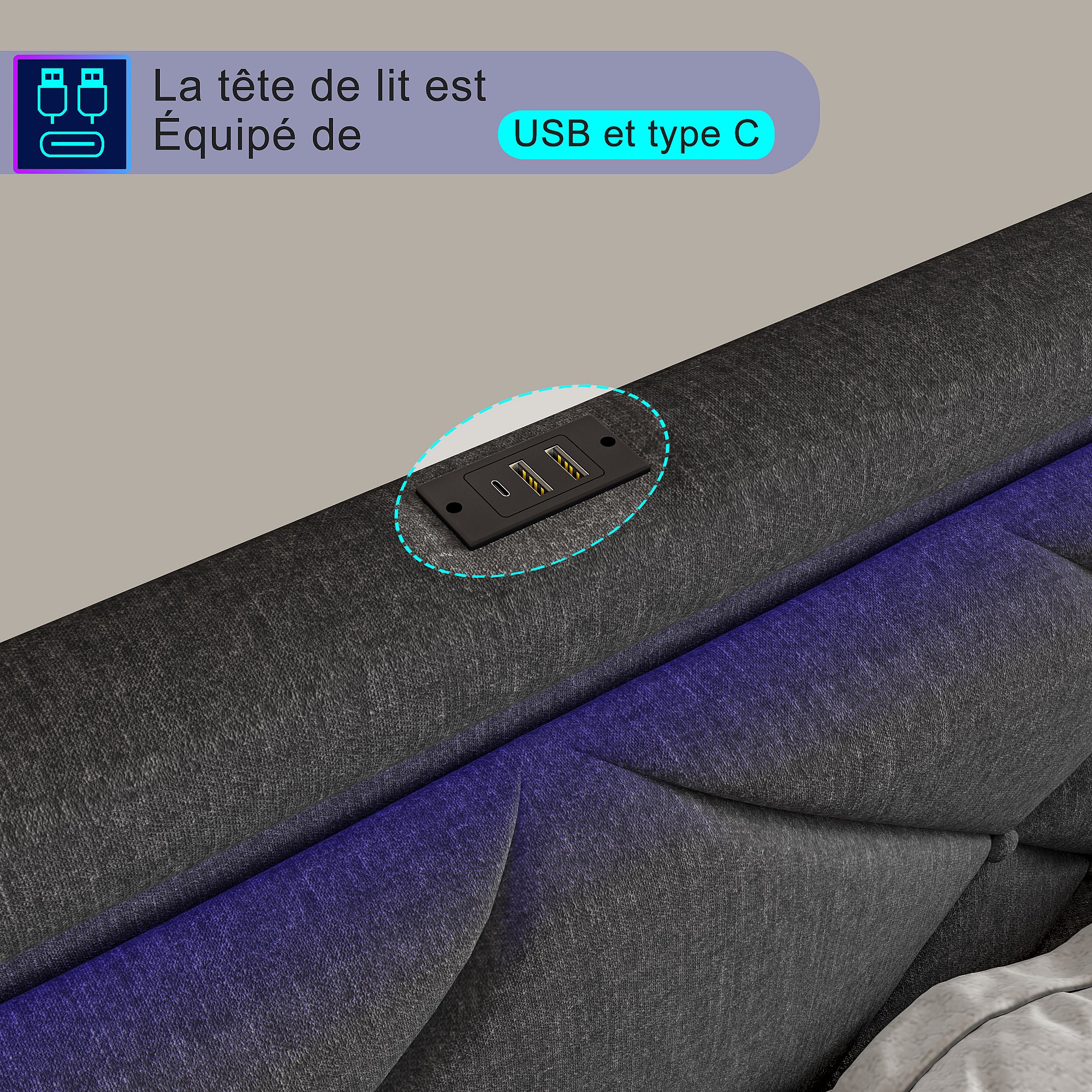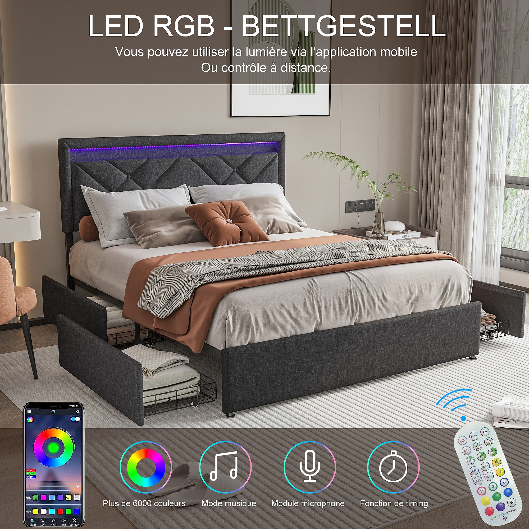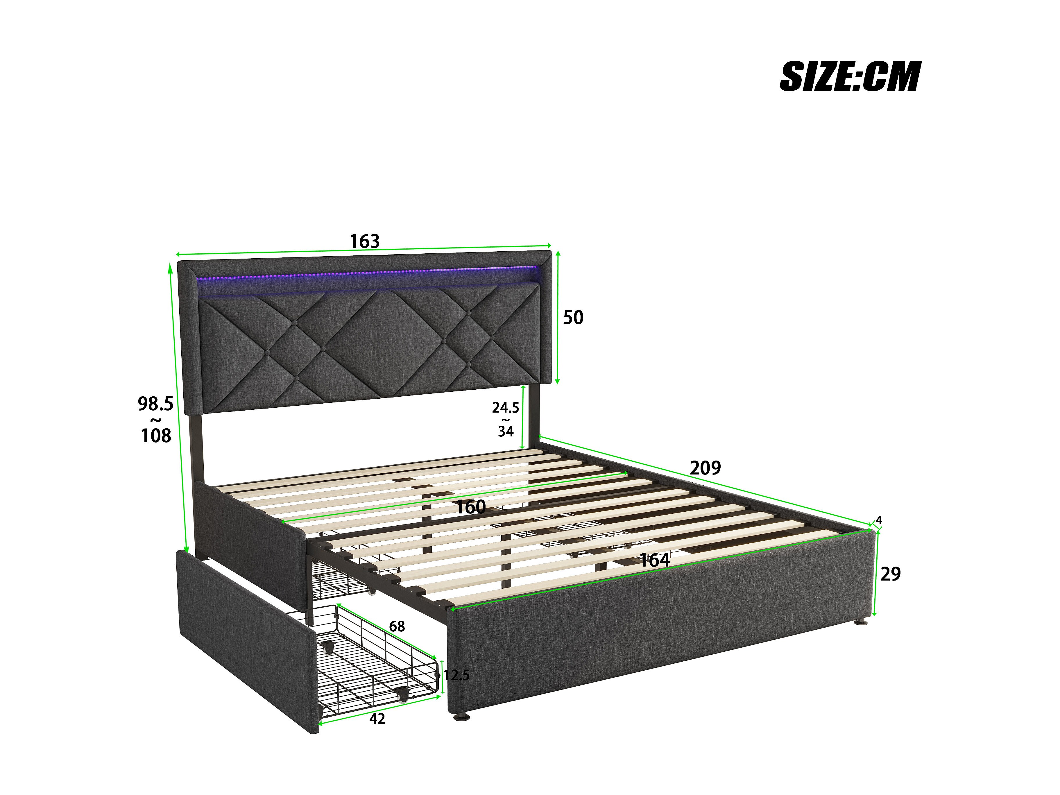 Cama doble tapizada, 160 x 200 cm, con LED y USB, espacio de almacenamiento con cajones, lino, gris