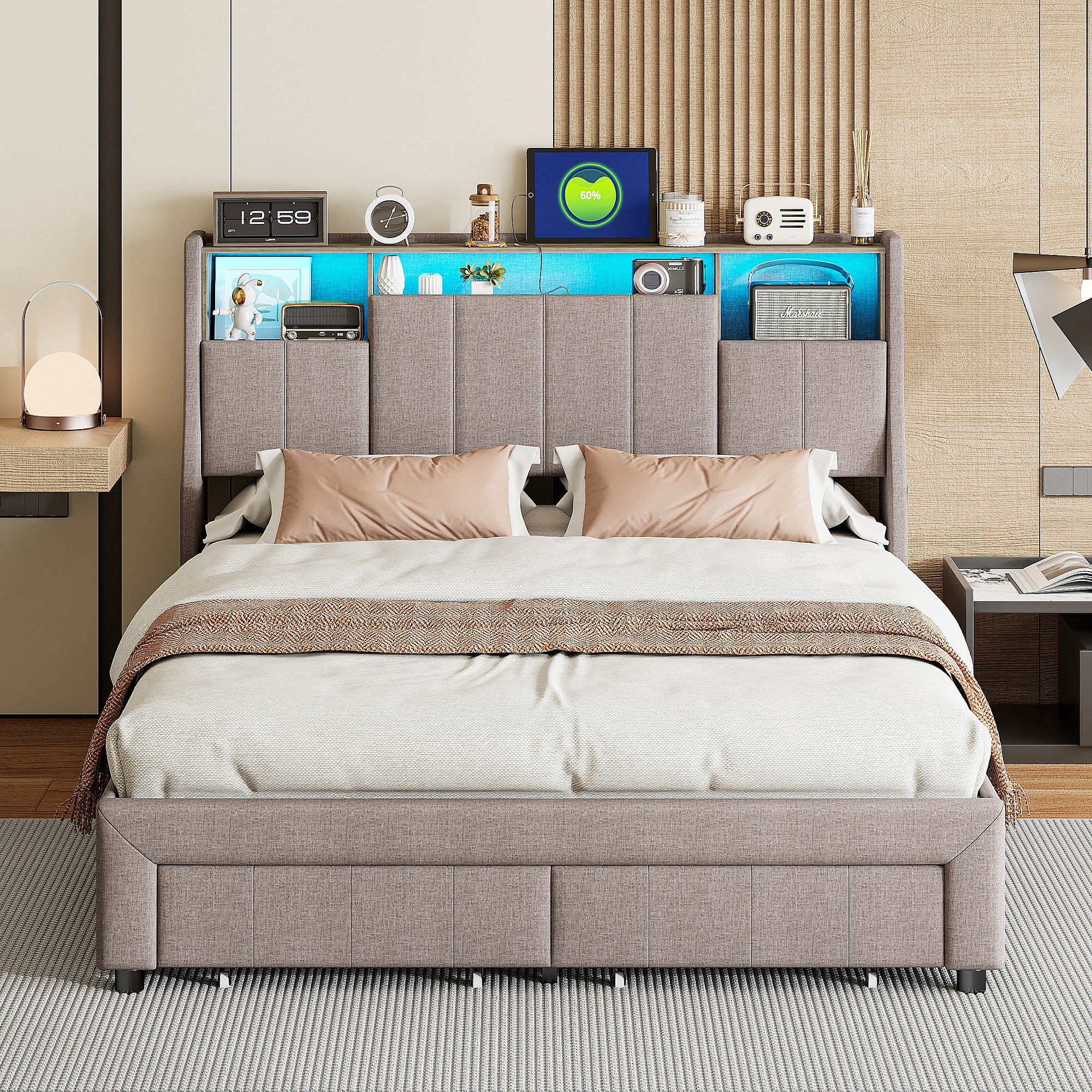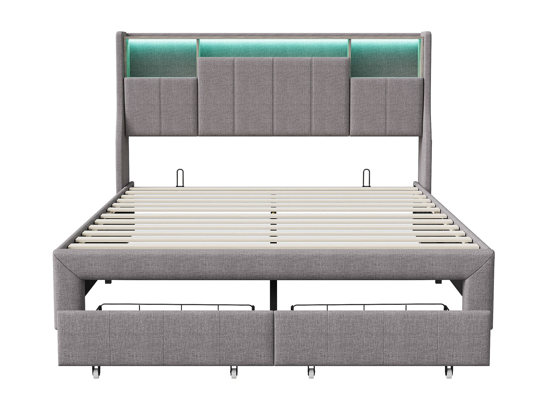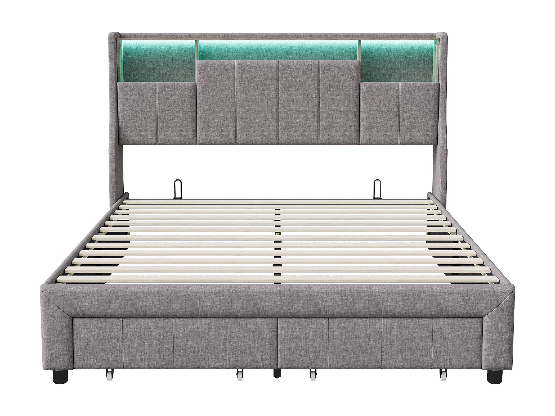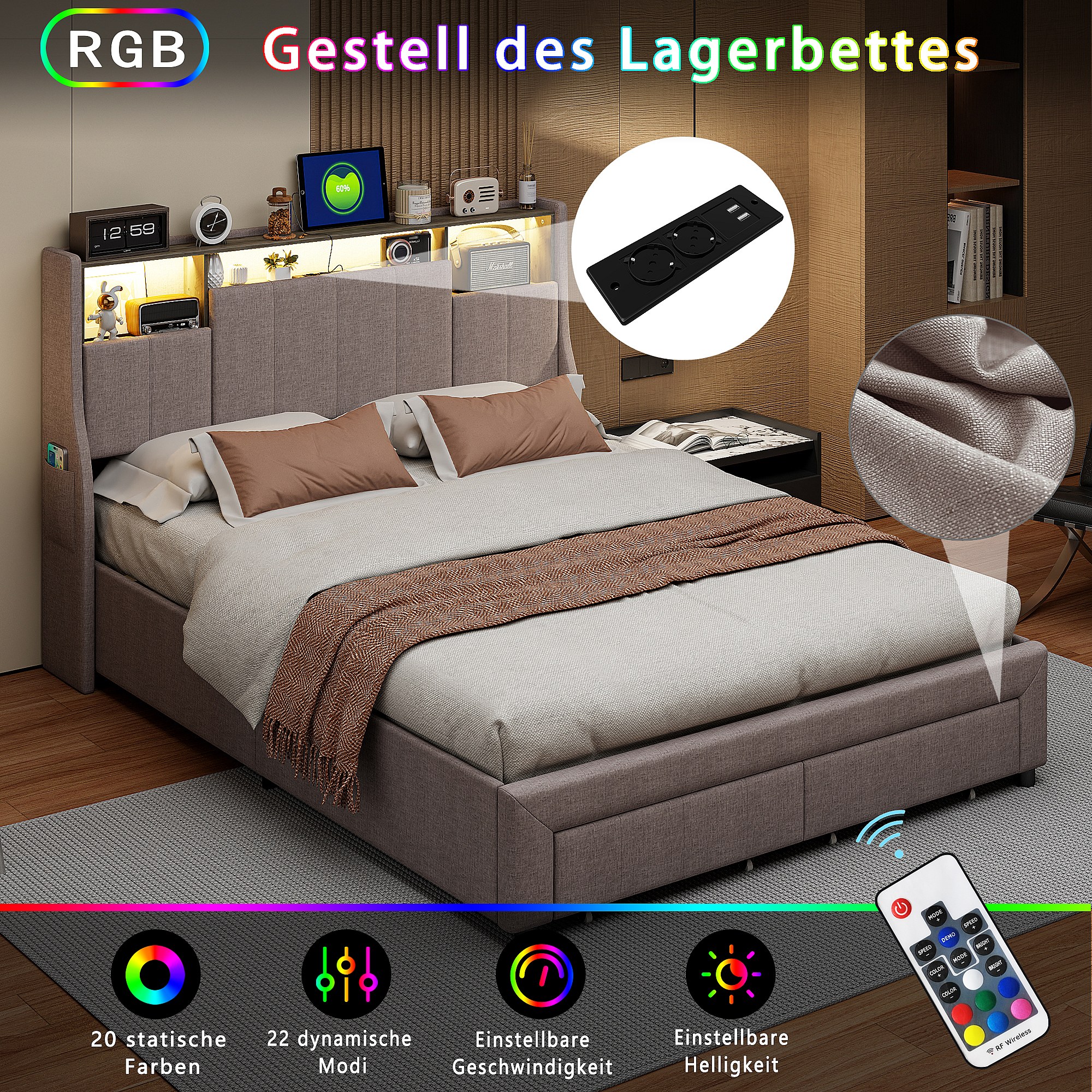 Cama doble tapizada, 160 x 200 cm, LED, con espacio de almacenamiento, con somier de láminas, Gris