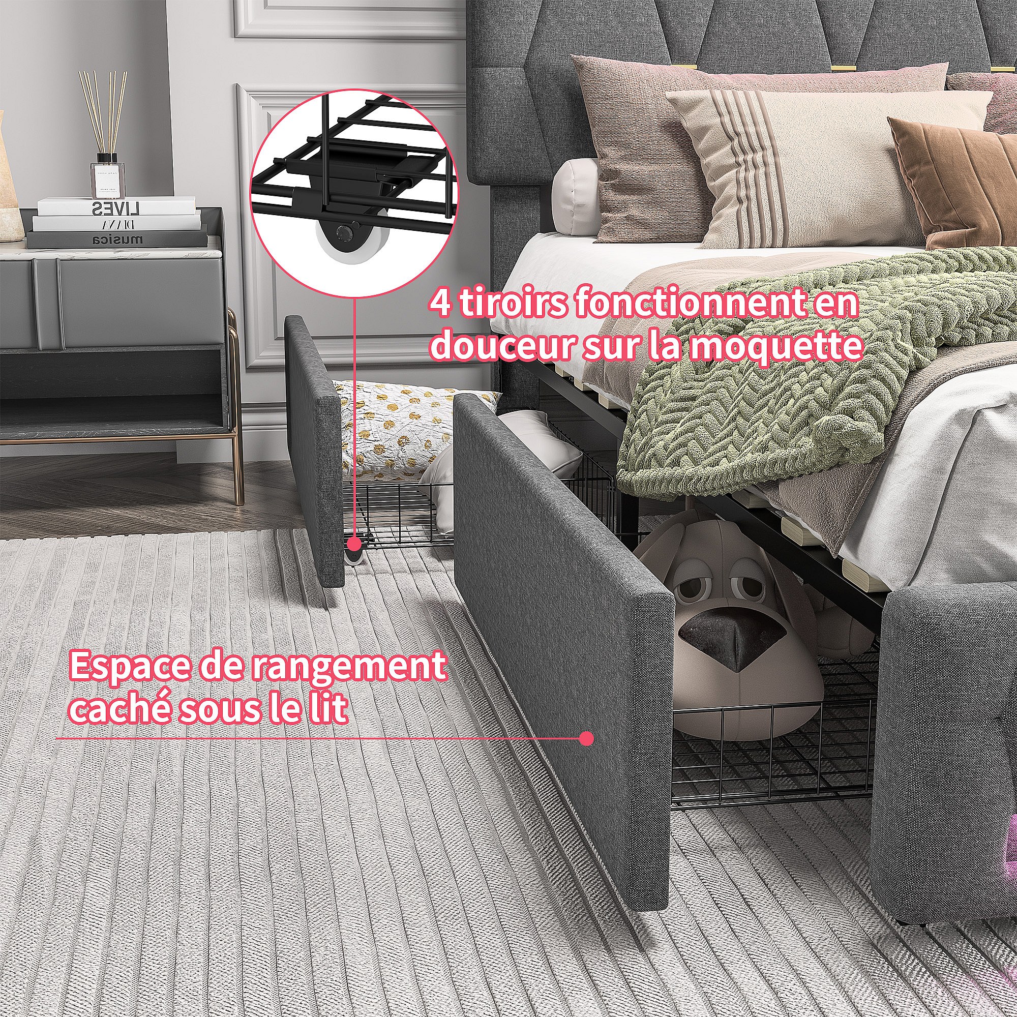Cama doble tapizada 160 x 200 cm, LED, con somier de láminas, almacenaje, Gris