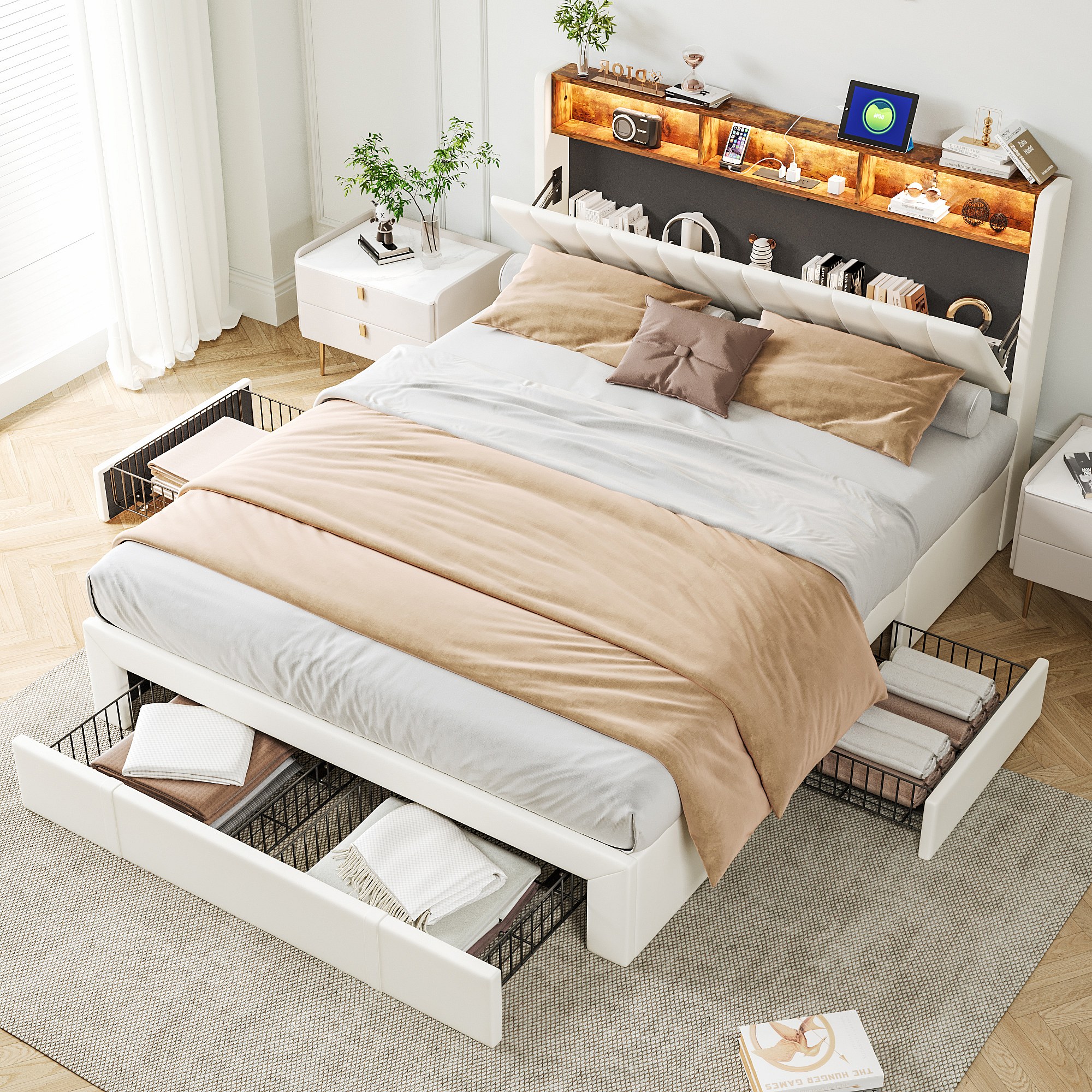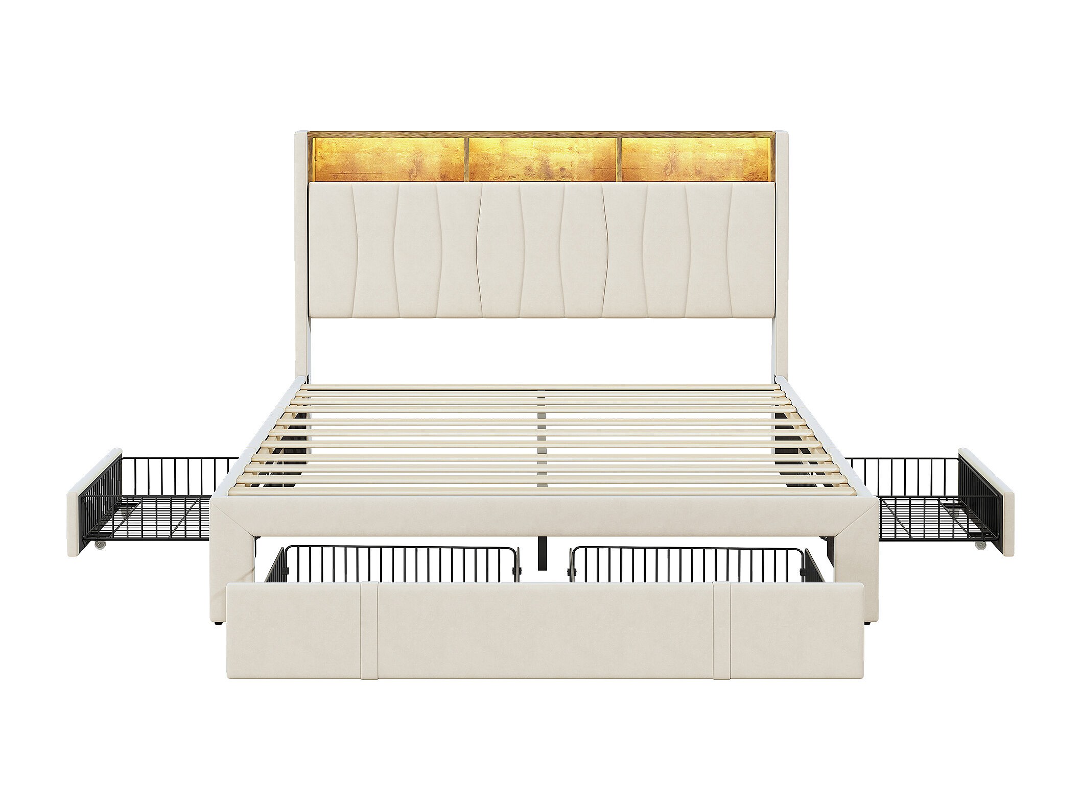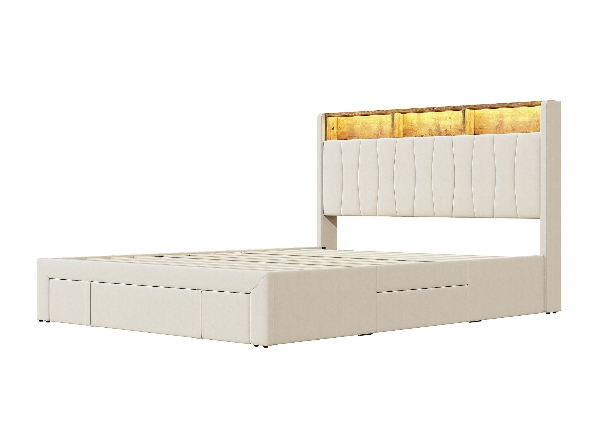 Cama doble tapizada 160x200 cm con LED y USB, con almacenaje, Terciopelo, Beige