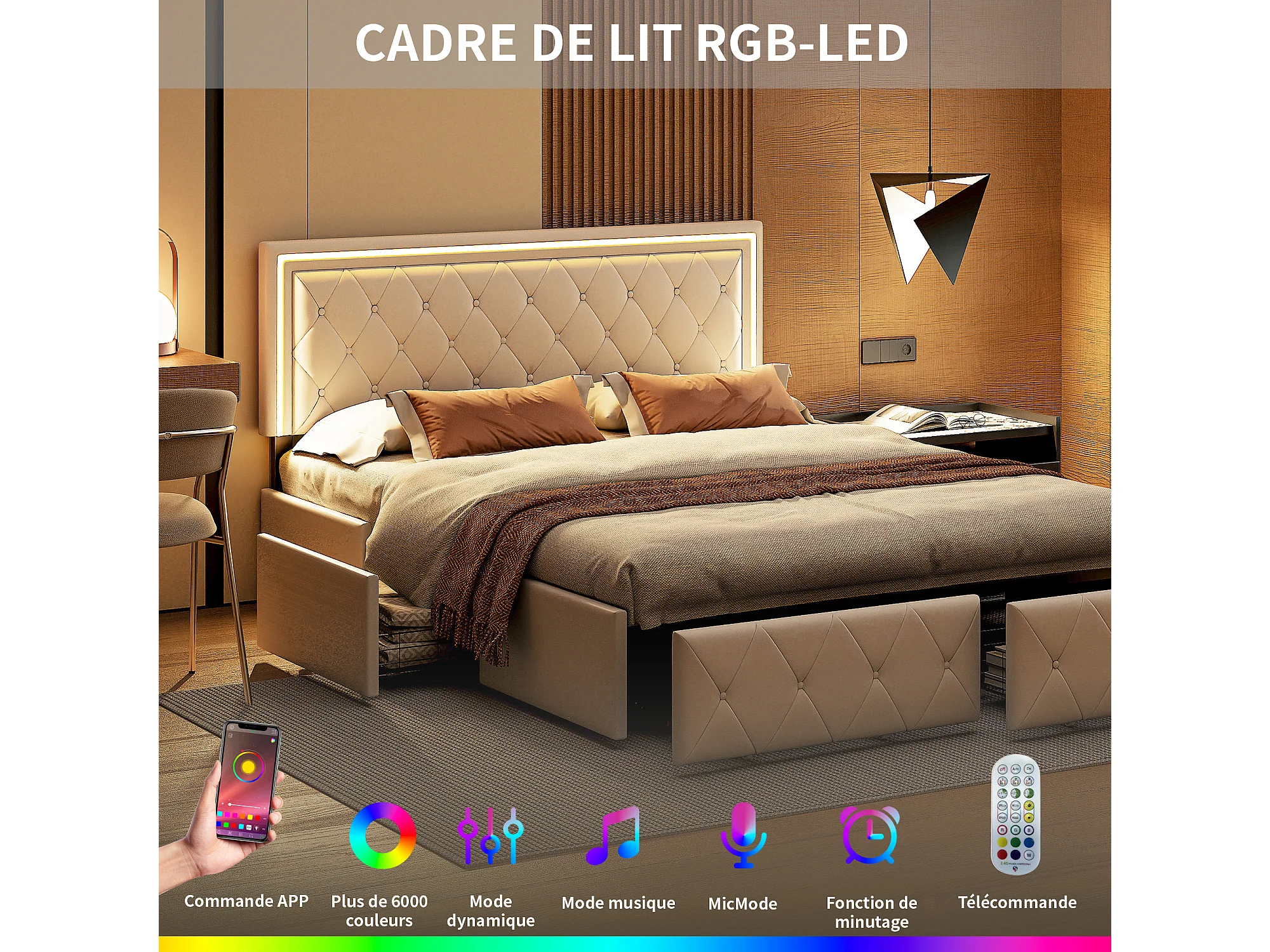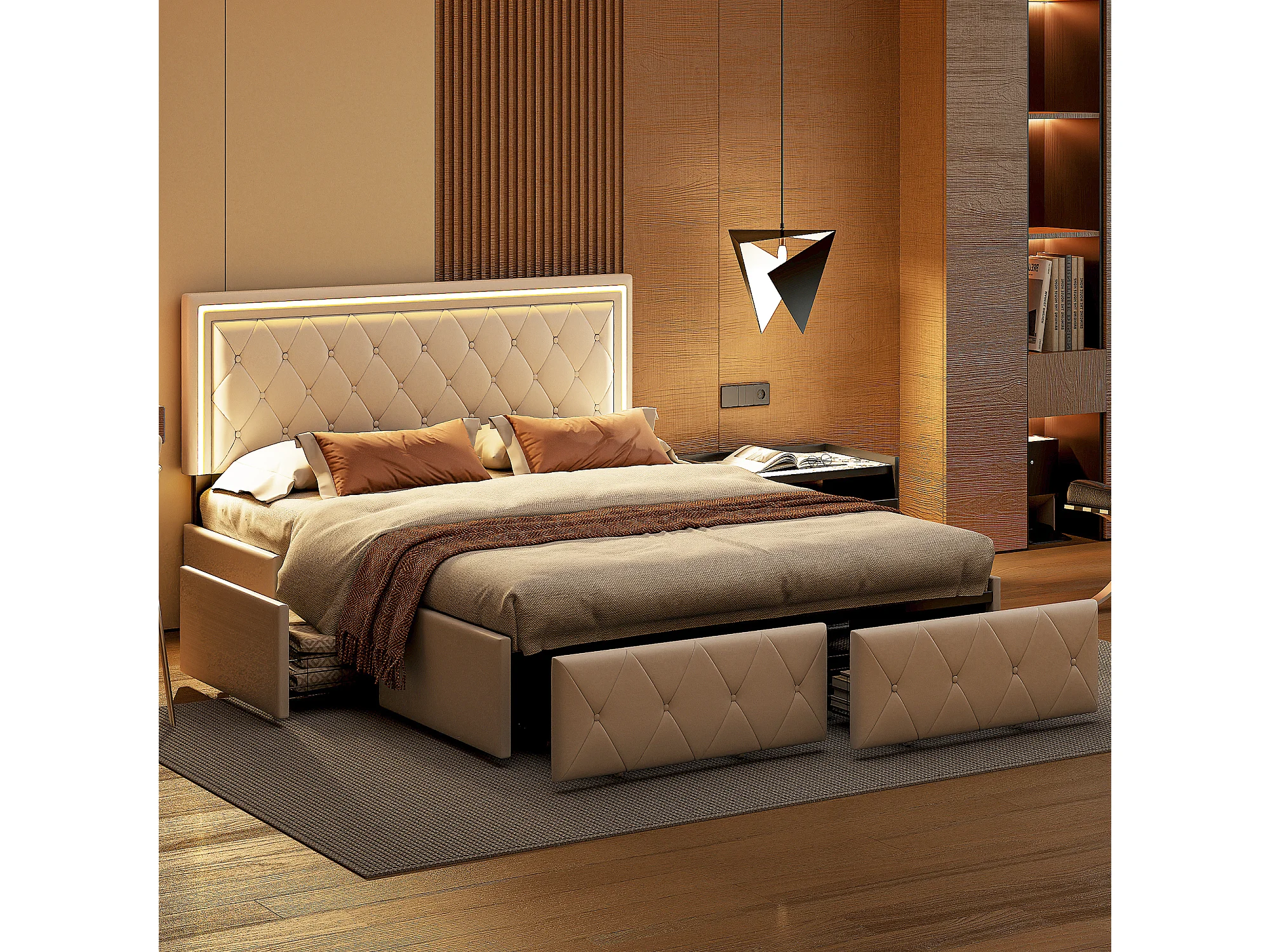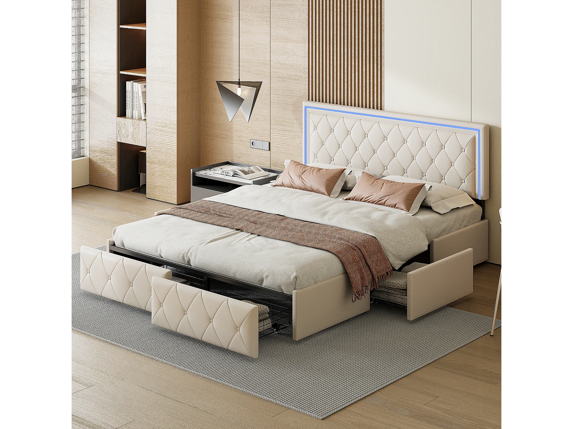 Cama de matrimonio tapizada 160x200 cm color blanco roto, con LED, cabecero regulable, 4 cajones y arcón, somier de láminas incluido