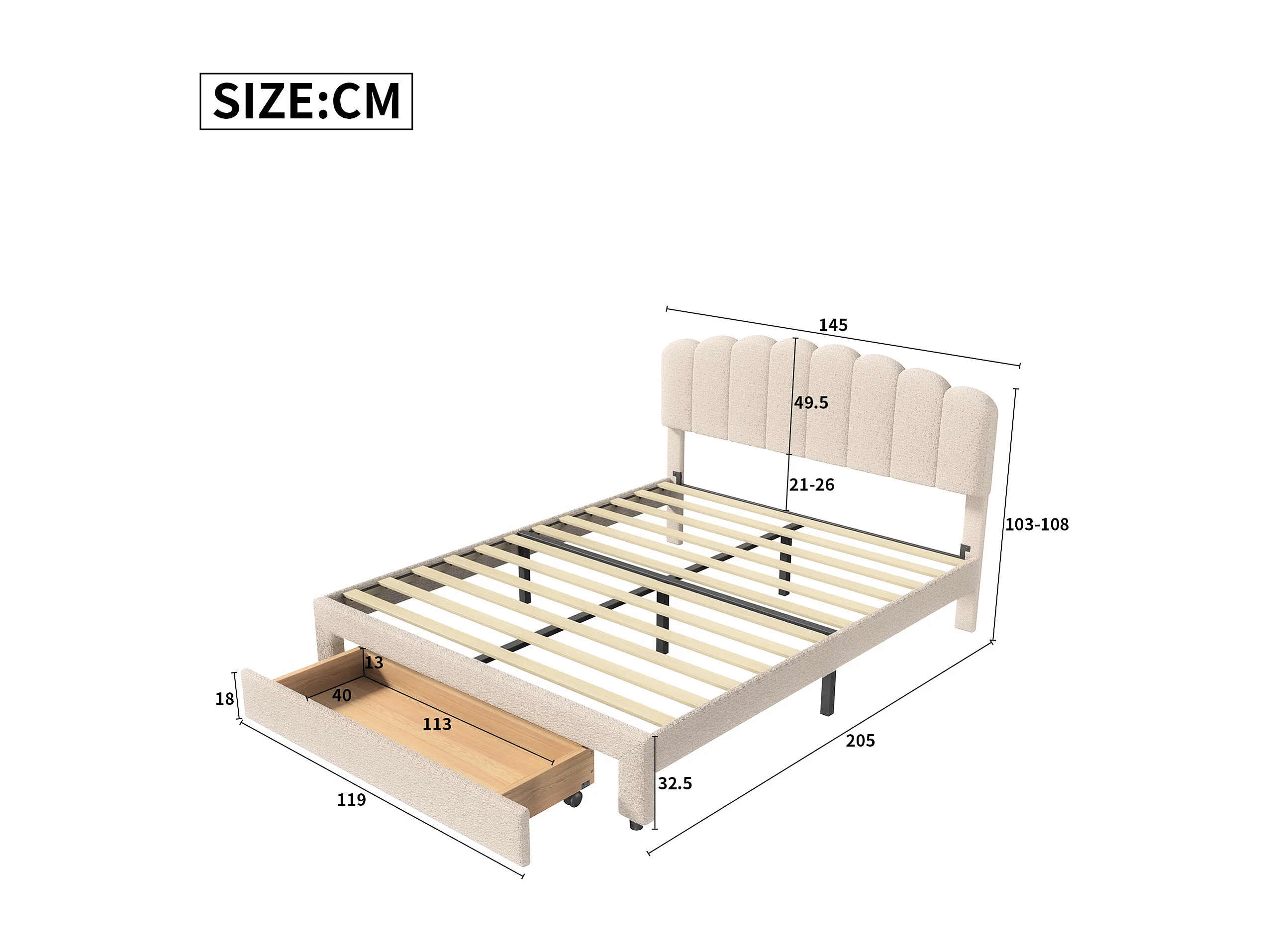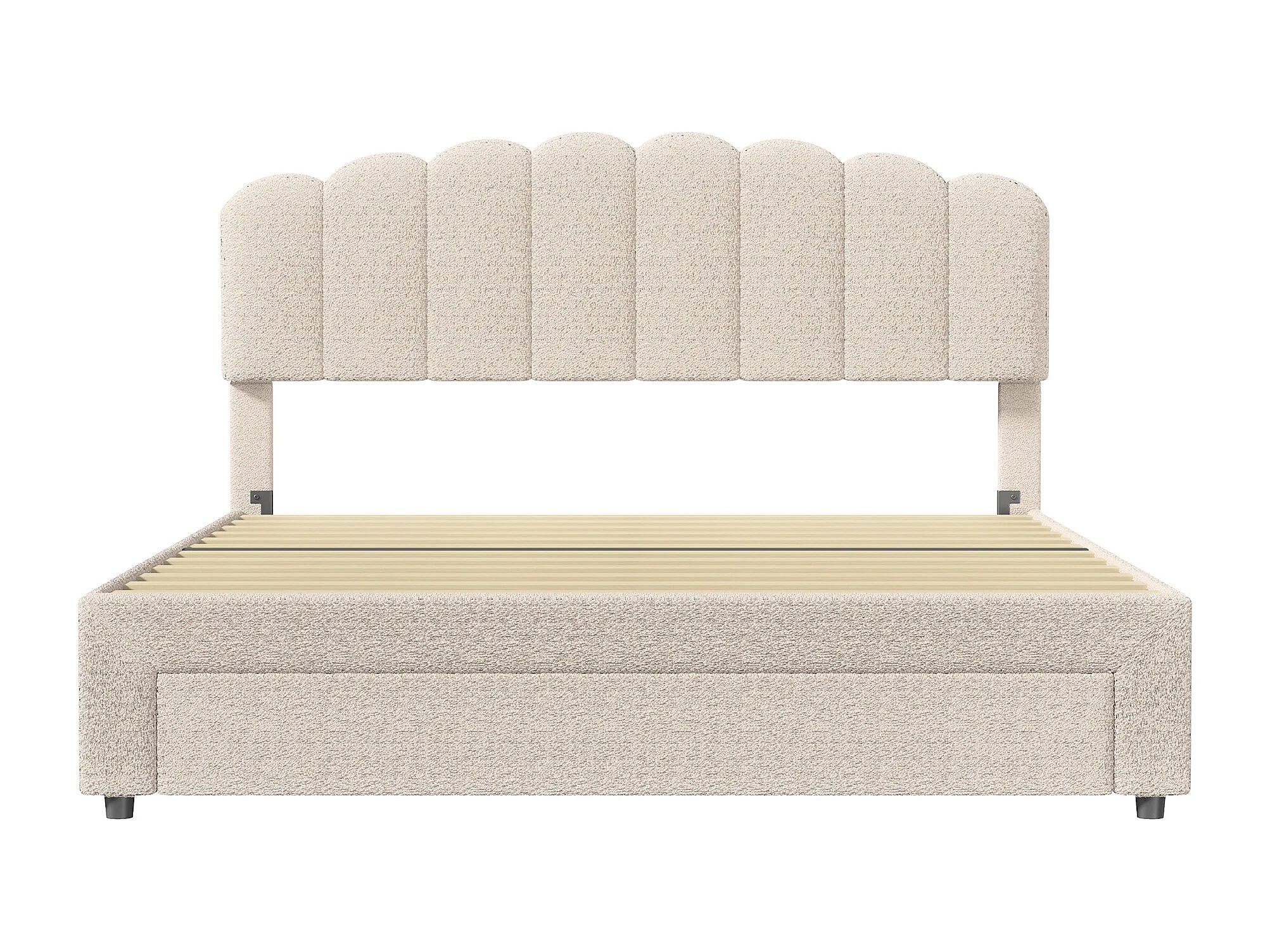 Cama doble tapizada de 140 x 200 cm con USB y amplios cajones - Tejido Sherpa - Beige