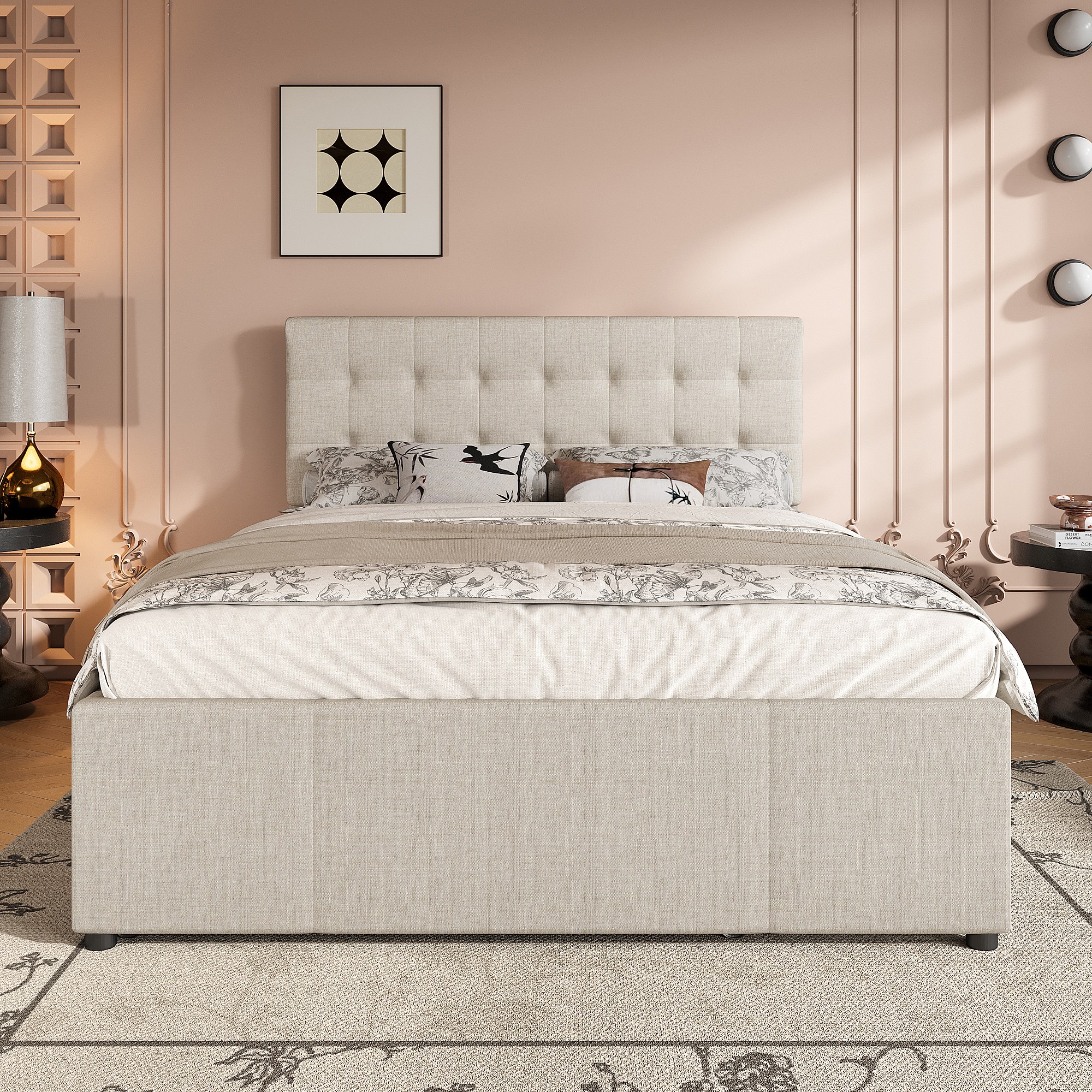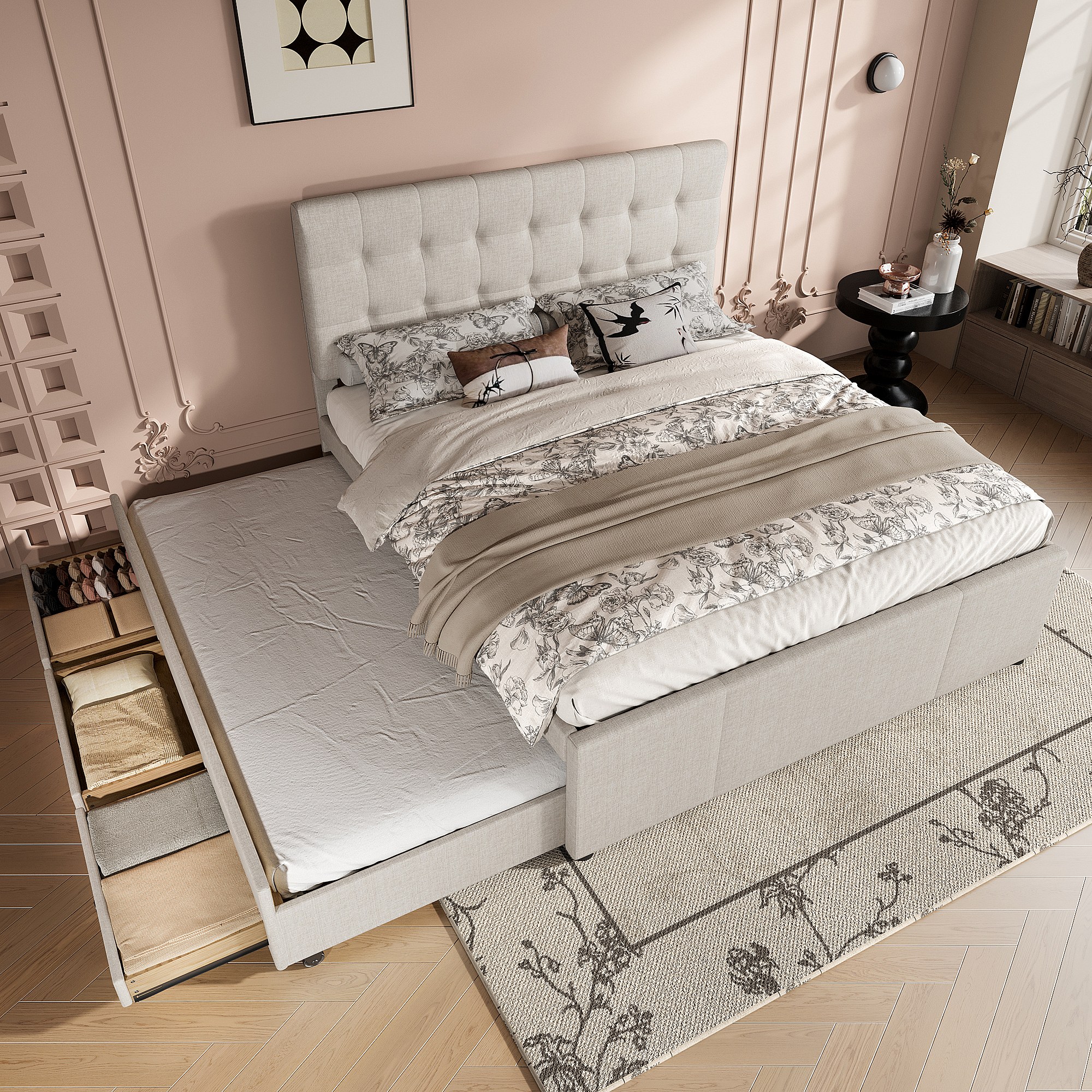 Cama familiar 140x200 cm en tela beige - 3 cajones, cama nido y cabecero regulable, sin colchón