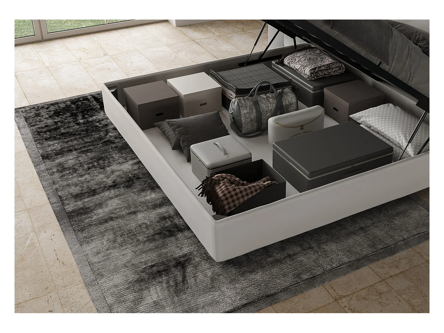 Cama Priya 190x190 con base y contenedor blanco