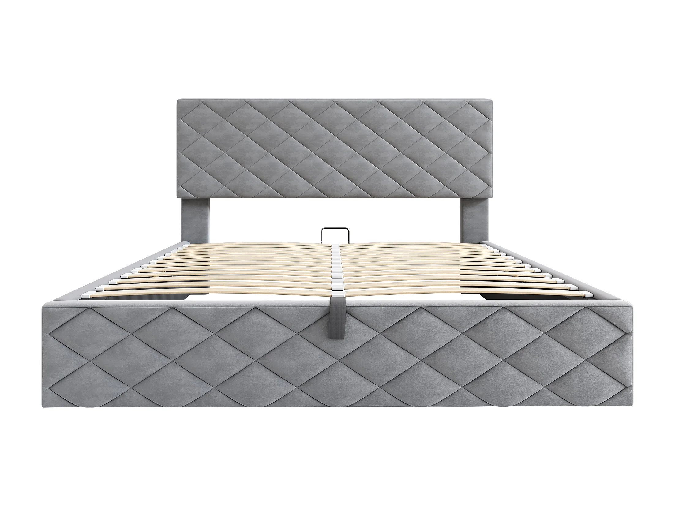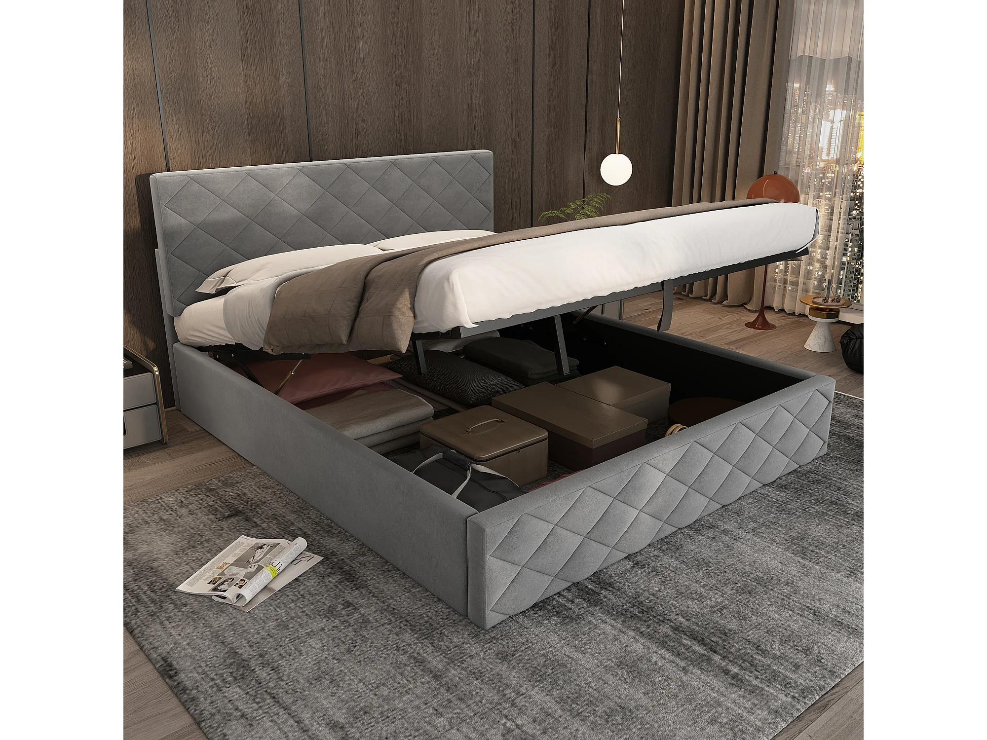 Cama hidráulica tapizada 140x200 cm terciopelo gris con base y canapé