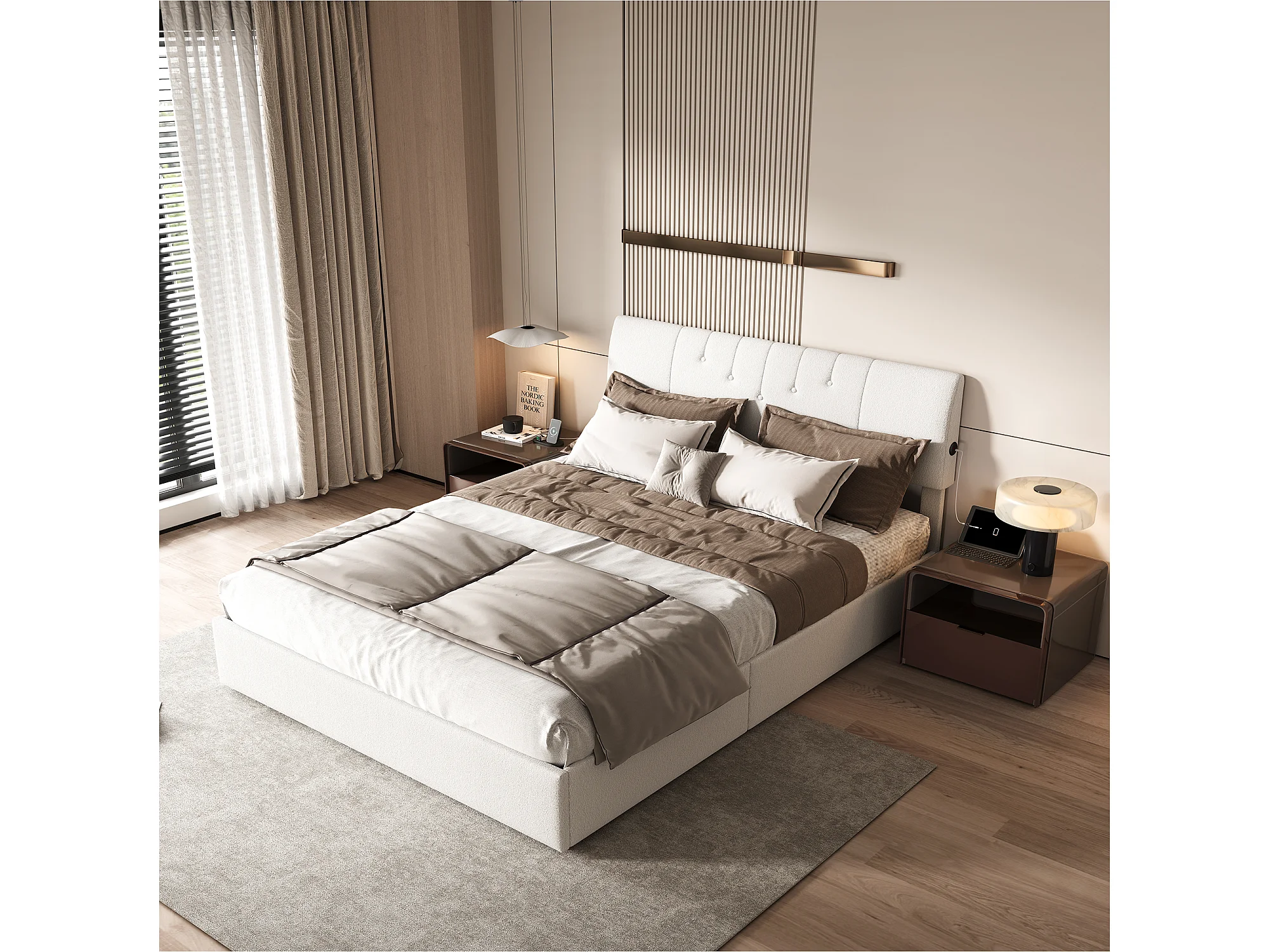 Cama blanca tapizada de 140 x 200 cm con elevación de gas, mesitas de noche dobles y lámparas de noche, tela de terciopelo, almacenaje moderno y cómodo.