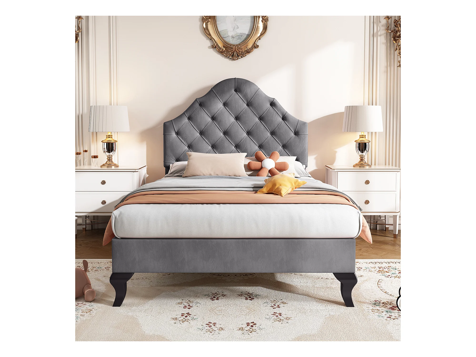 Cama individual 90x200cm, cama infantil con somier y cabecero y pie de cama en forma de nube, cama de terciopelo gris