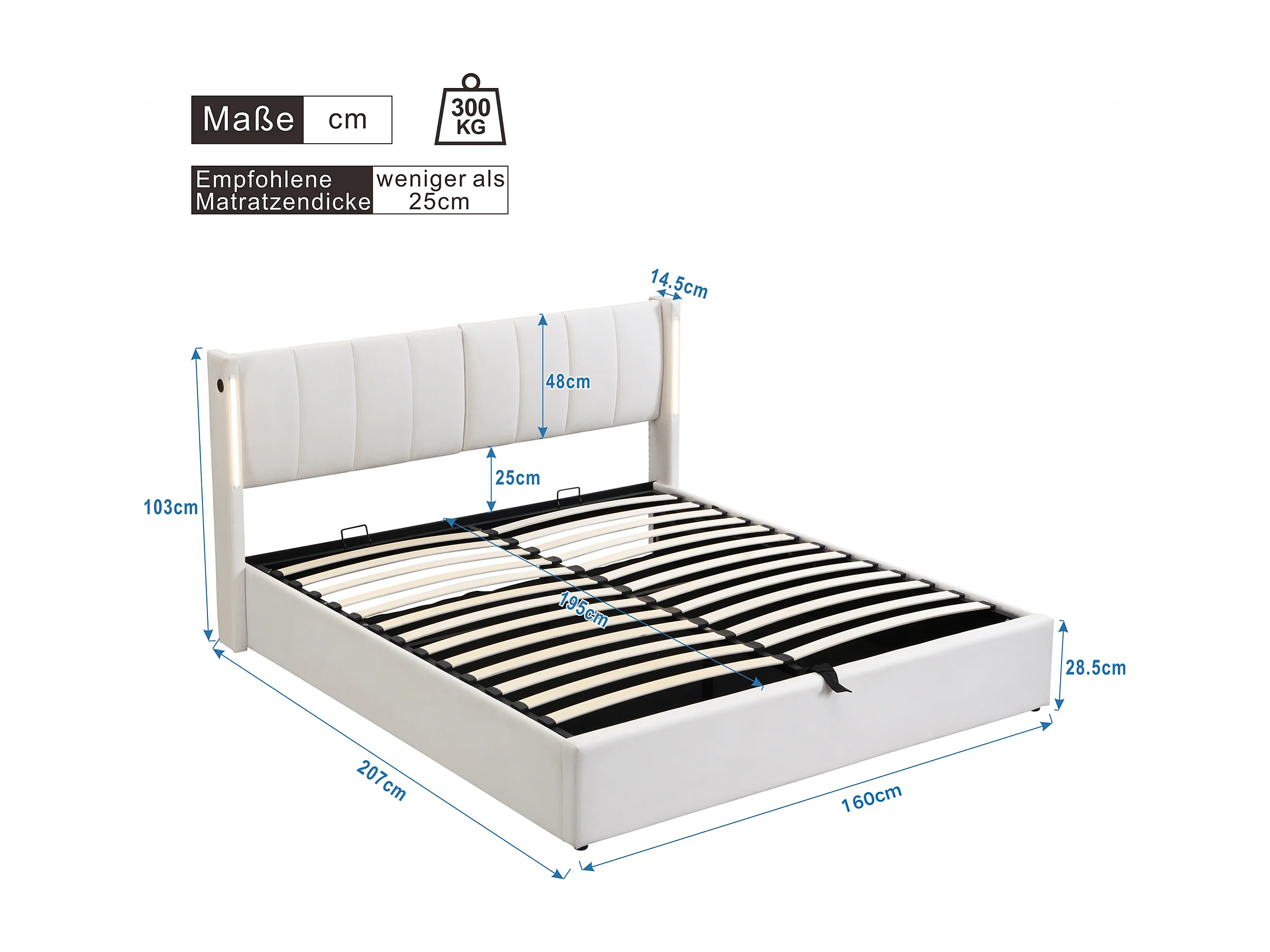Cama blanca con respaldo blando de 160 x 200 cm, puerto USB recargable en la cama con iluminación LED y almacenamiento, cabecero ajustable
