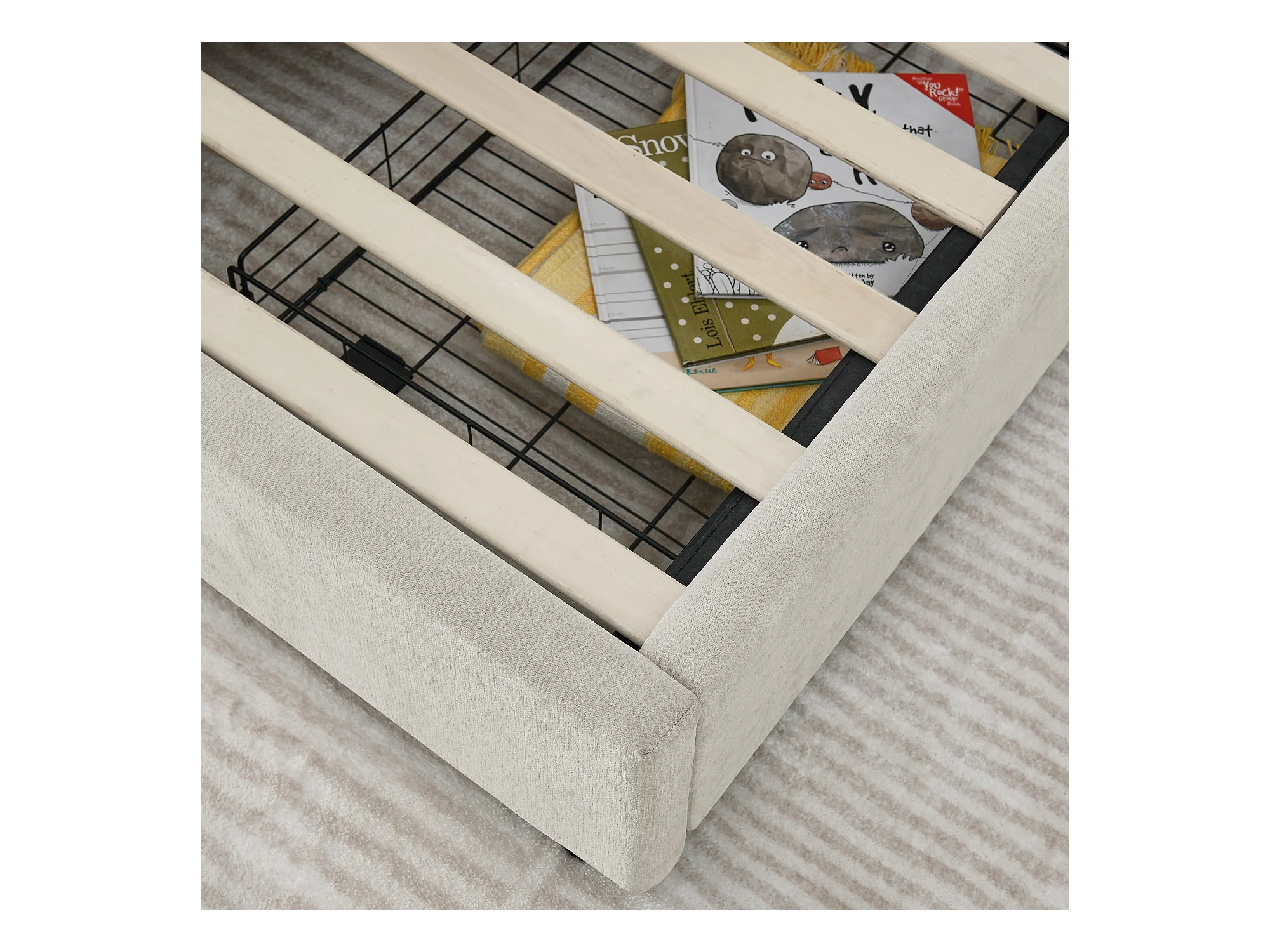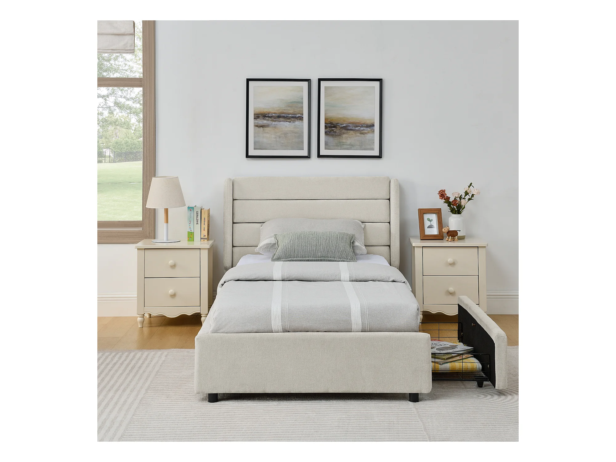 Cama individual de 90 x 200 cm con 2 cajones, tejido chenilla beige, sin colchón