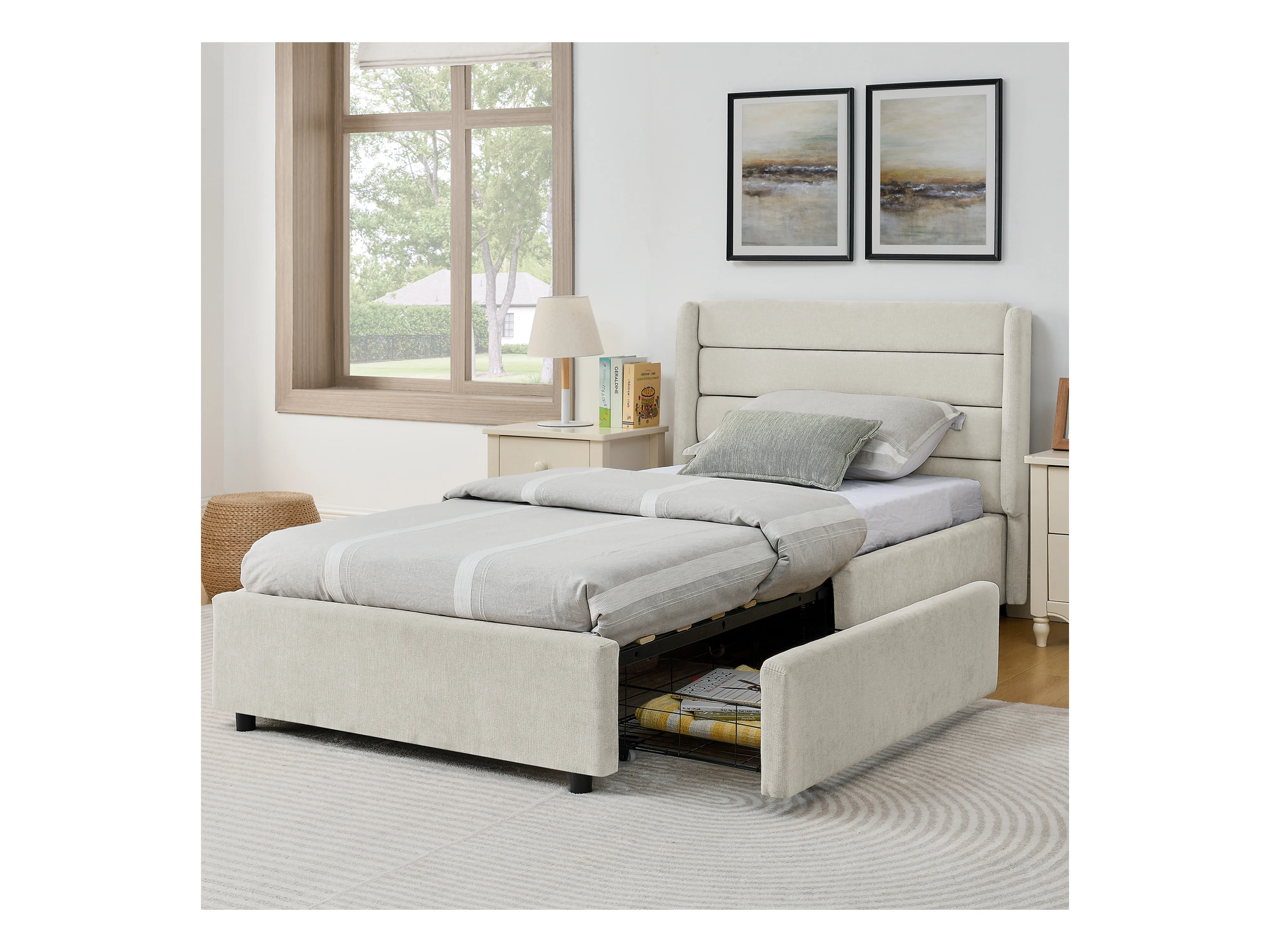 Cama familiar 90x200 cm en tela beige - Cama nido con 3 cajones, cabecero regulable, sin colchón