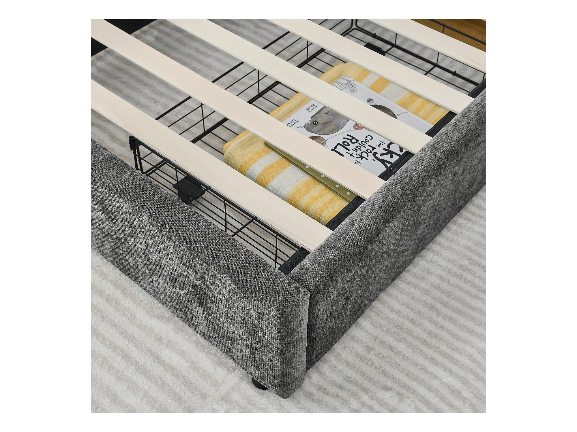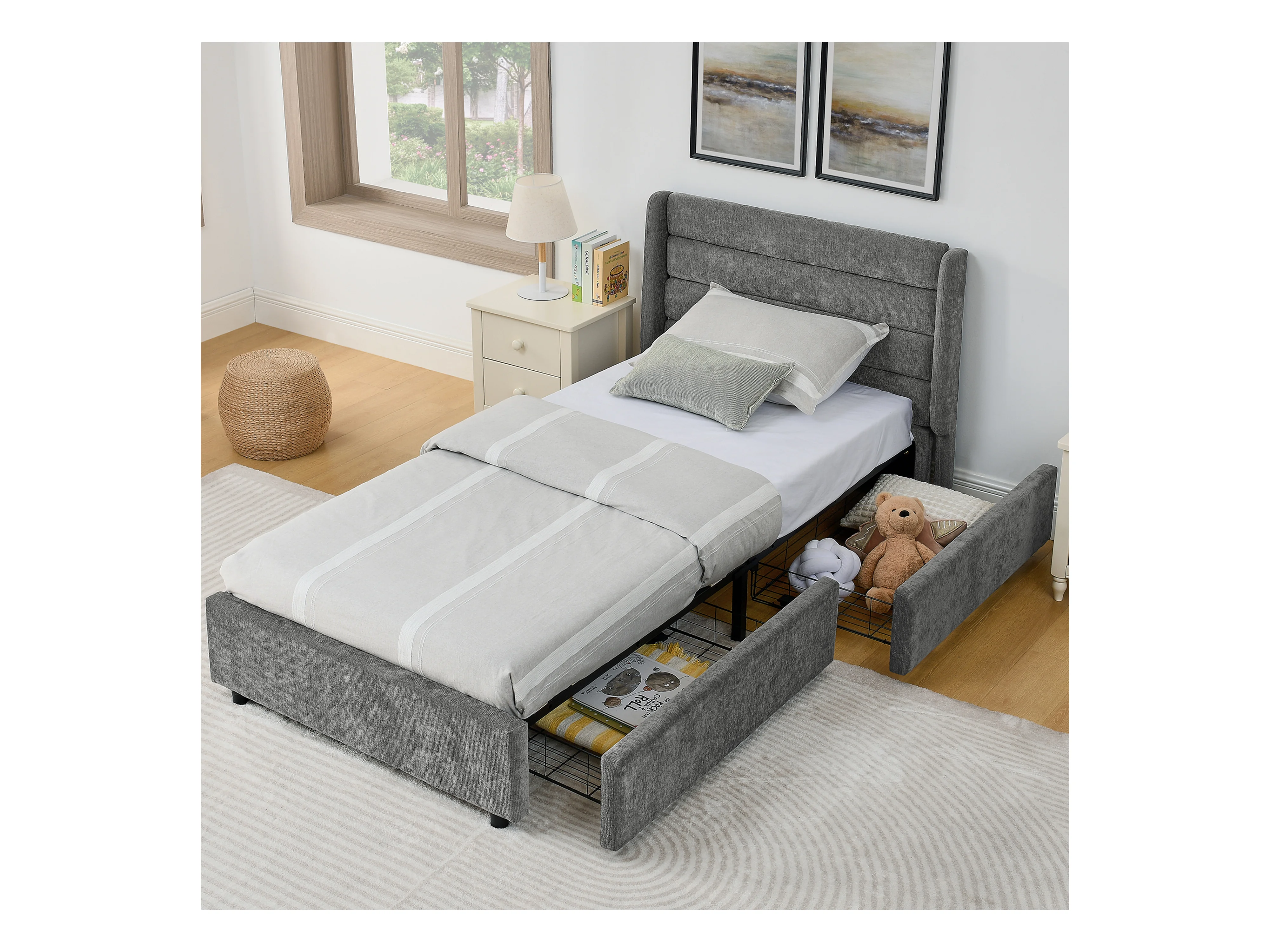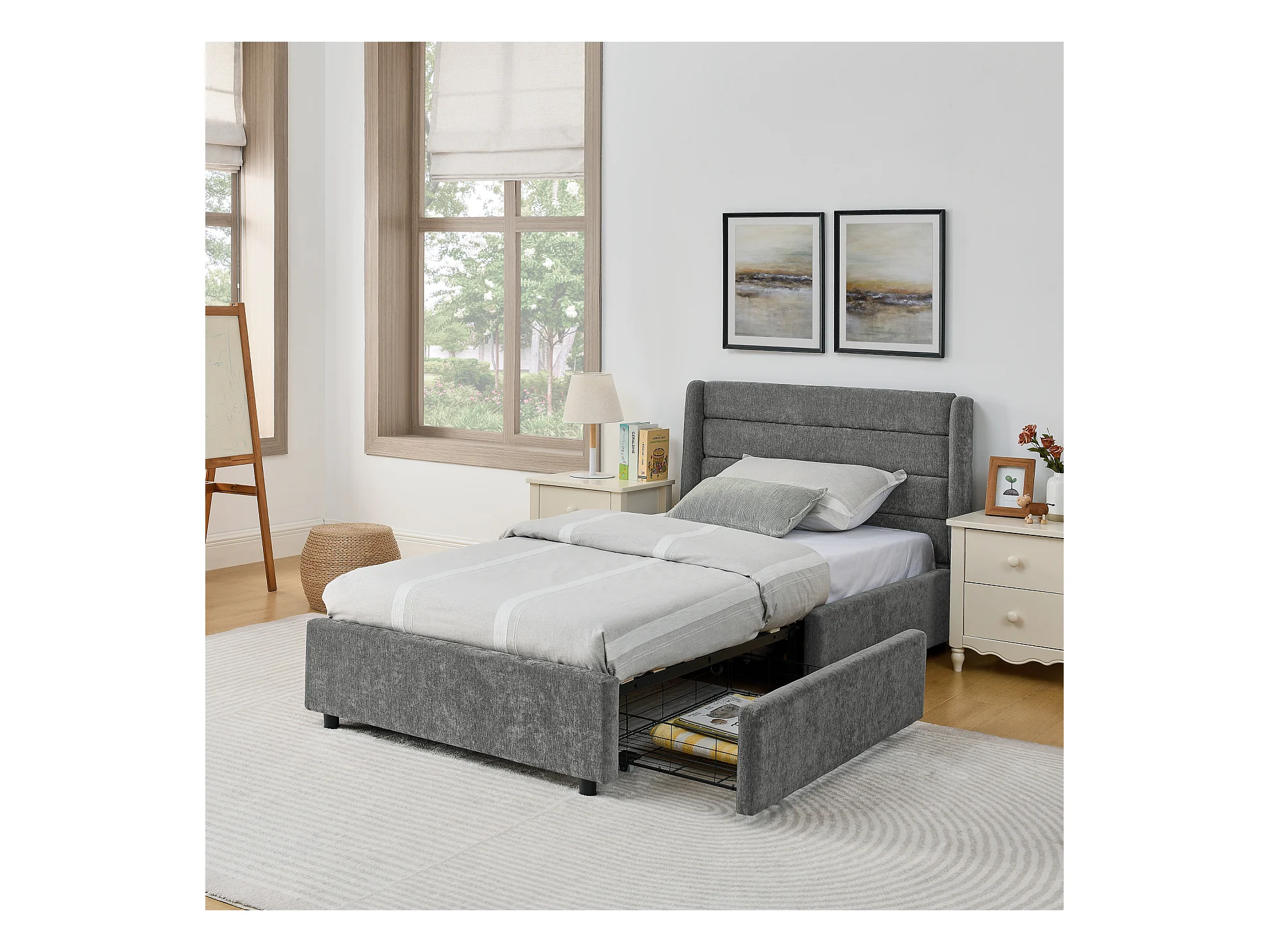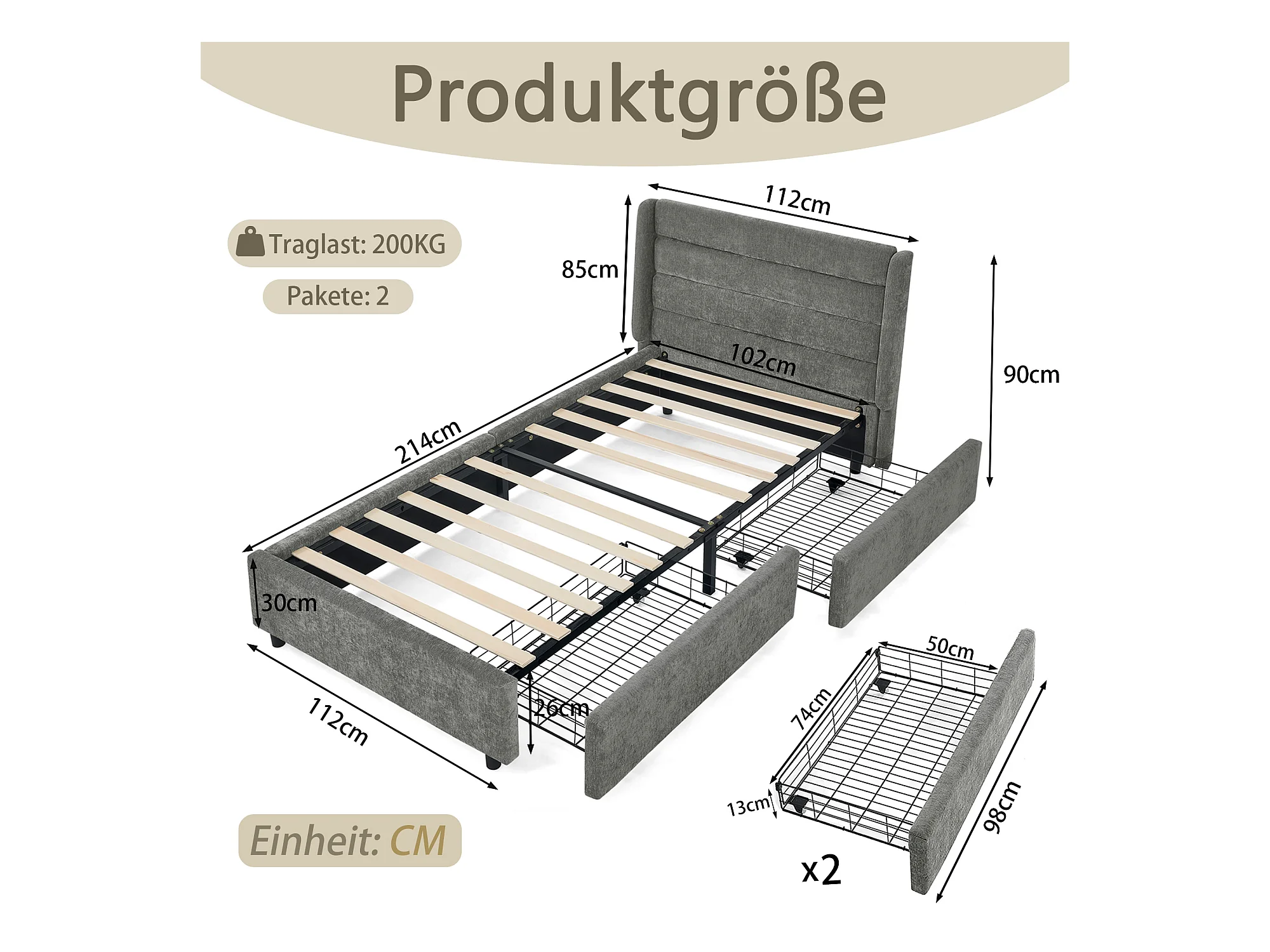 Cama individual de 90 x 200 cm con 2 cajones, tejido chenilla gris oscuro, sin colchón