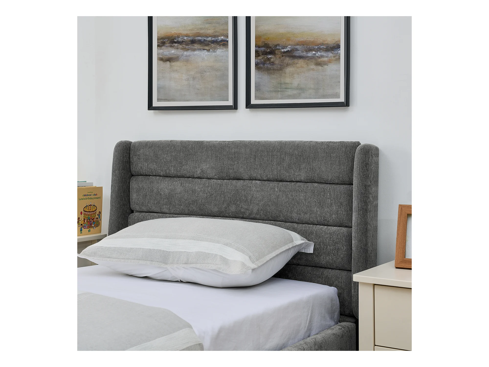Cama moderna tapizada - 90 x 200 cm - con LED + estación de carga + cabecero con almacenaje - lino - gris (con colchón)