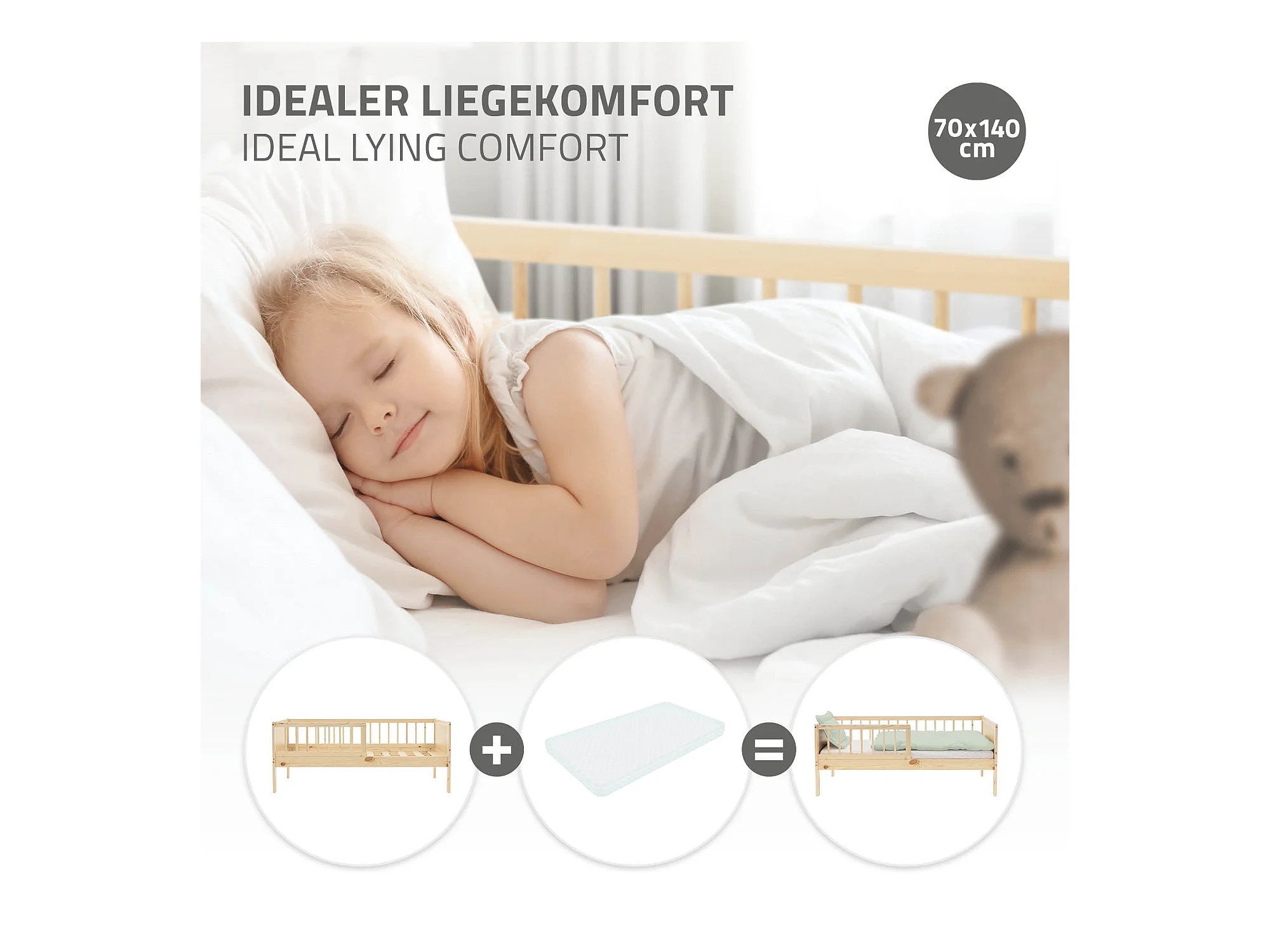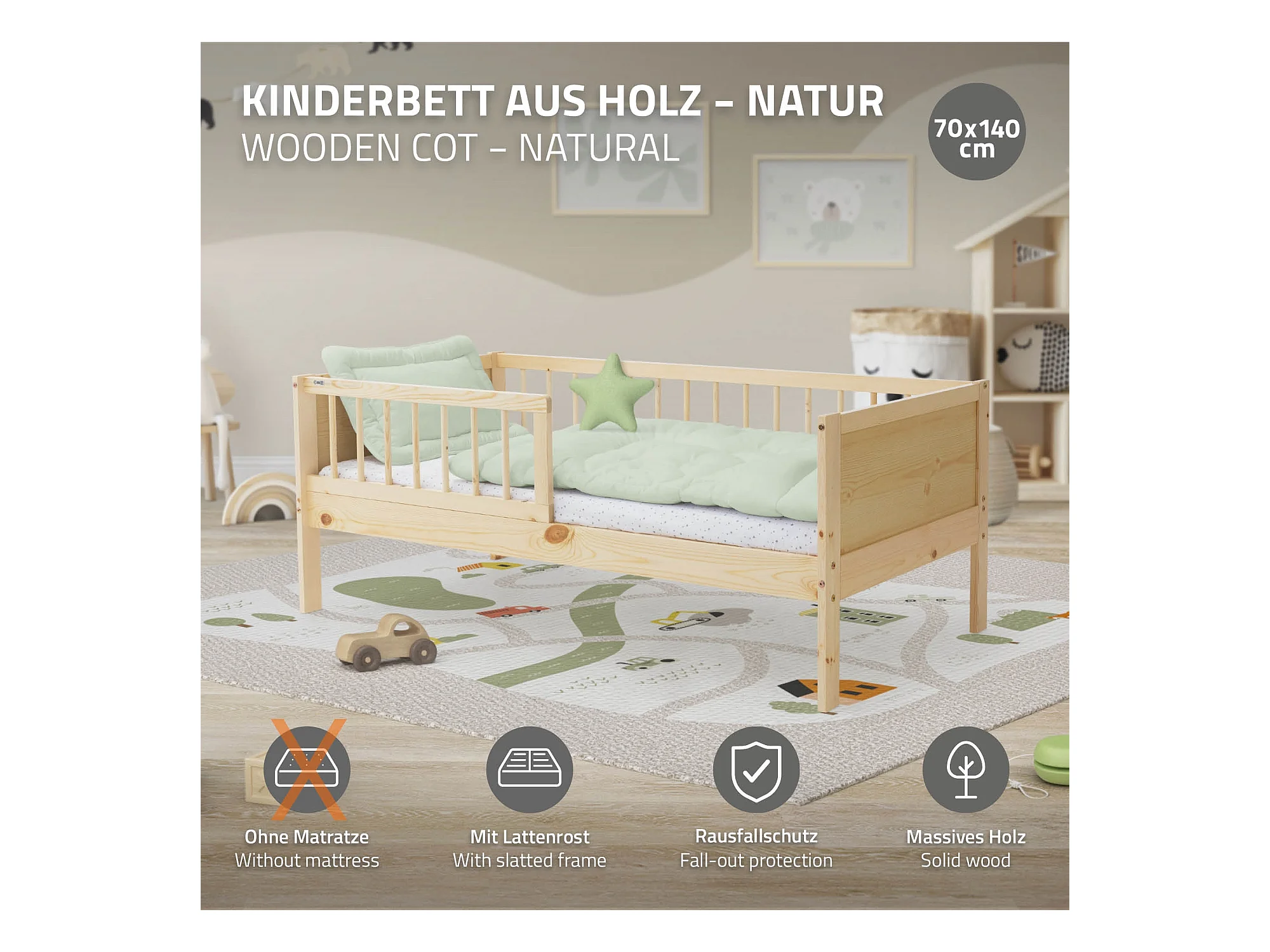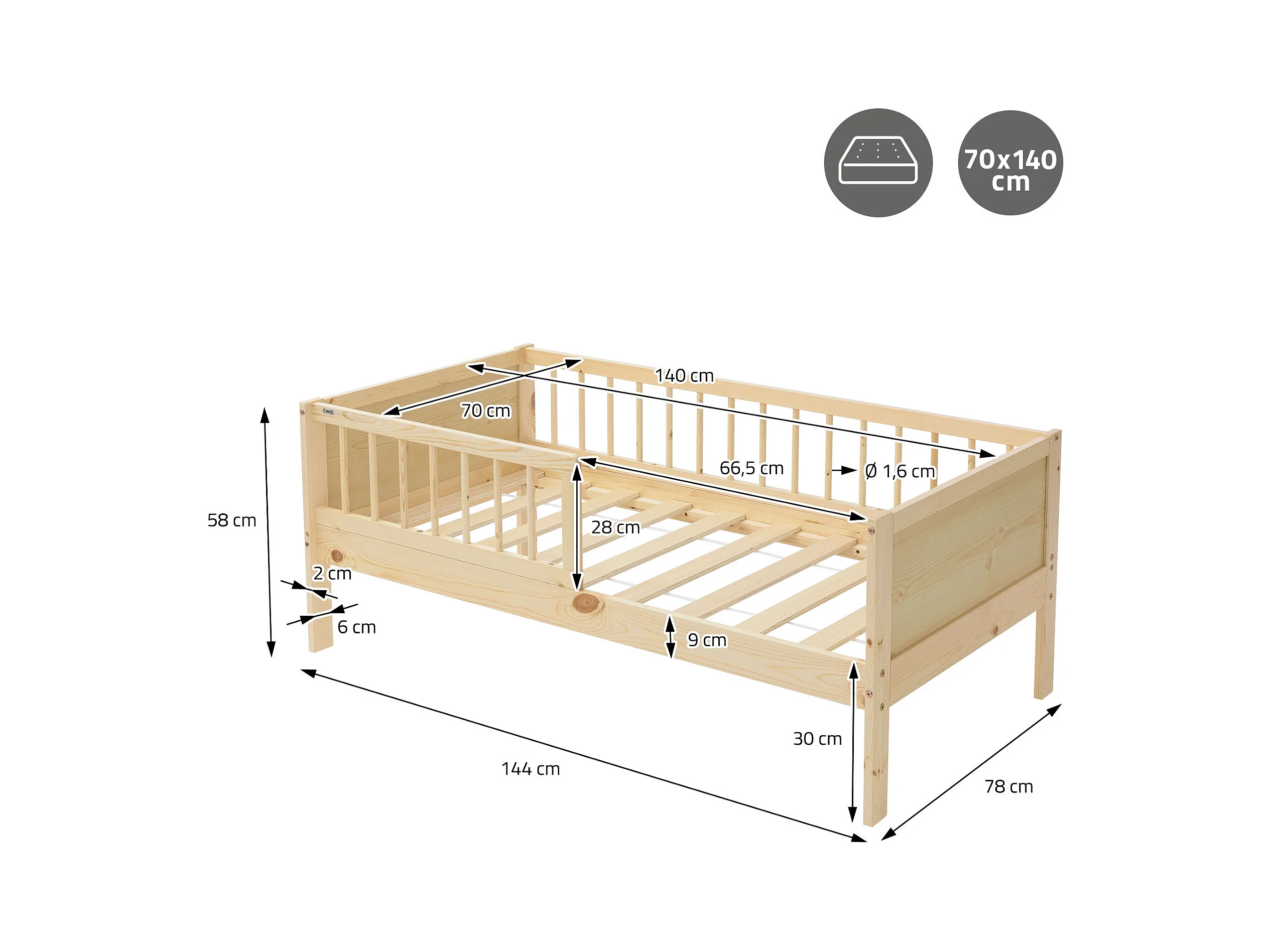 ML-Design Cama infantil 70x140cm color natural beige con protección anticaída y somier mobiliario con estructura de listones madera pino maciza
