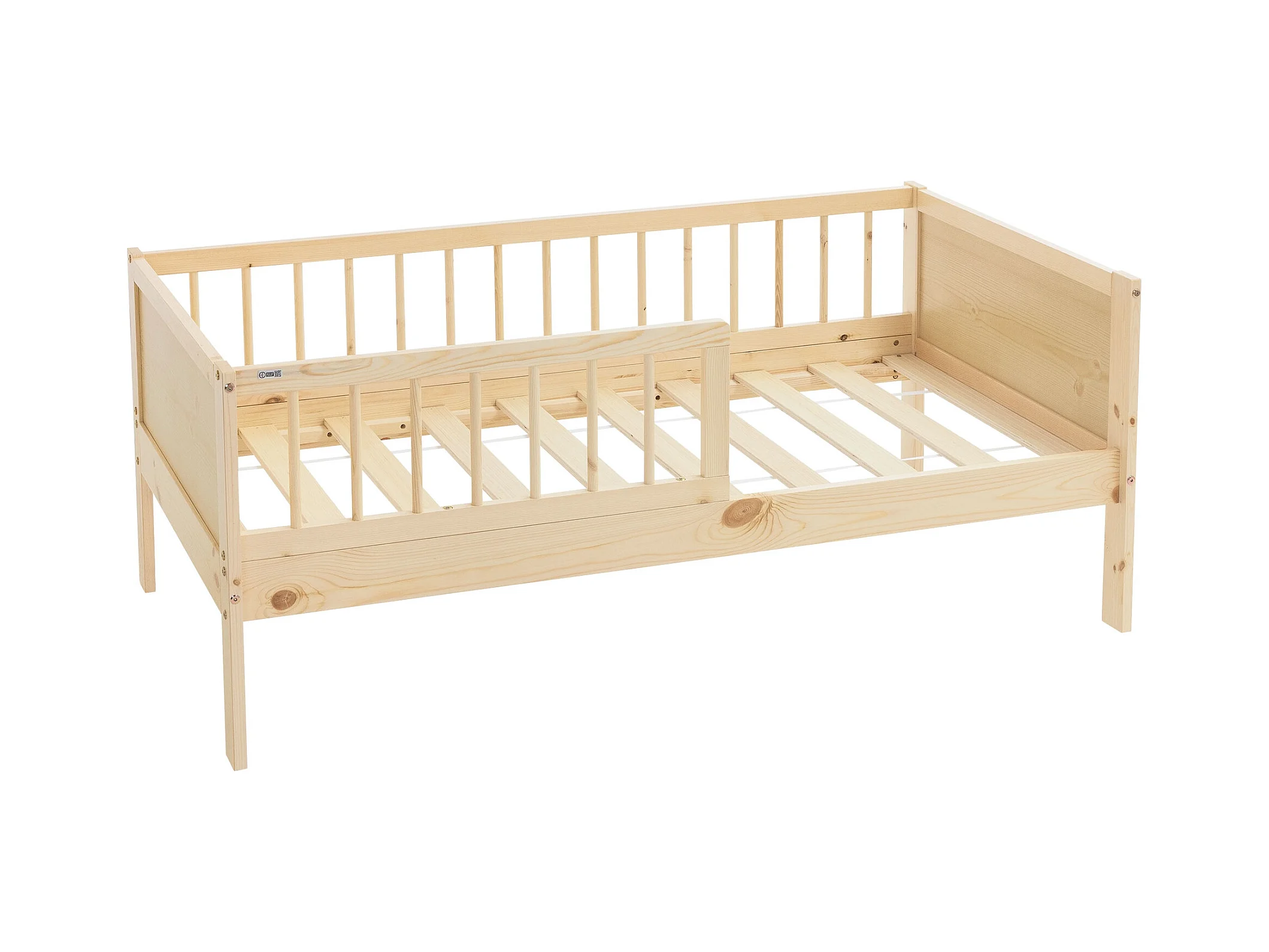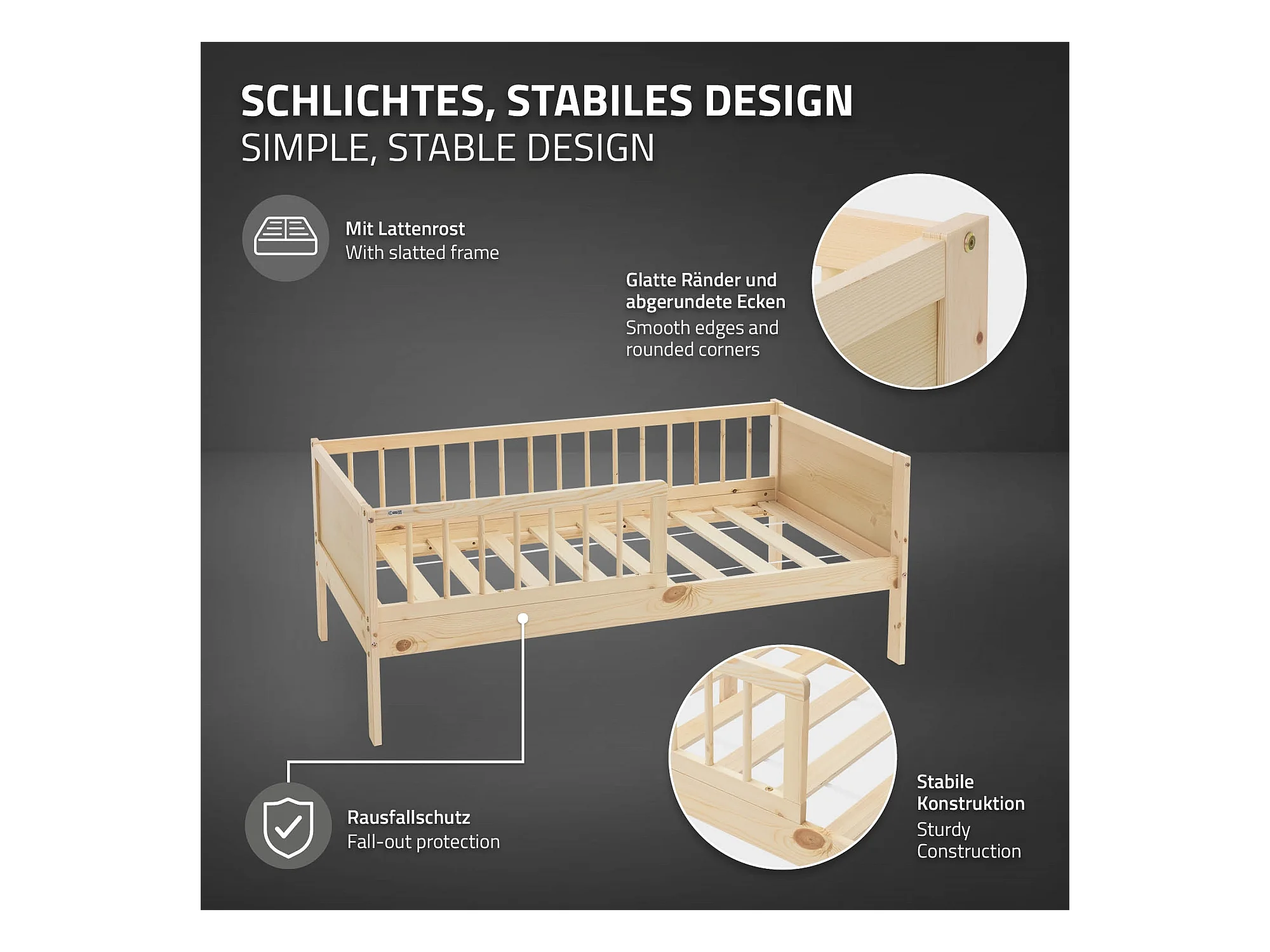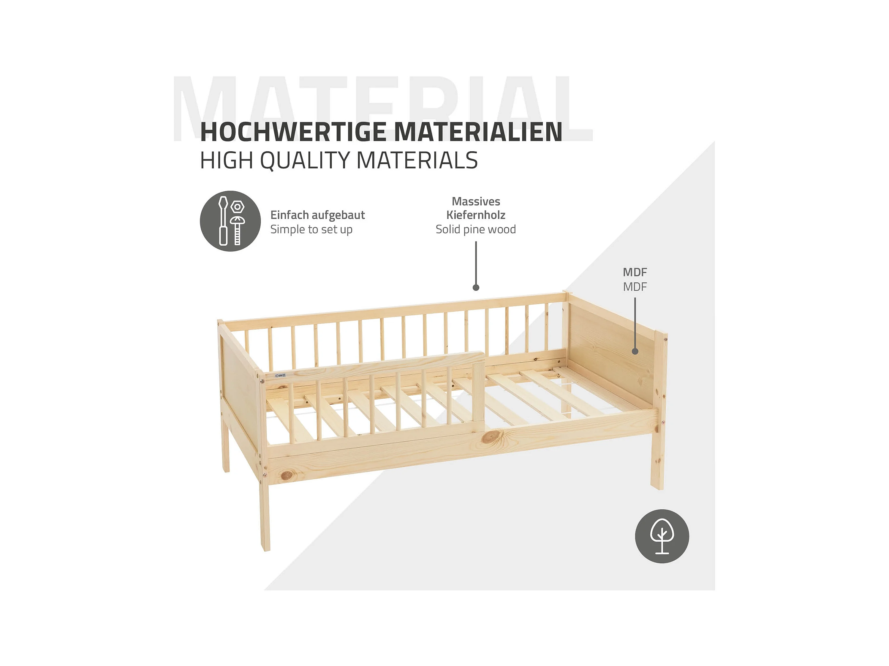 ML-Design Cama infantil 70x140cm color natural beige con protección anticaída y somier mobiliario con estructura de listones madera pino maciza