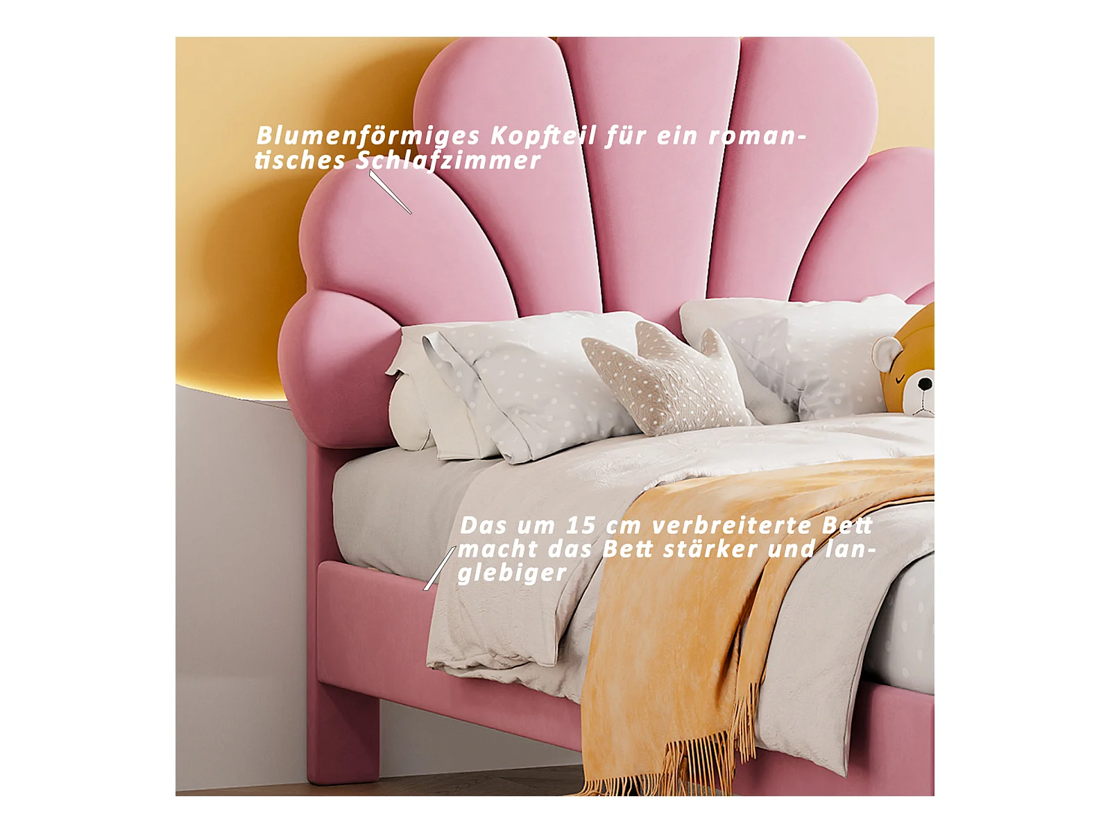 Cama individual tapizada 90x200cm - Cabecero en forma de flor, Somier de láminas de MDF, Tejido terciopelo estilo escandinavo - Rosa