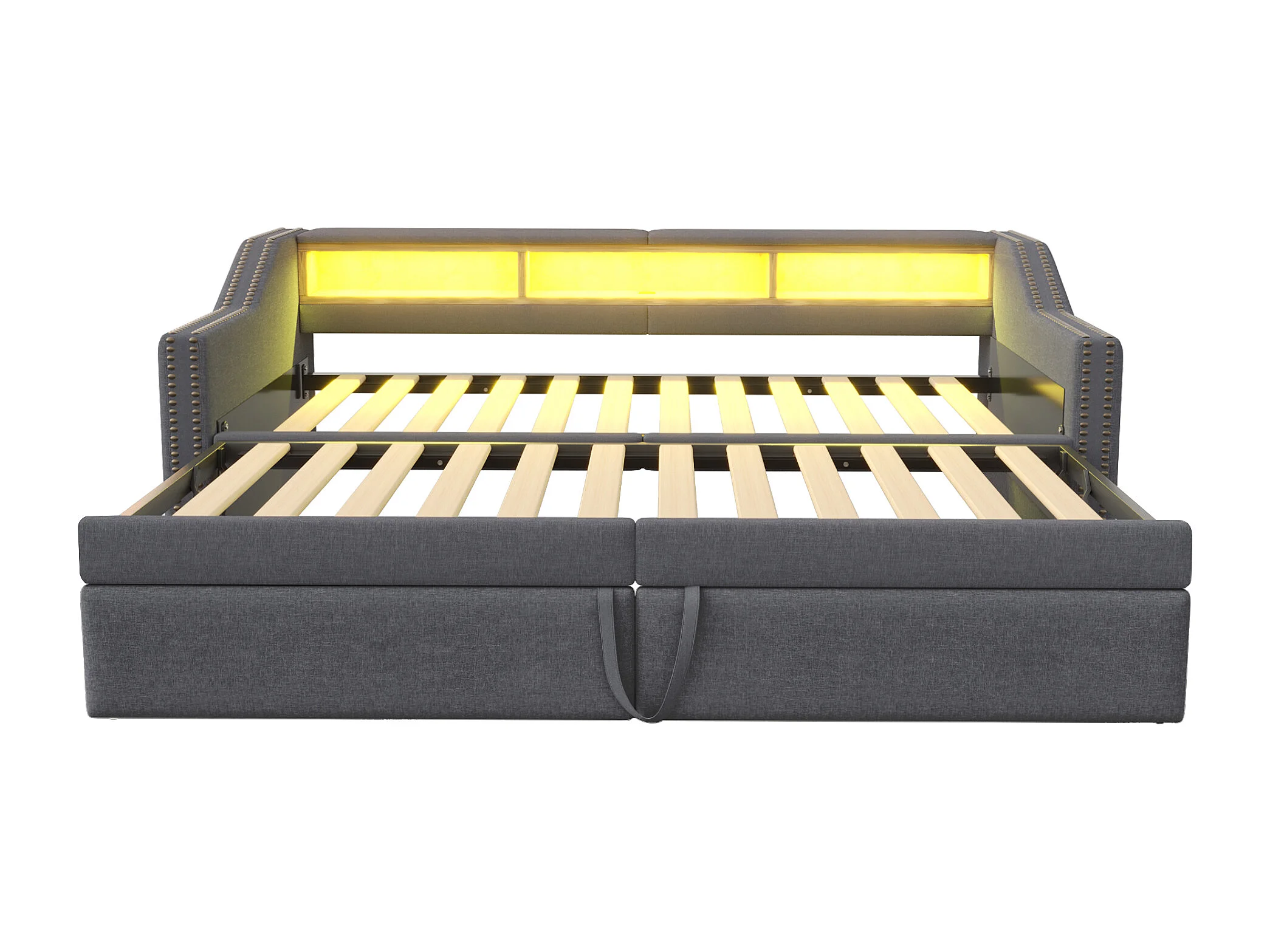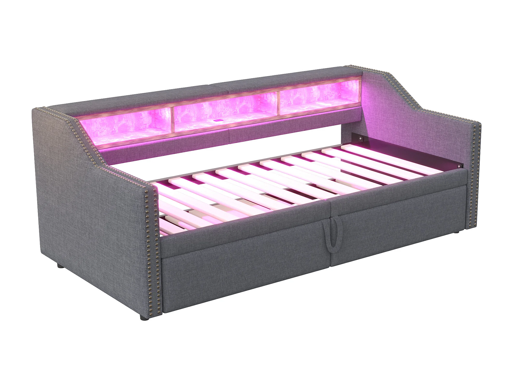 Cama infantil 90/180x200 cm gris en lino, cama nido tipo sofá con LED y puerto USB, sin colchón