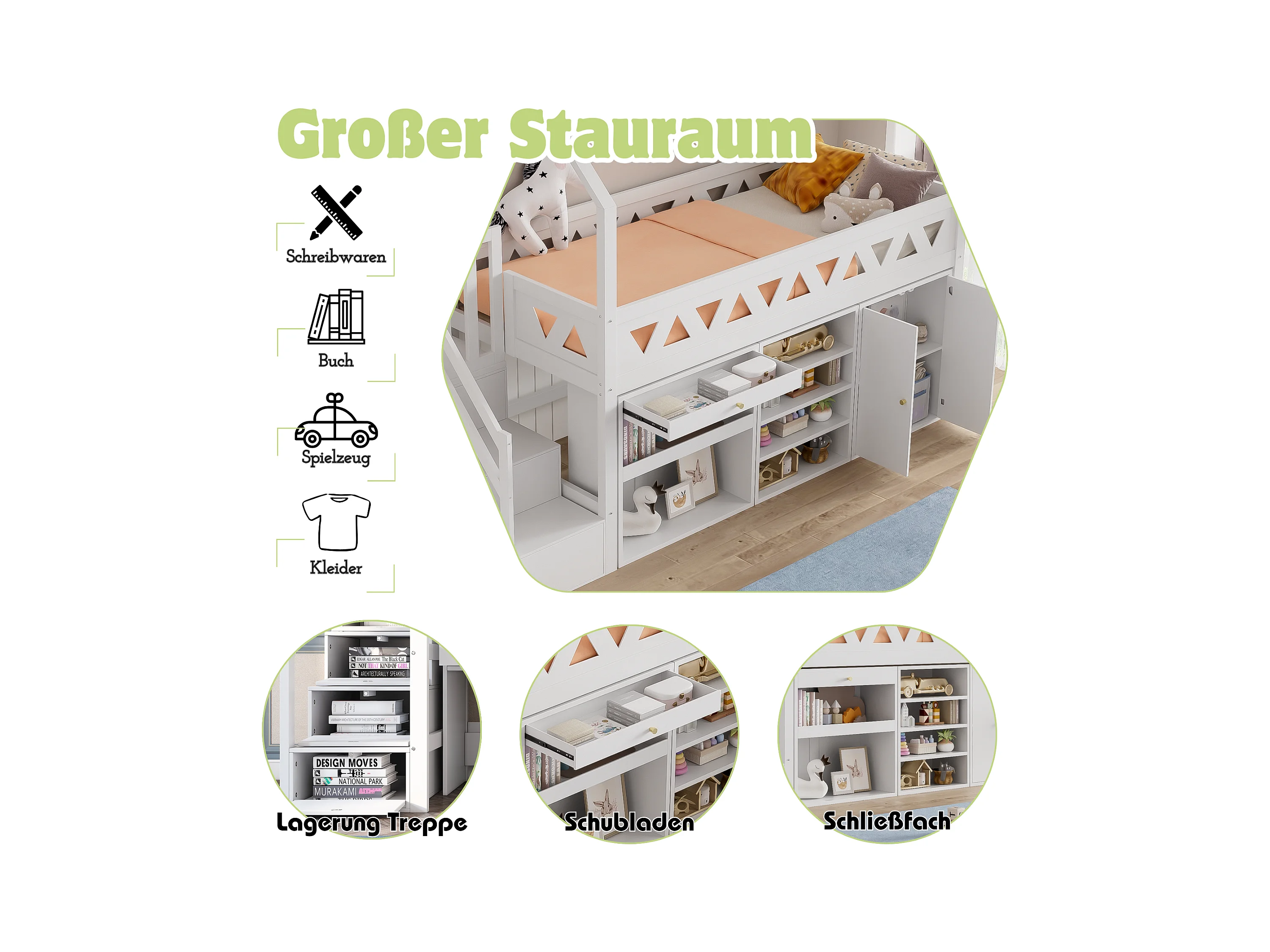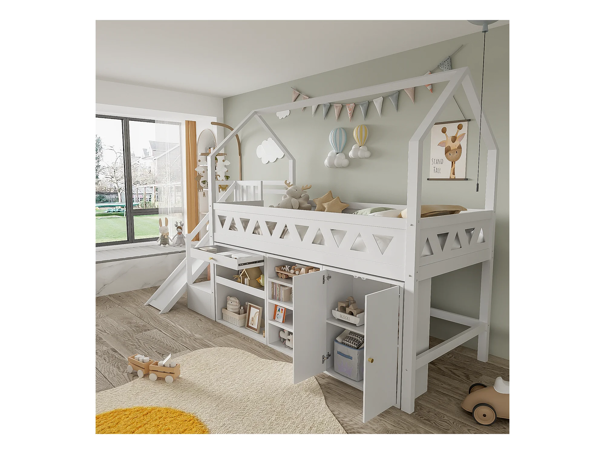 Cama infantil 90x200 cm en madera, forma de casa, con almacenaje y tela, multifuncional blanca