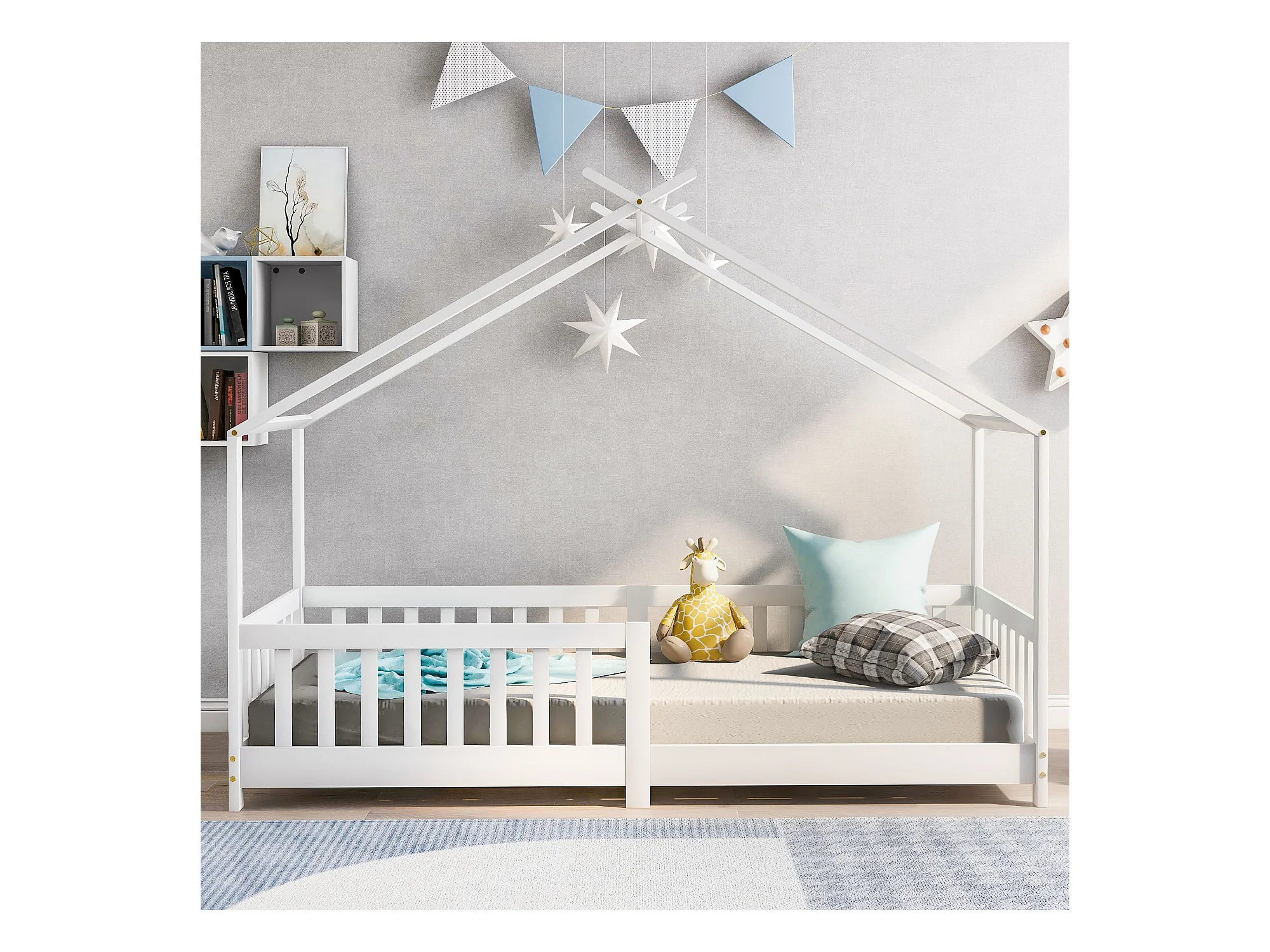 Cama casita infantil 90x200 cm blanca con valla, somier de láminas y protección contra caídas, sin colchón