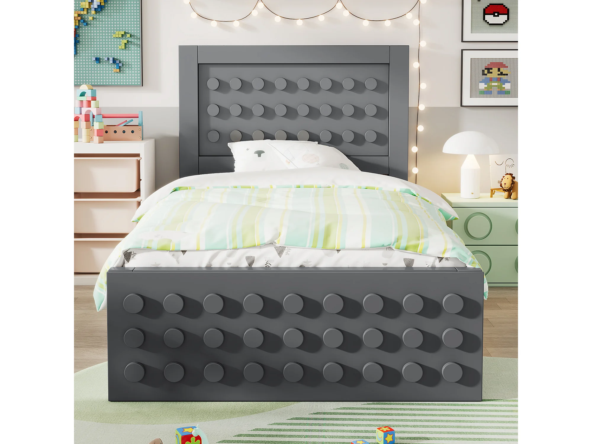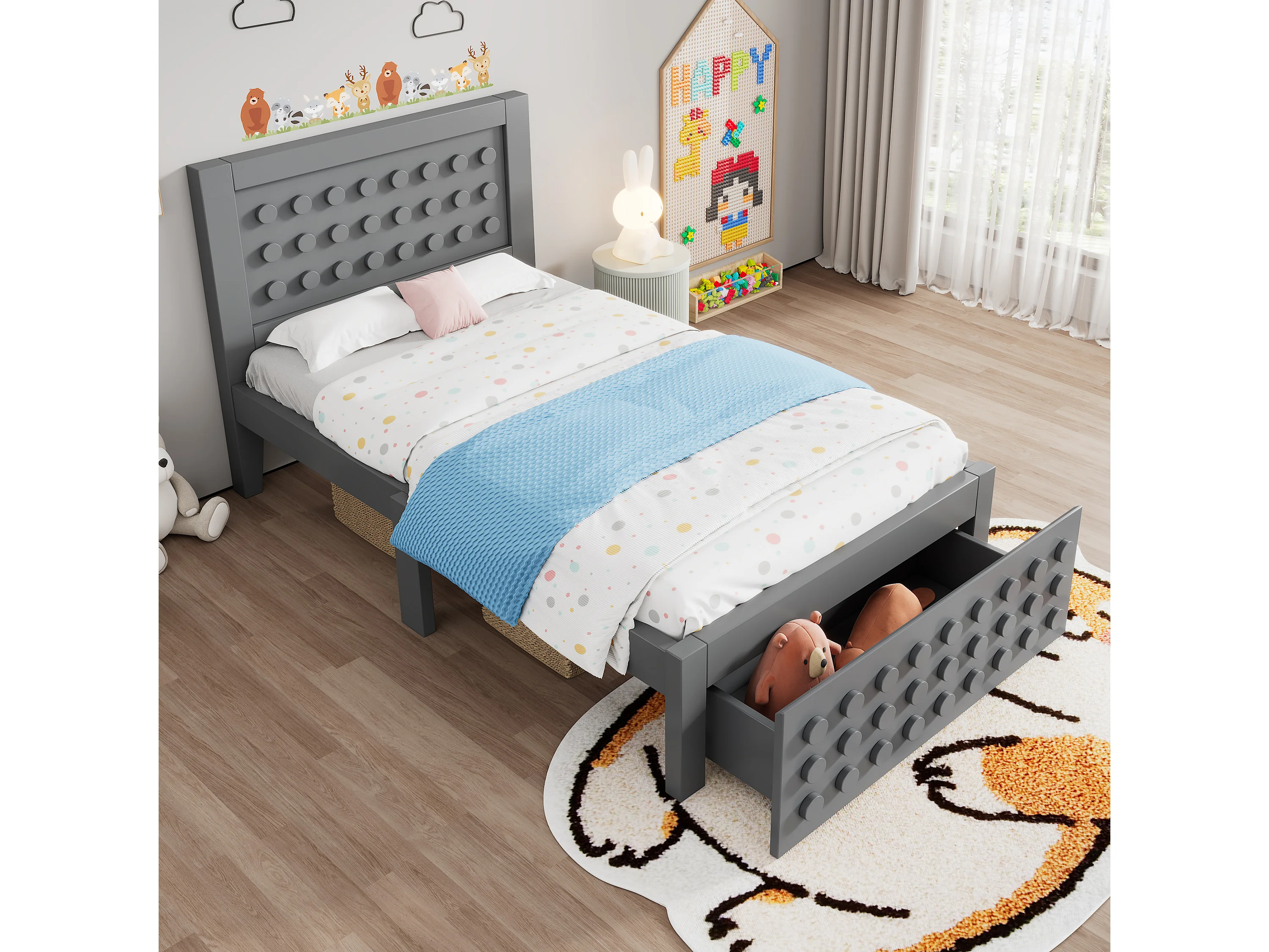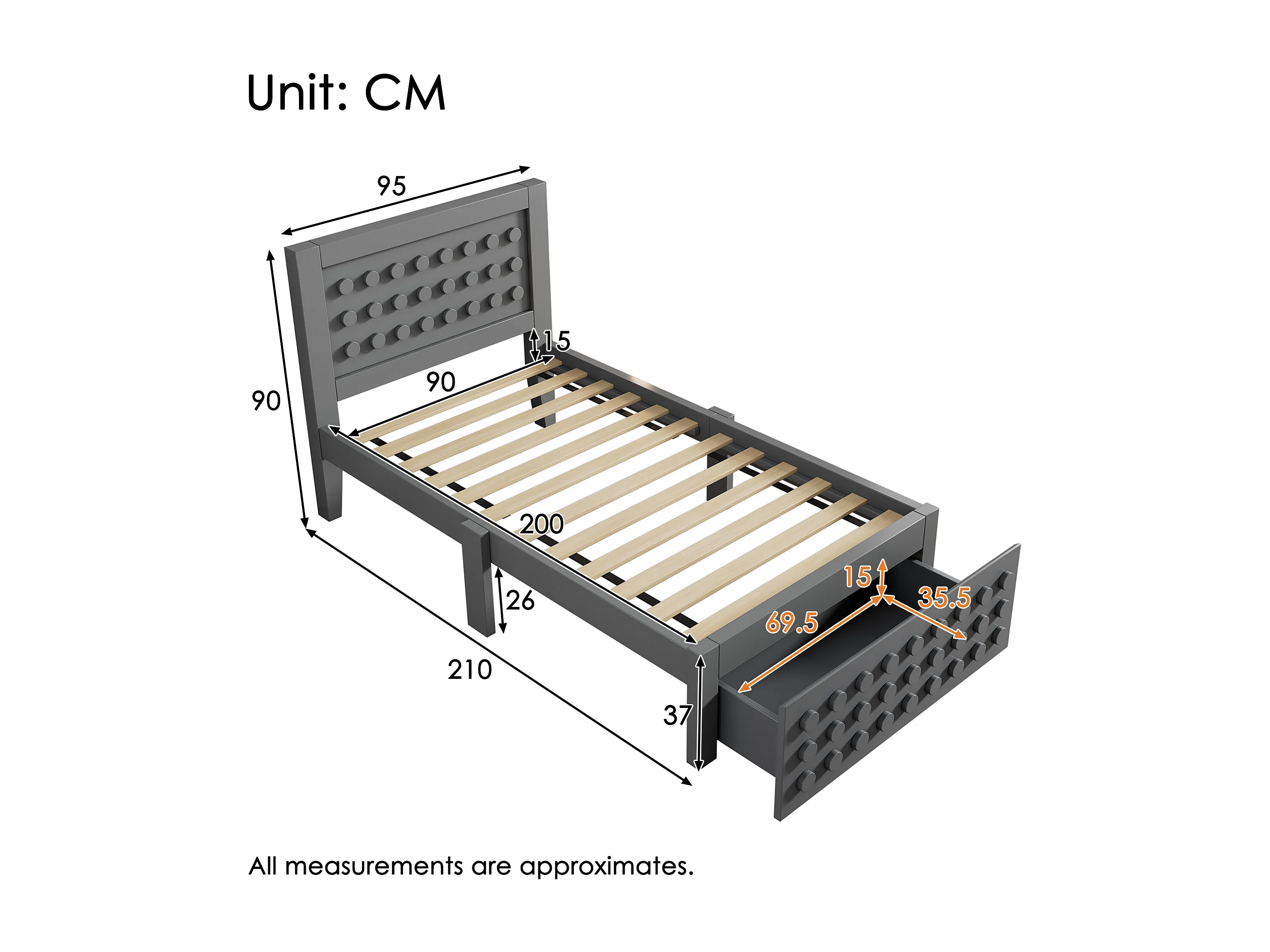 Cama infantil 90x200 cm, estructura de madera maciza, somier de láminas, cajones y espacio de almacenaje bajo la cama, color gris (90x200 cm)
