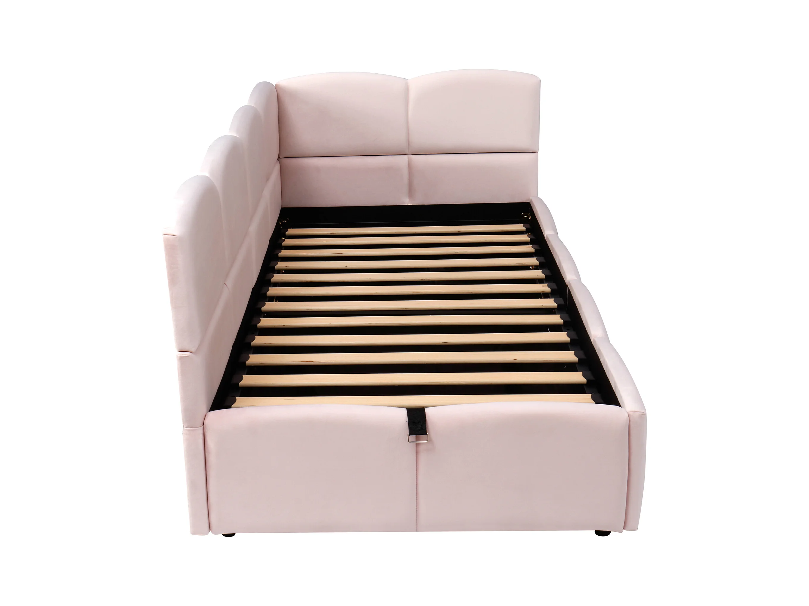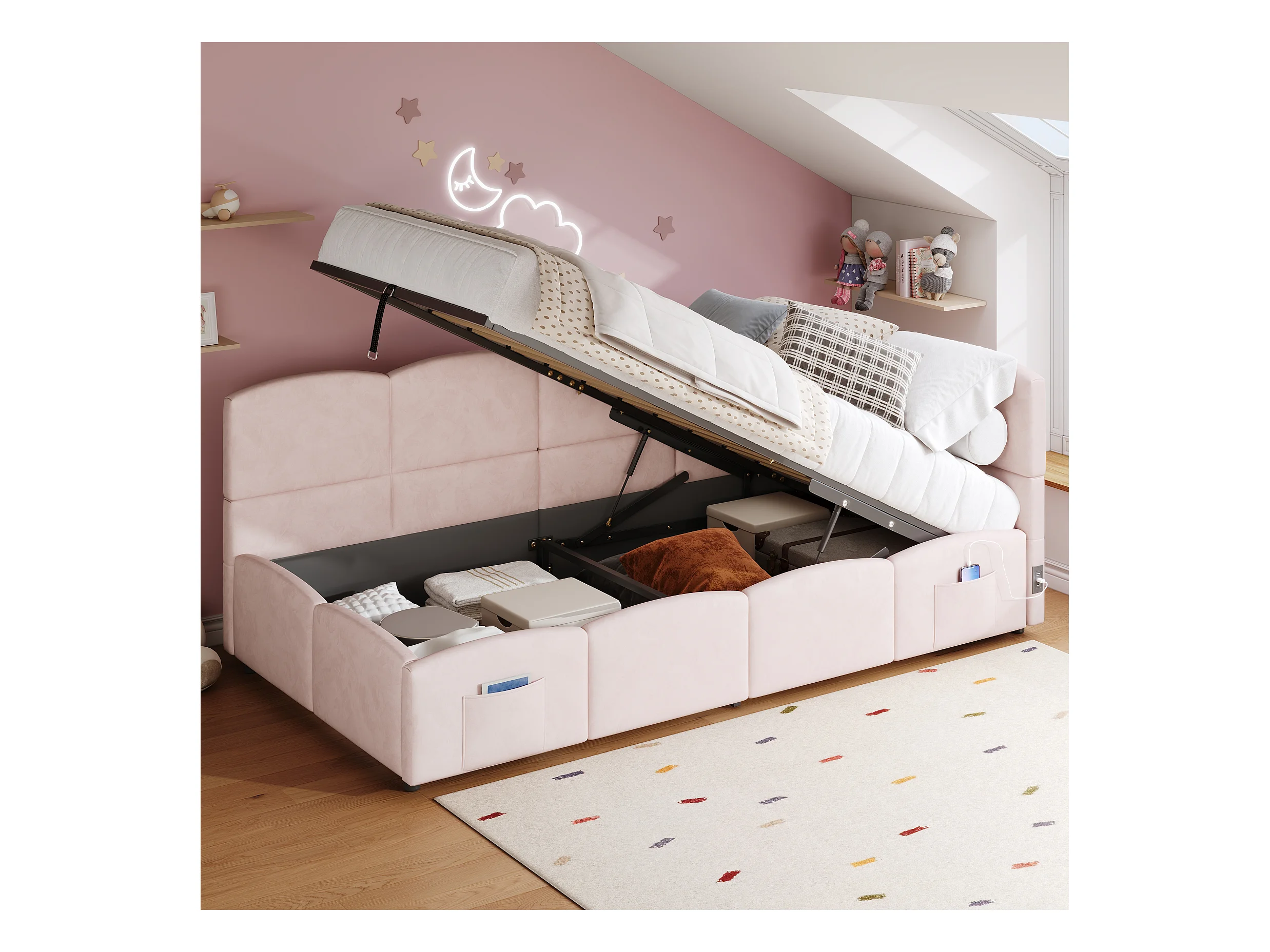 Sofá cama infantil 90x200 cm - Cama con almacenamiento - con puertos USB - con bolsillo de almacenamiento - Terciopelo - Rosa (sin colchón)