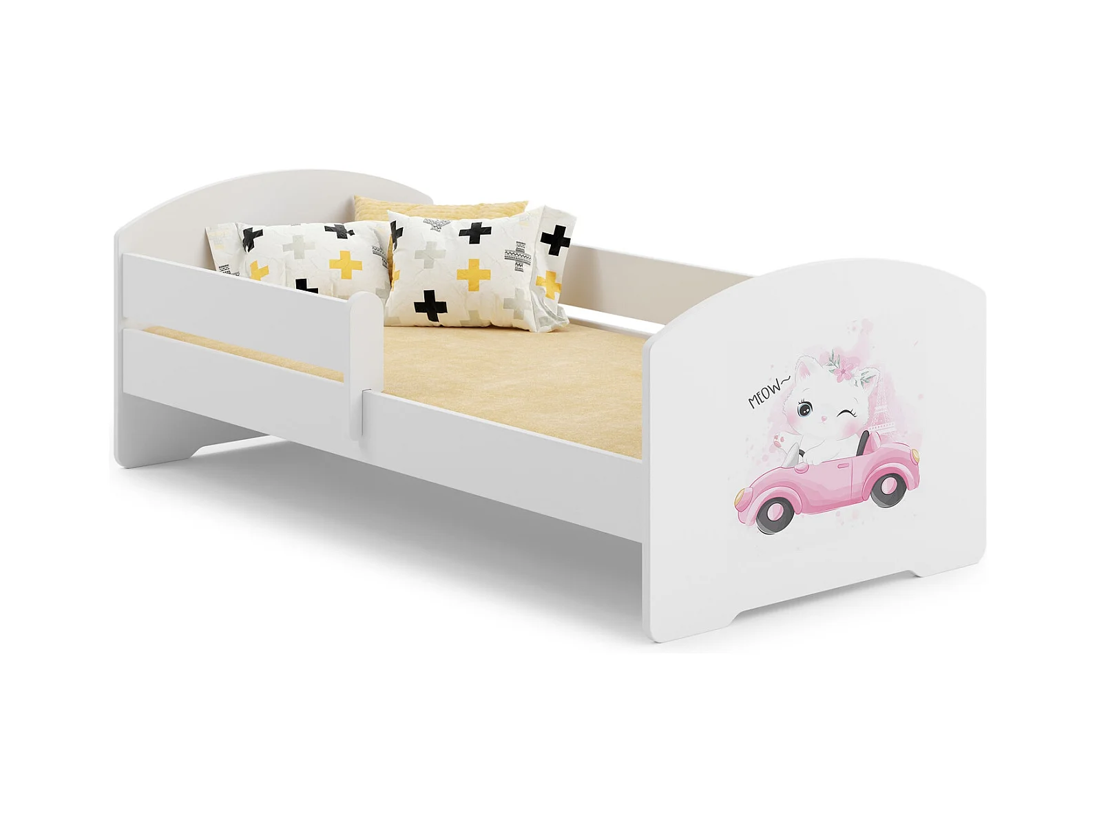 Cama Infantil Blanca 140x70 cm Dibujo Gato con Barandilla – Incluye Colchón de Espuma y Estructura Completa, Dimensiones 144 cm x77 cm x56 cm