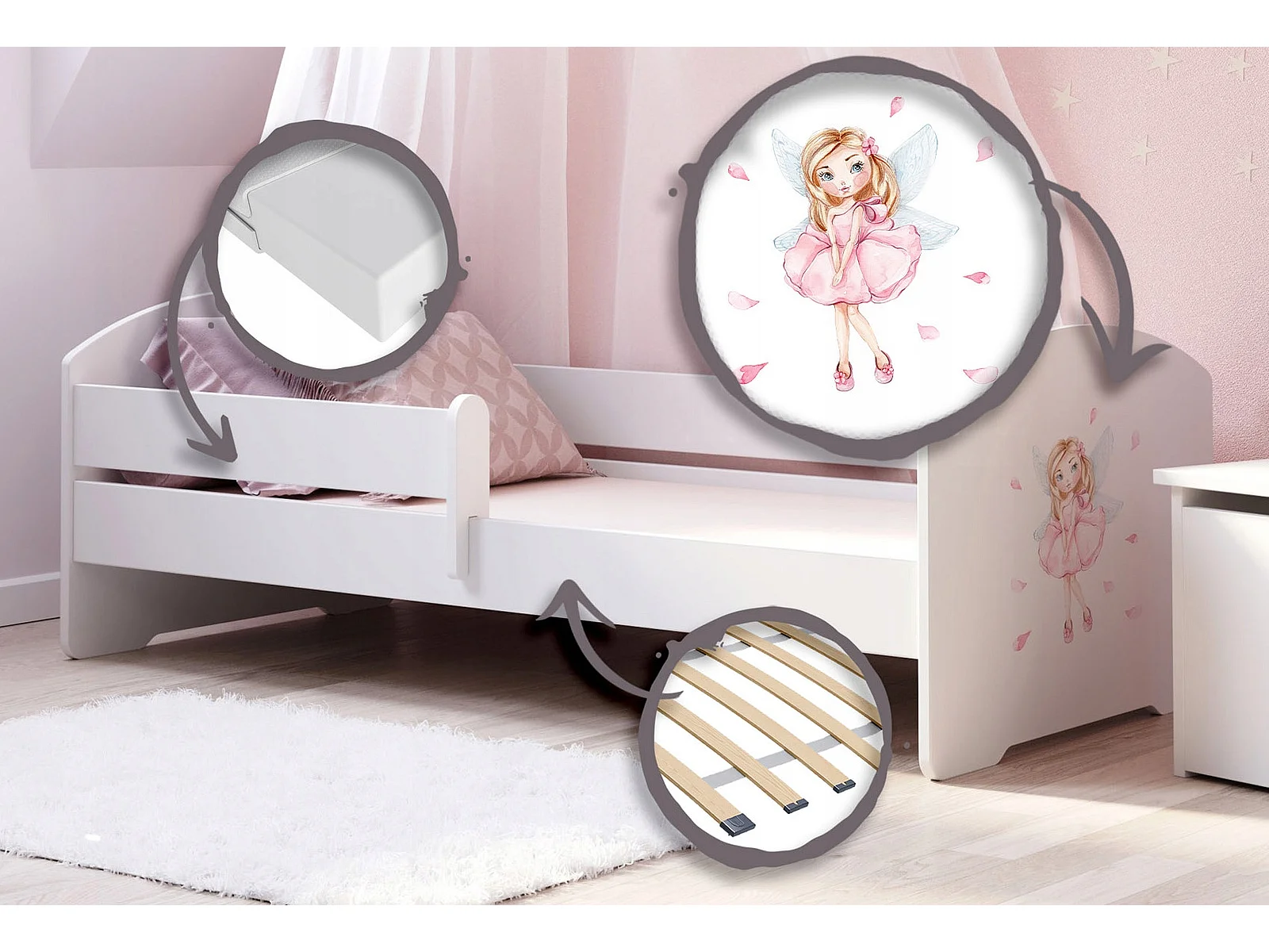 Cama Infantil Blanca 140x70 cm Dibujo Hada con Barandilla – Incluye Colchón de Espuma y Estructura Completa, Dimensiones 144 cm x77 cm x56 cm