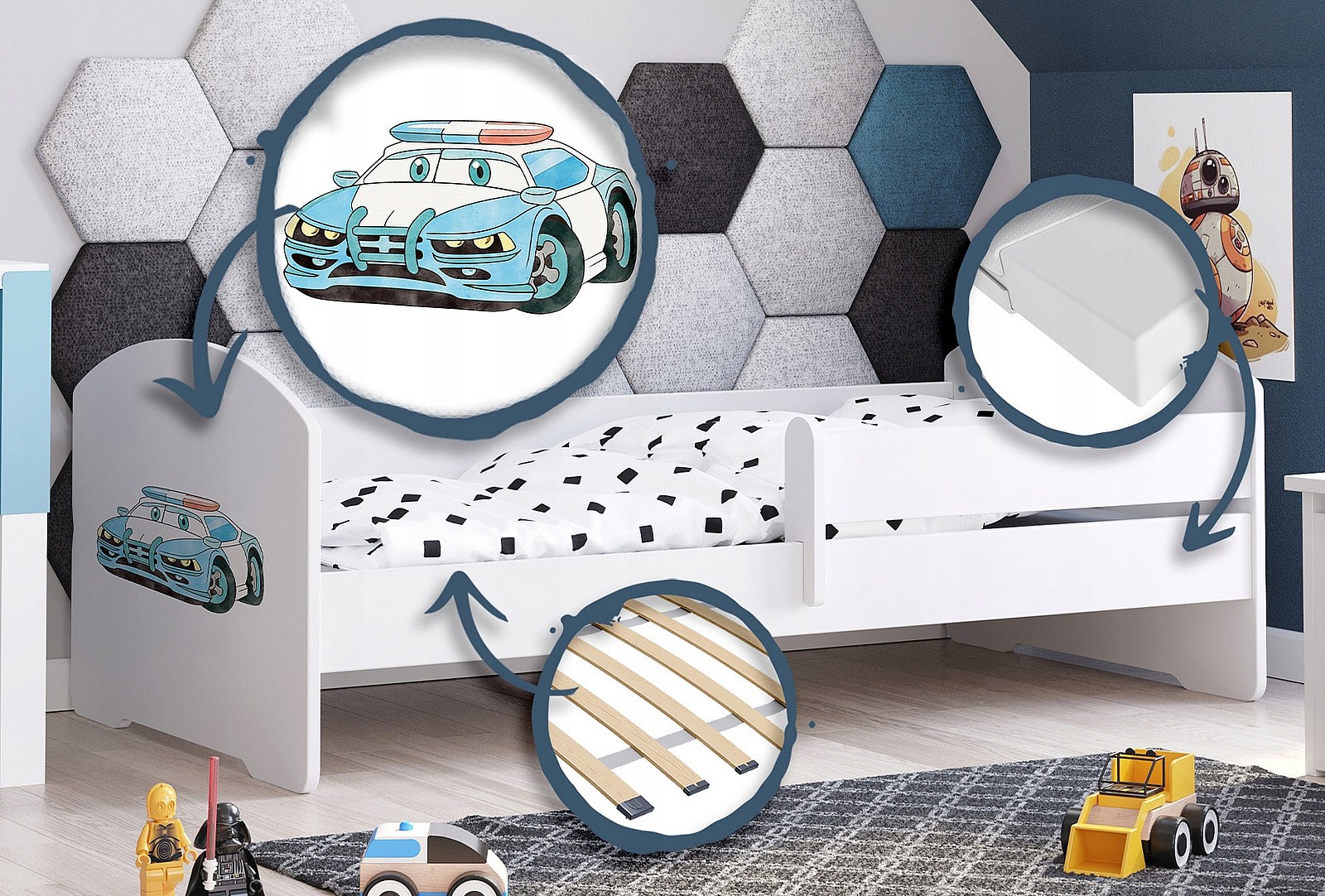Cama Infantil Blanca 140x70 cm Dibujo Policía con Barandilla – Incluye Colchón de Espuma y Estructura Completa, Dimen: 144 cm x77 cm x56 cm