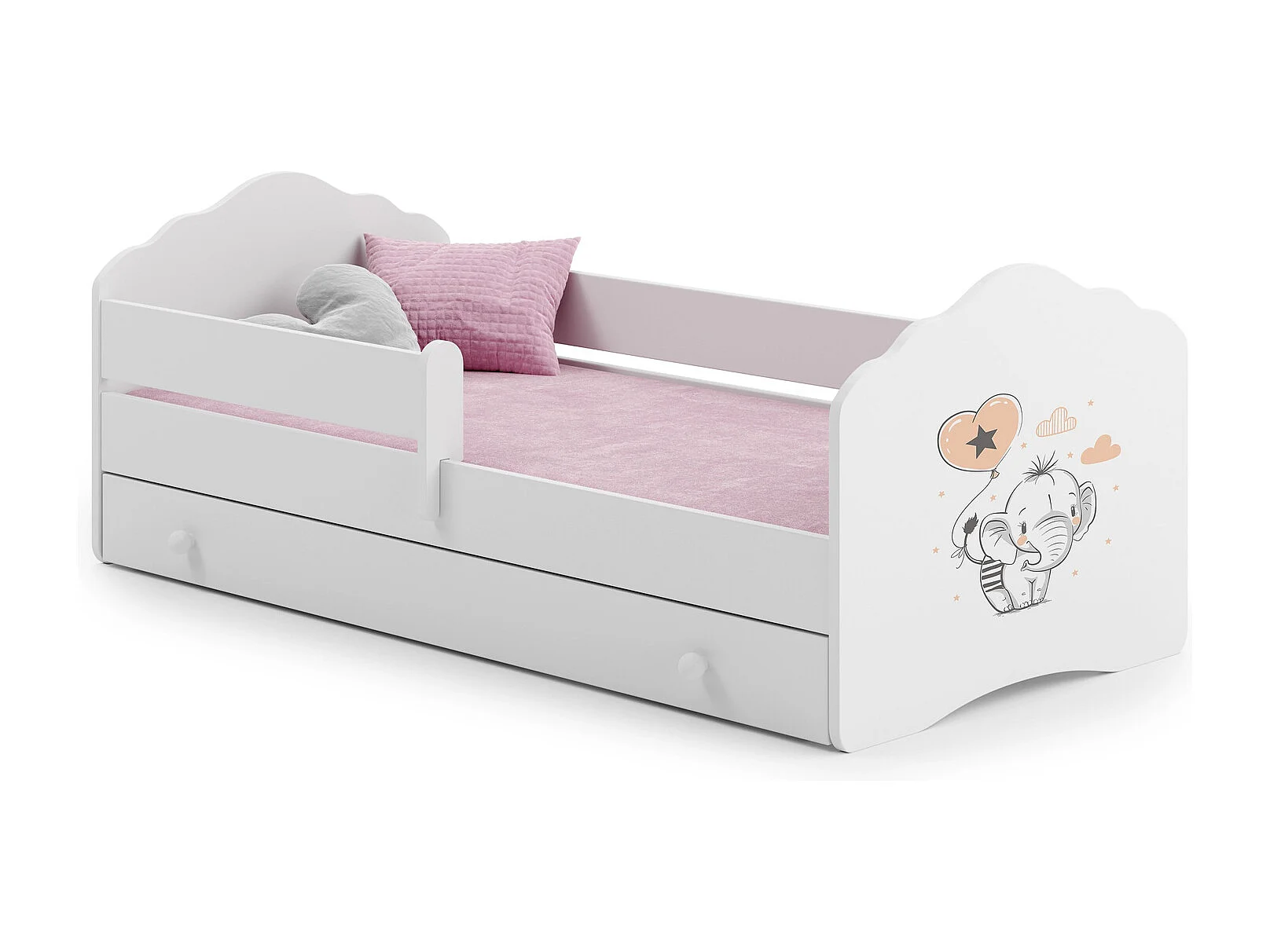 Cama Infantil Blanca 160x80 cm Dibujo Elefante con Cajón y Barandilla – Incluye Colchón de Espuma, Estructura Completa 164x88x63 cm, Diseño Seguro