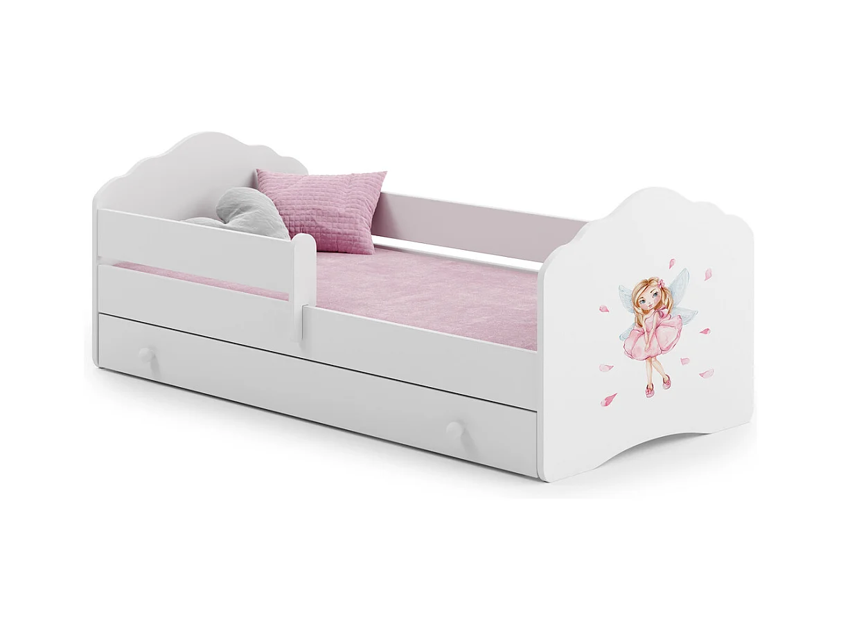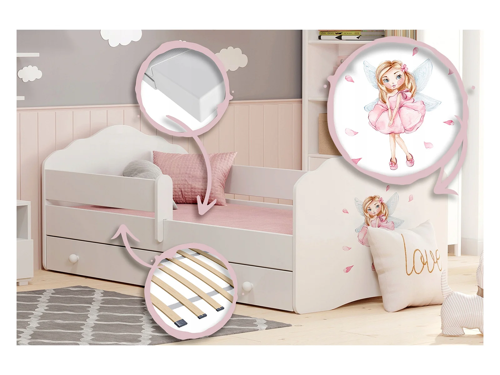 Cama Infantil Blanca 160x80 cm Dibujo Hada con Cajón y Barandilla – Incluye Colchón de Espuma, Estructura Completa 164x88x63 cm, Diseño Seguro