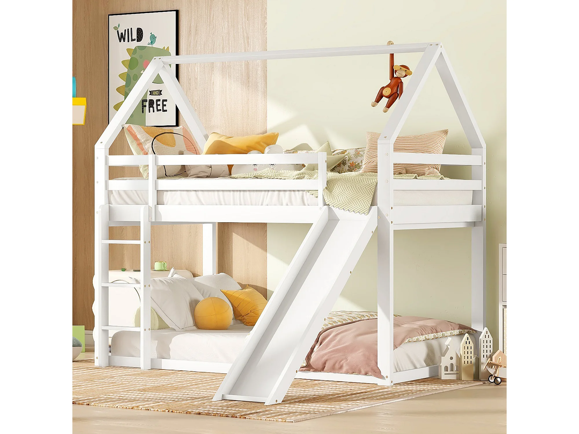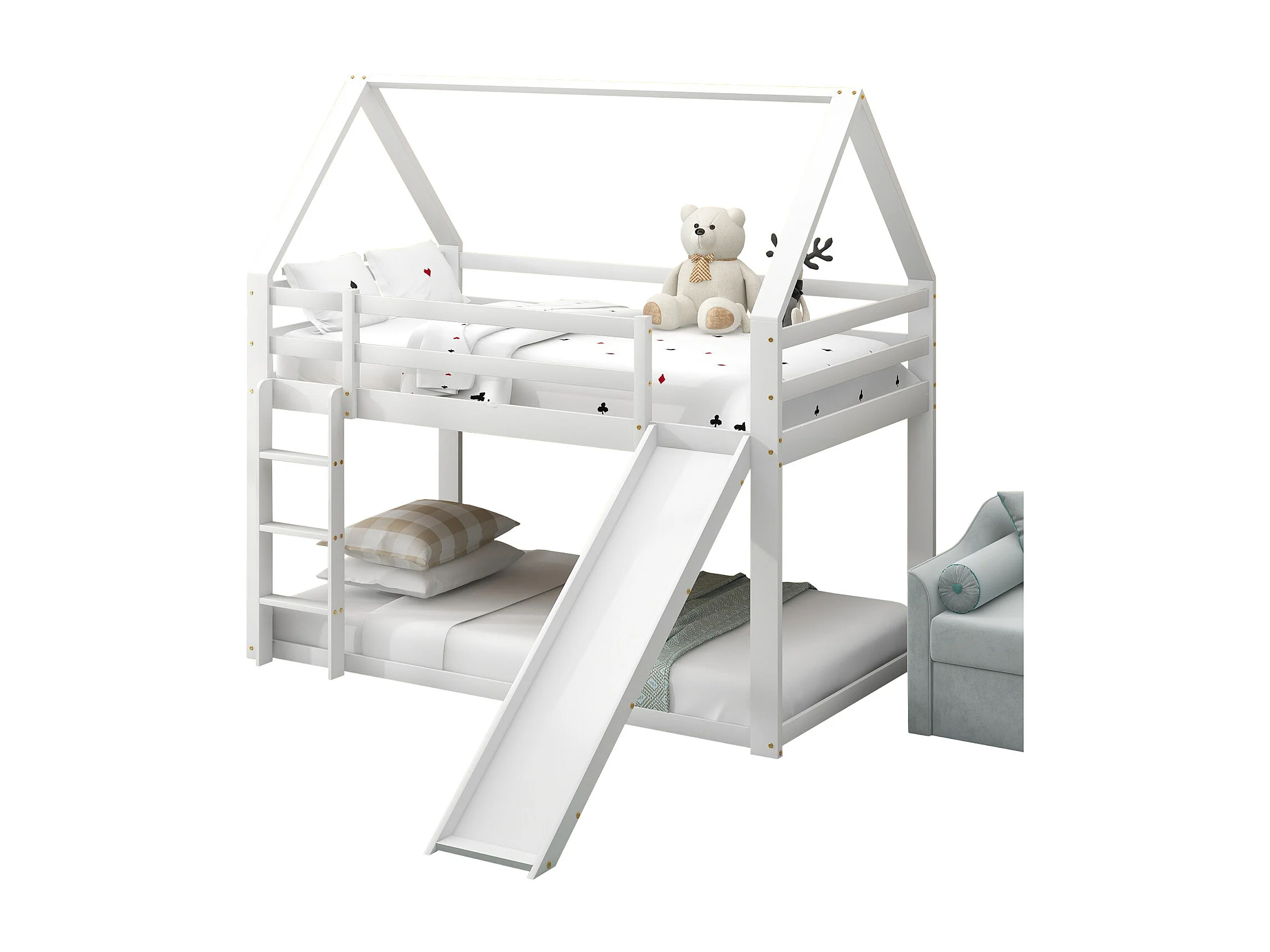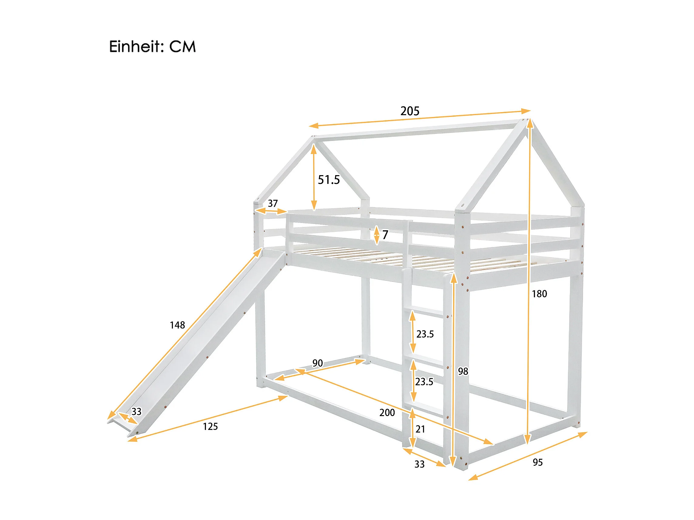 Cama infantil blanca de 90x200 cm con tobogán y escalera, práctica y divertida cama individual – Litera segura y casita de juegos para niños