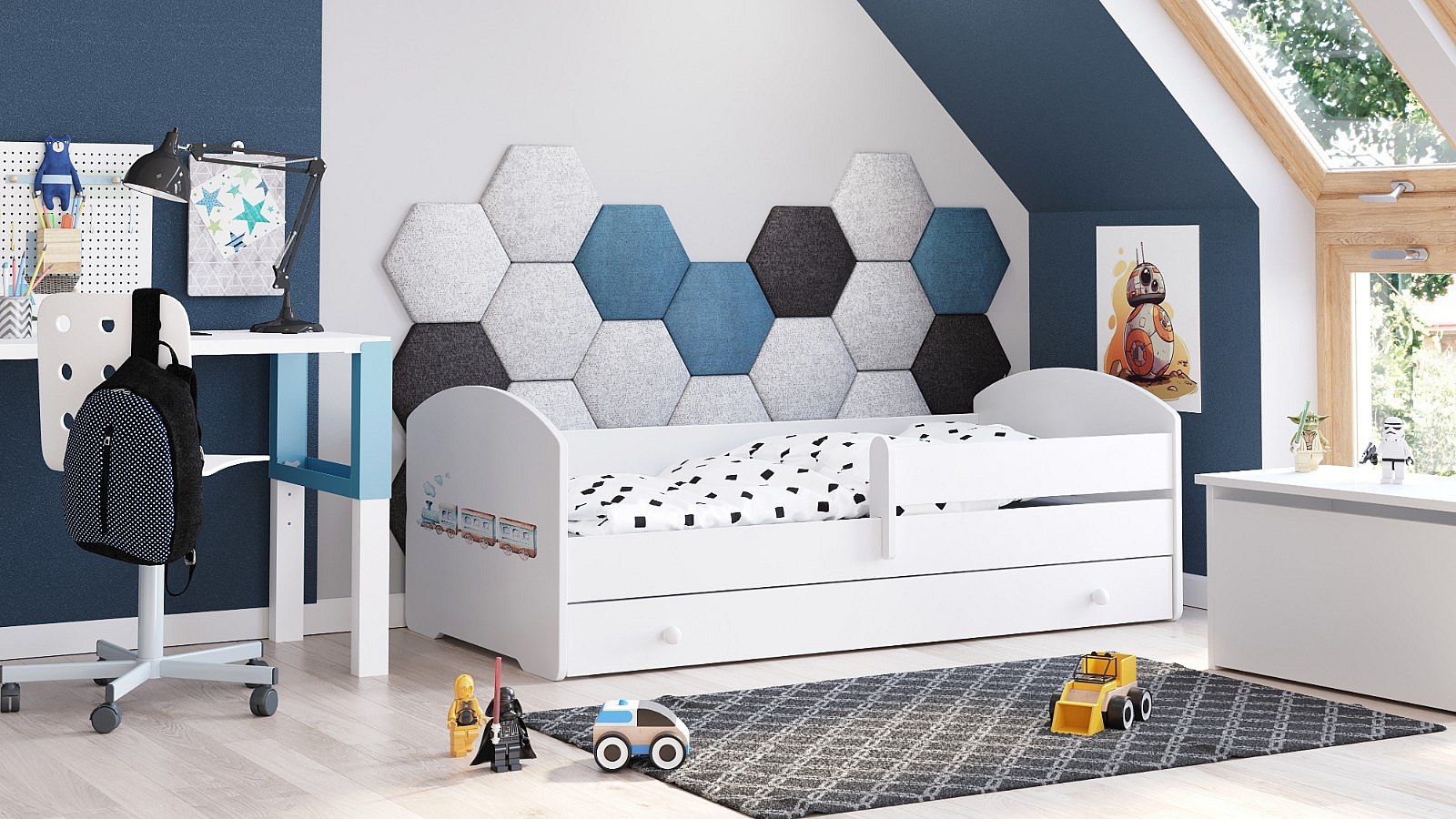 Cama Infantil Blanca Estilo Escandinavo Dibujo Tren 140x70 cm con Cajón – Incluye Colchón de Espuma, Base y Estructura Completa