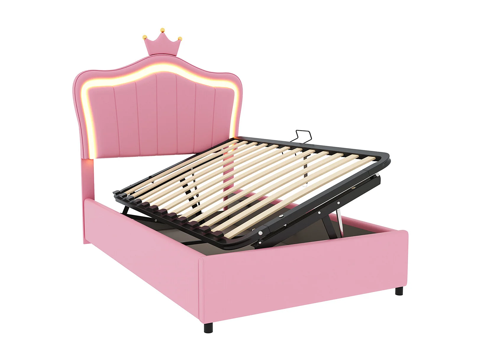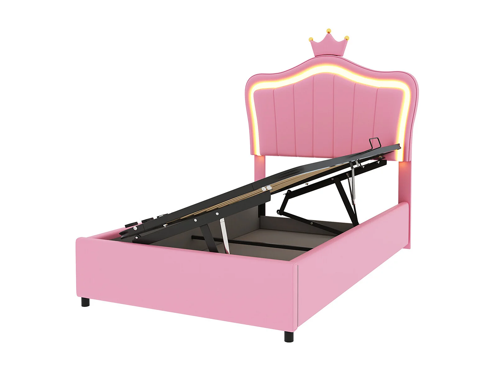 Cama infantil Canapé hidráulico y cabecero regulable en altura con iluminación LED y diseño de corona, Litera individual con somier, Rosa 90x 200 cm, sin colchón