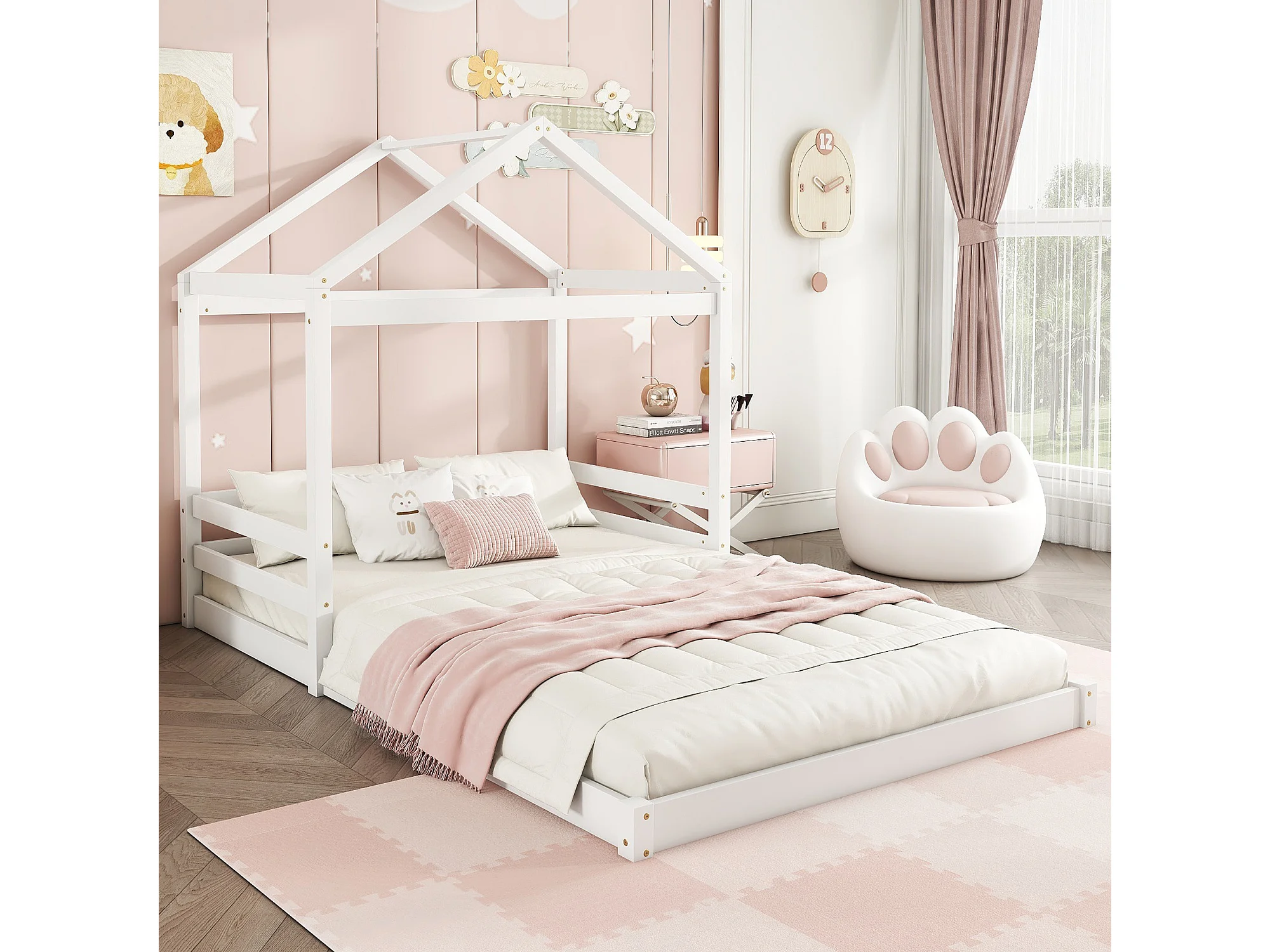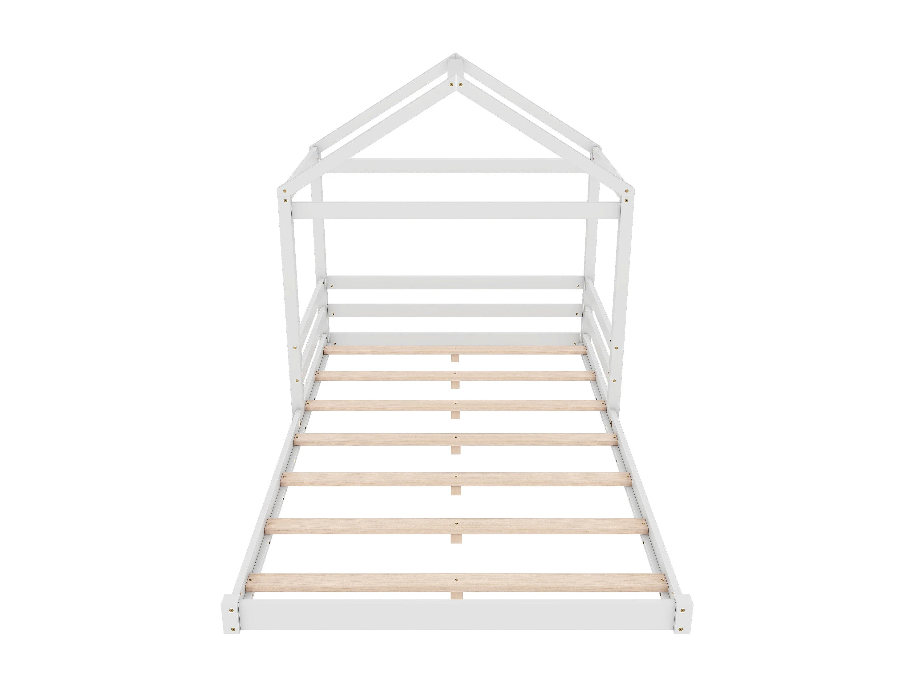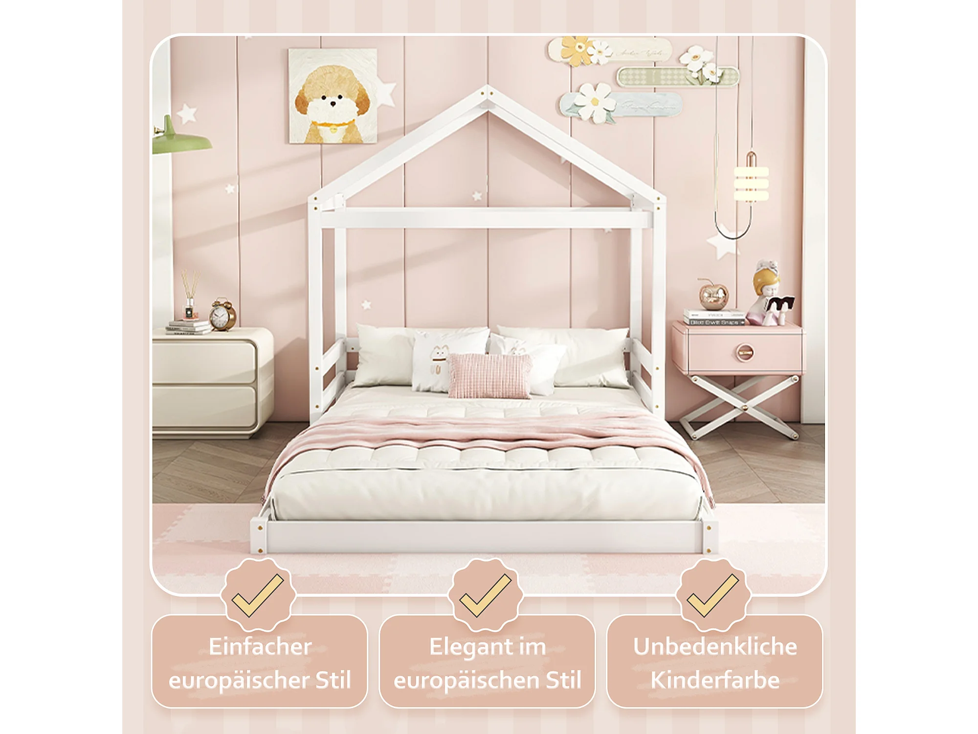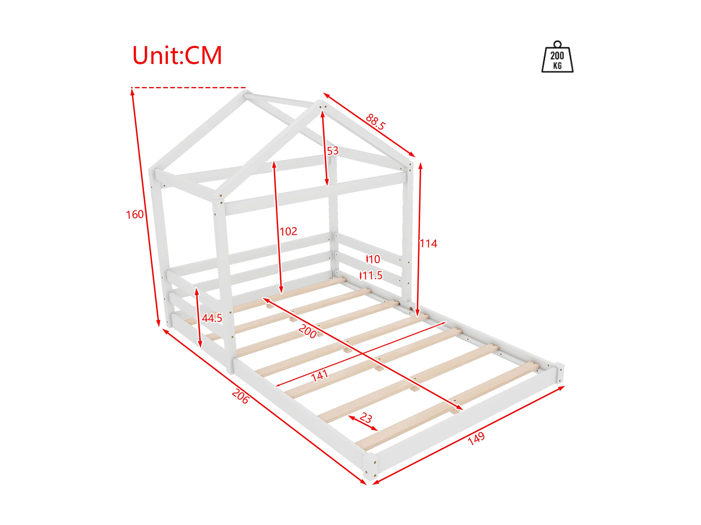 Cama infantil casita 140x200 cm en madera maciza con somier de láminas, estilo minimalista blanco