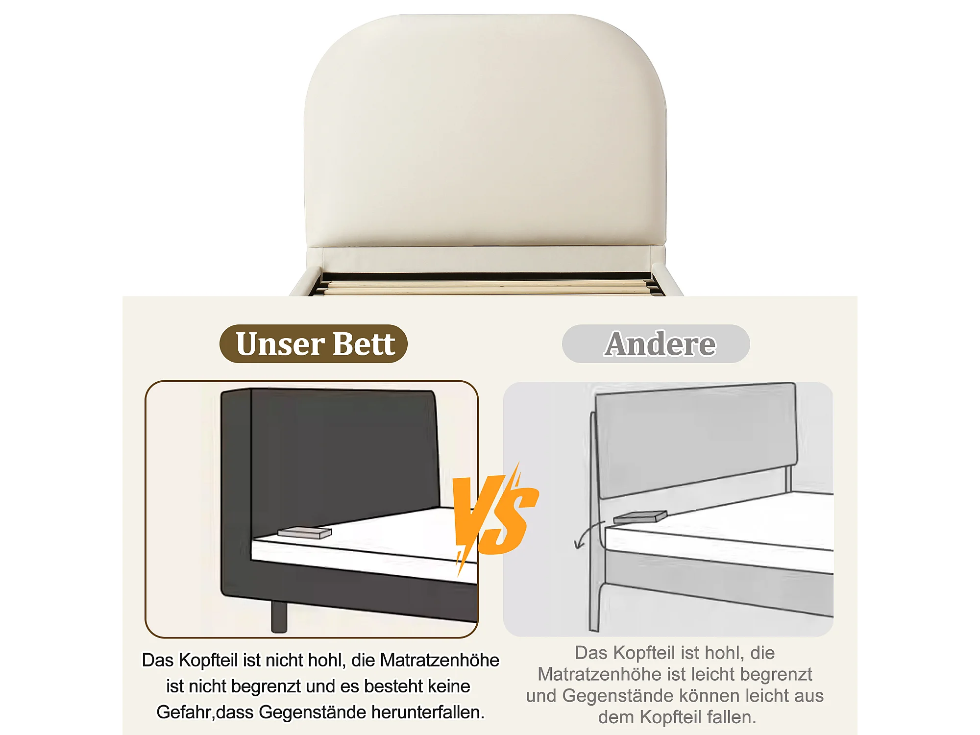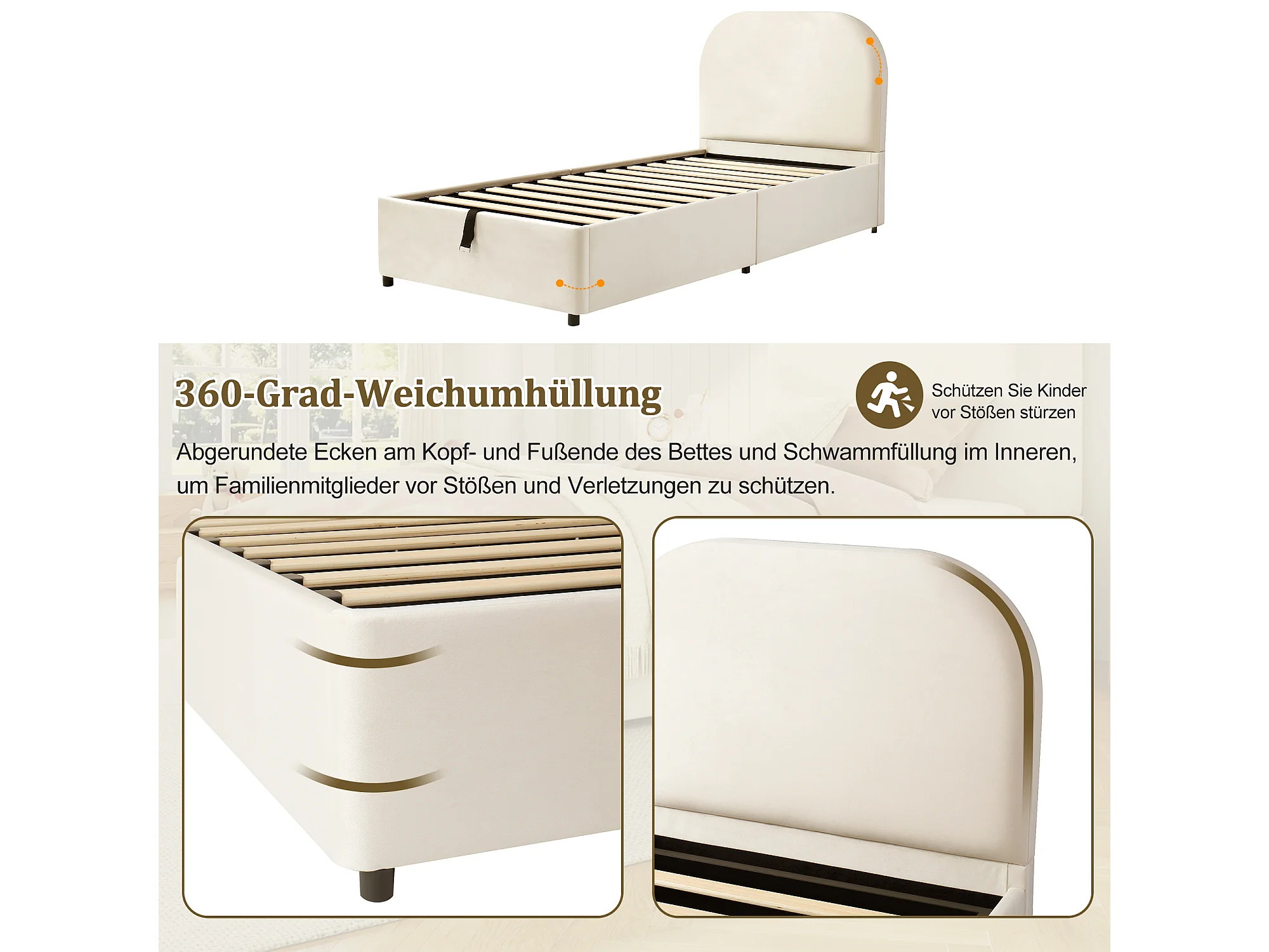 Cama infantil con almacenaje - 90 x 200 cm - con cabecero acolchado + almacenaje hidráulico - terciopelo - beige