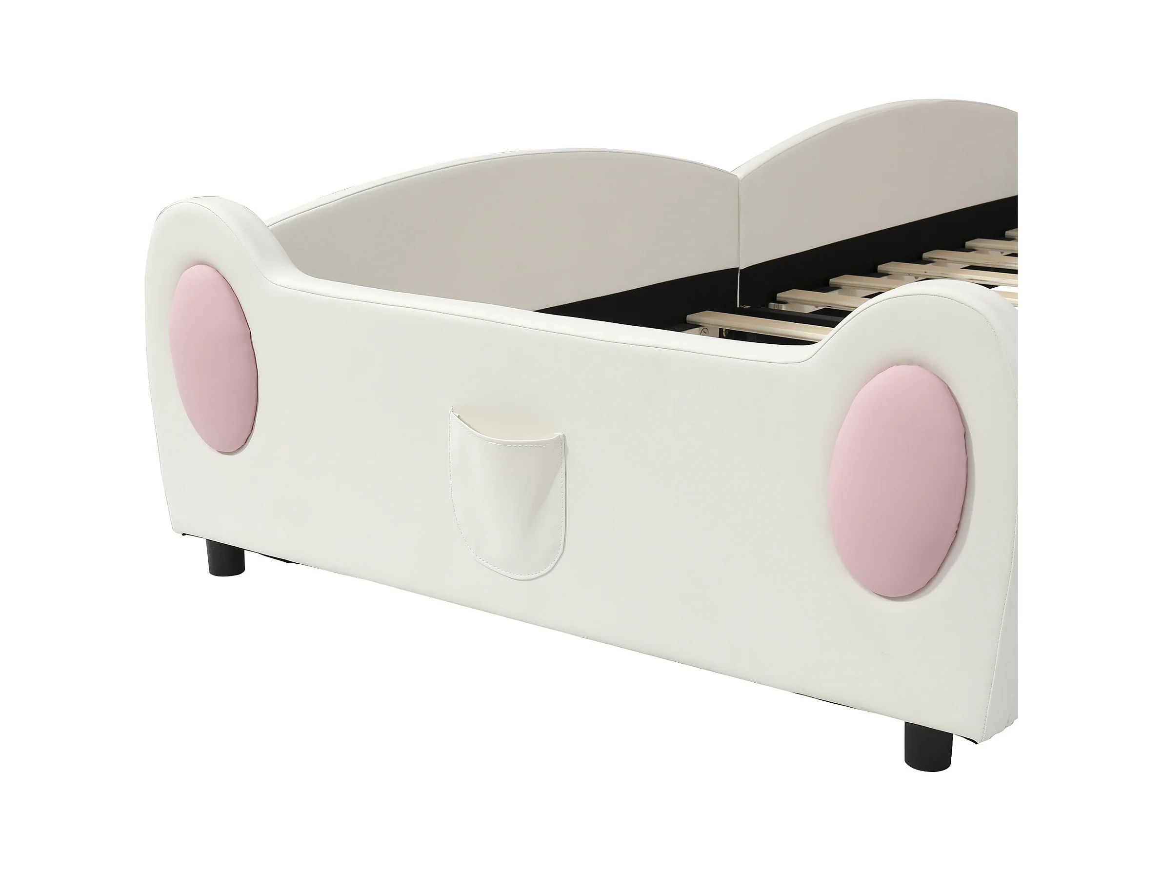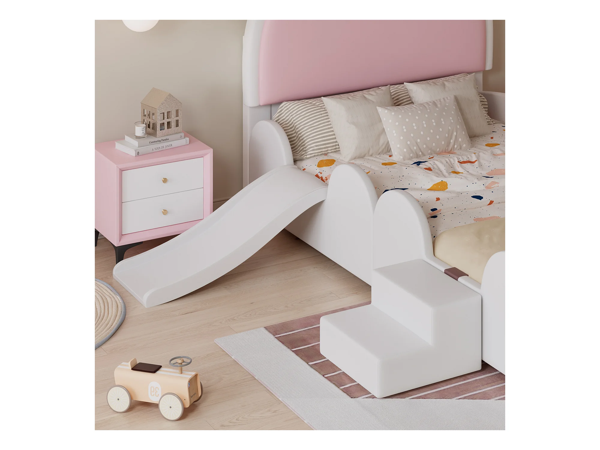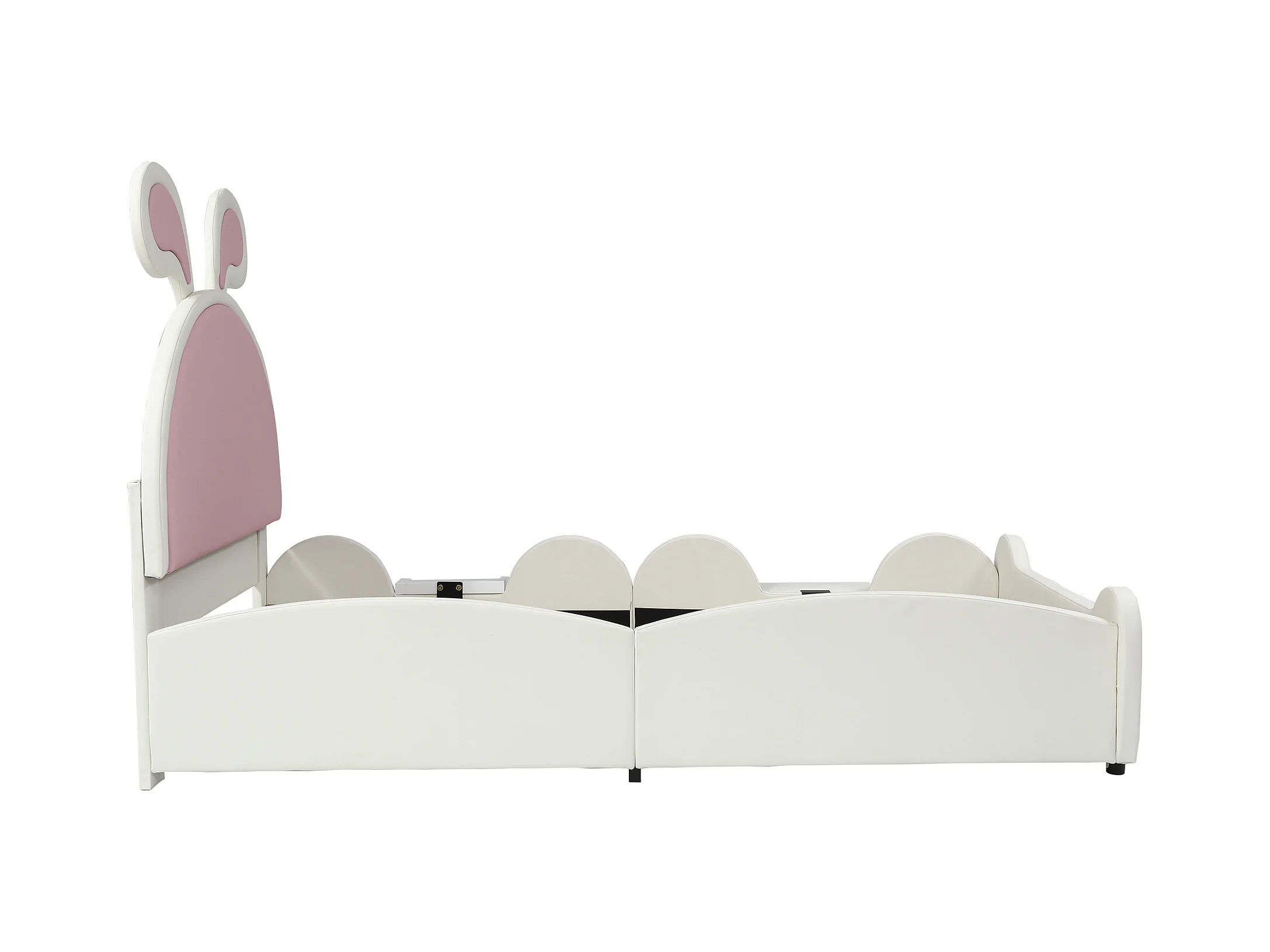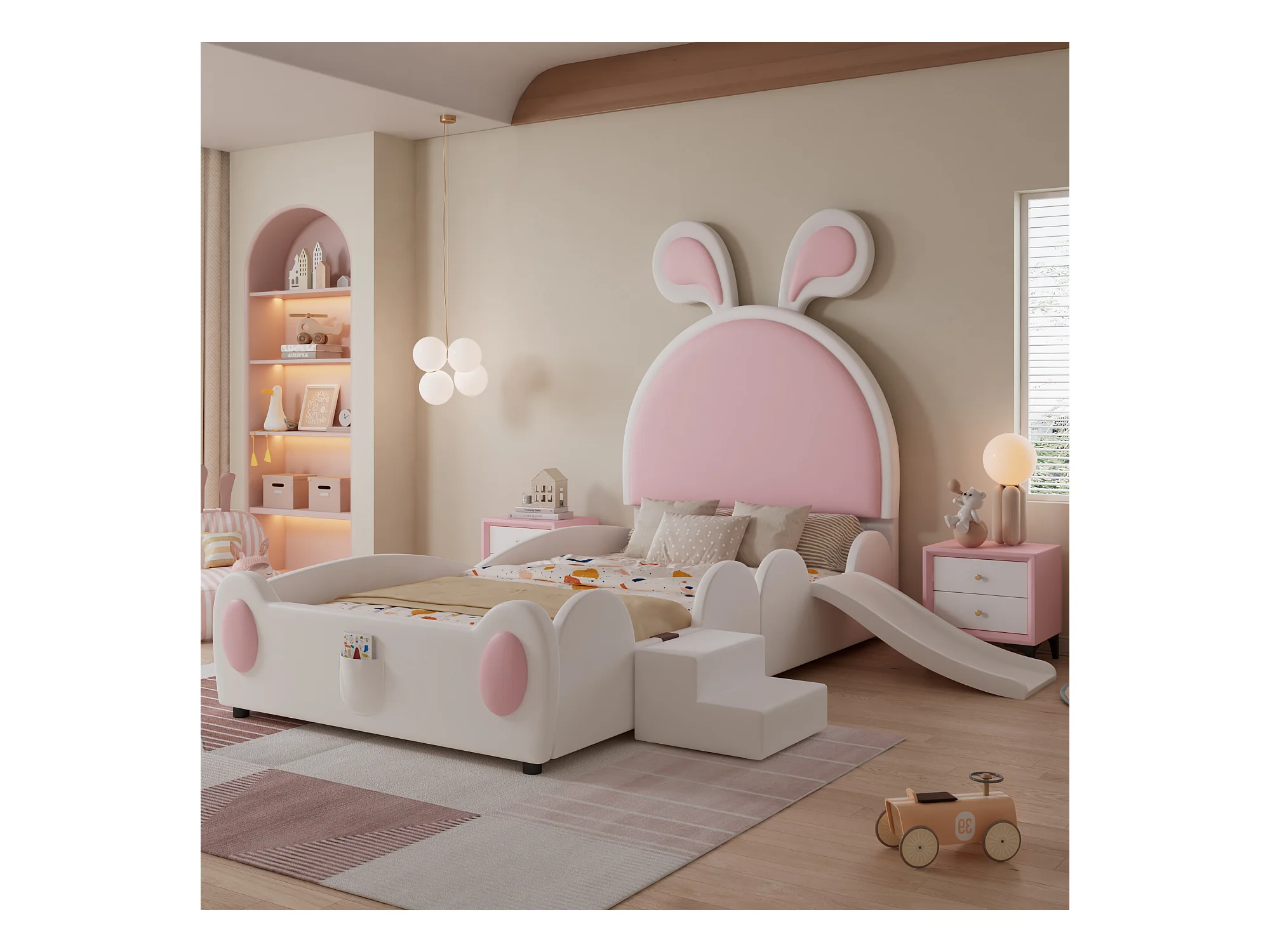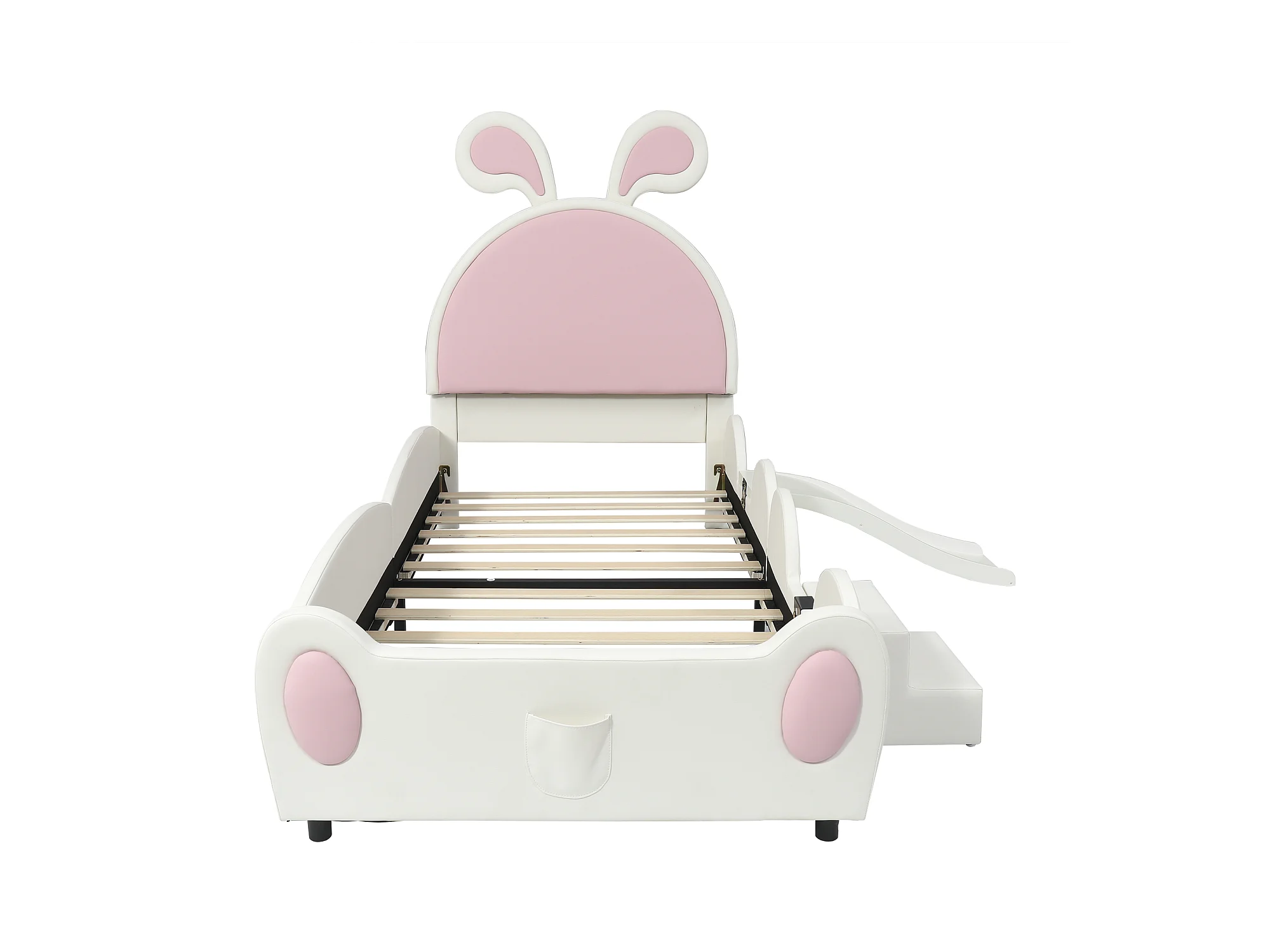 Cama infantil con forma de conejo de 90x200cm, con tobogán y escalera, funda de PU blanca y rosa, somier de láminas, sin colchón
