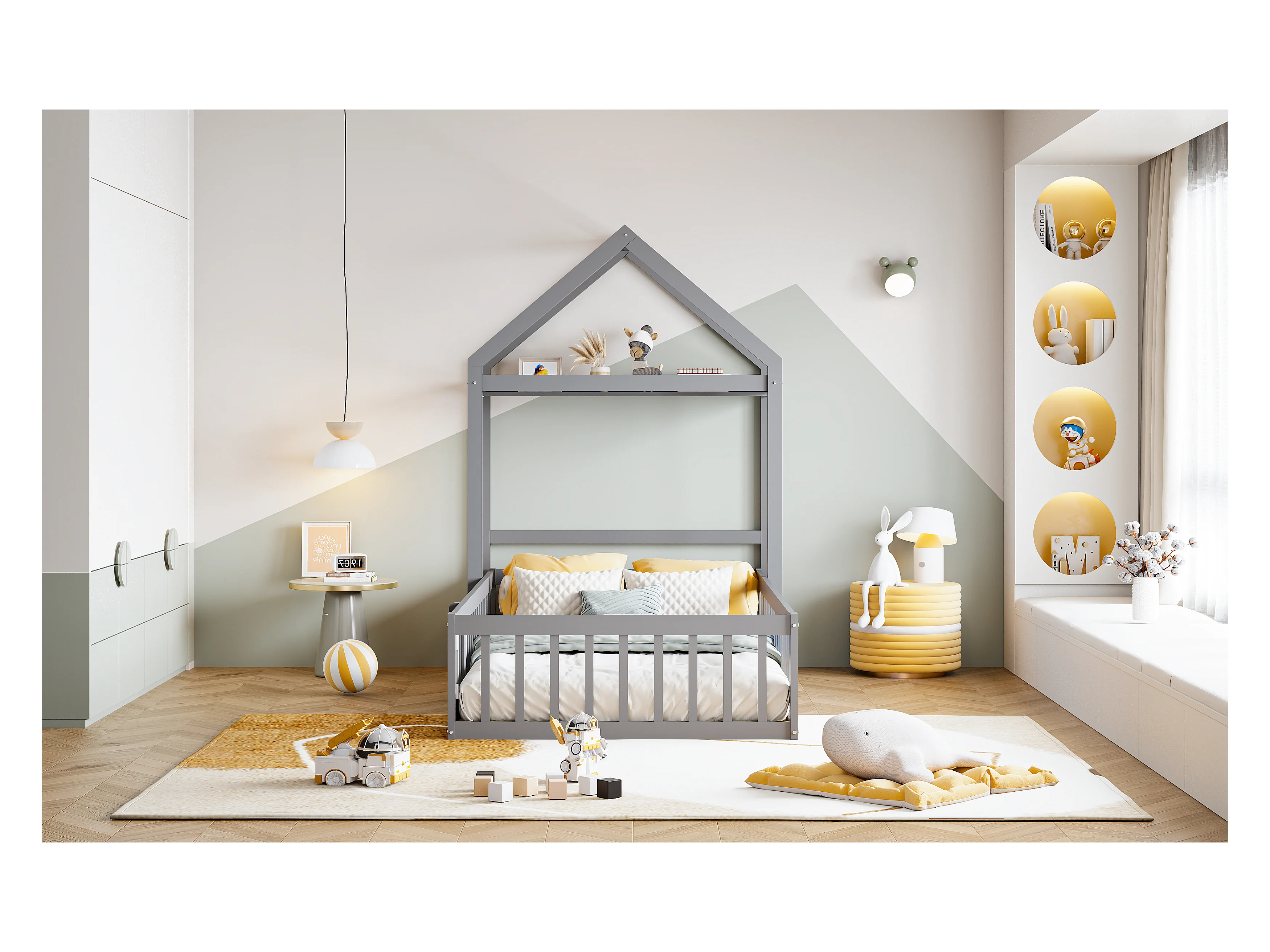 Cama infantil de 90 x 200 cm - Cama con puerta de seguridad y somier de madera - Gris - Sin colchón