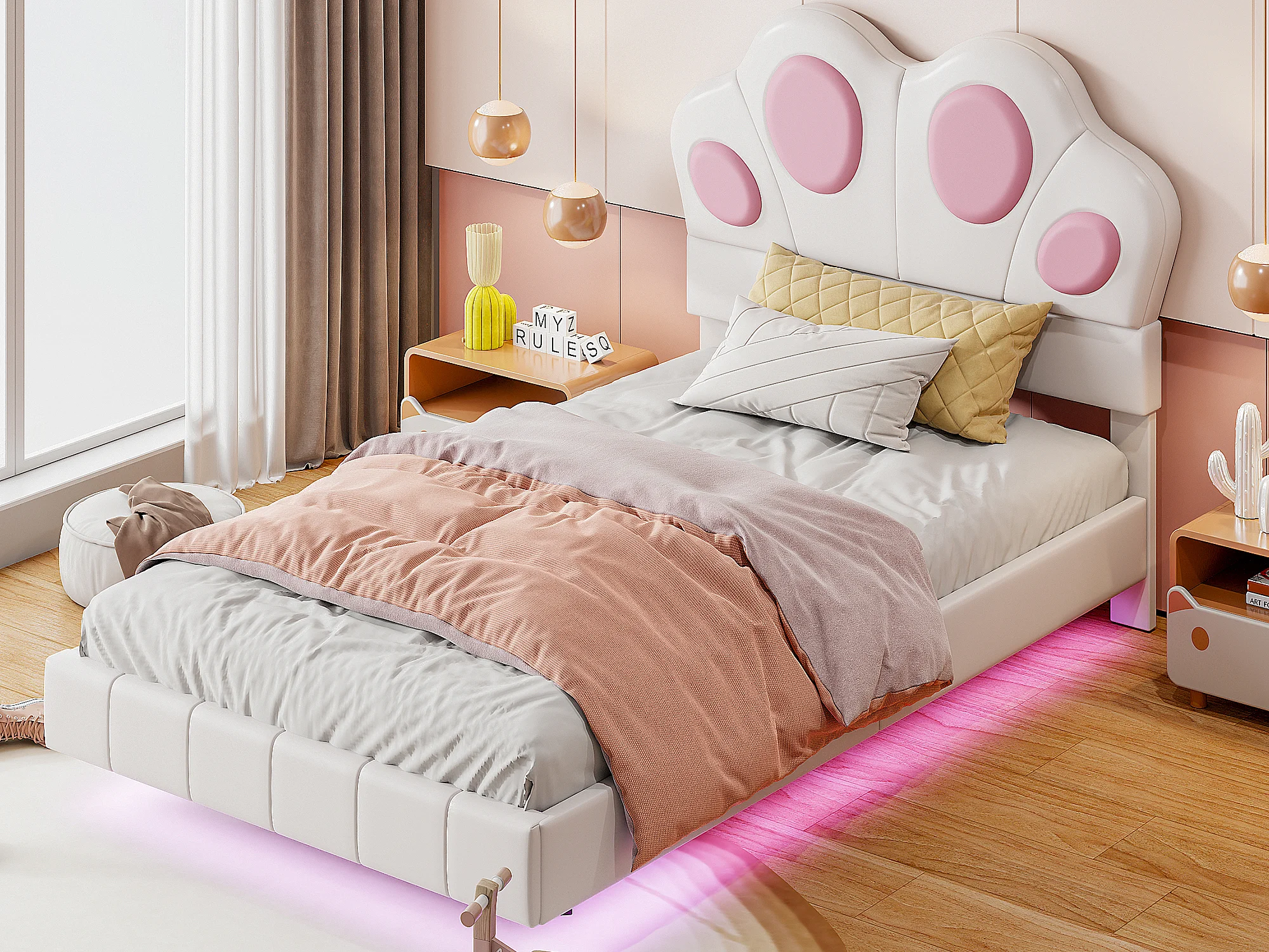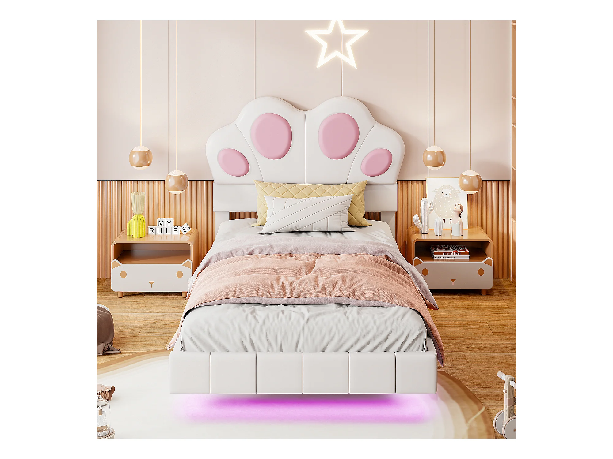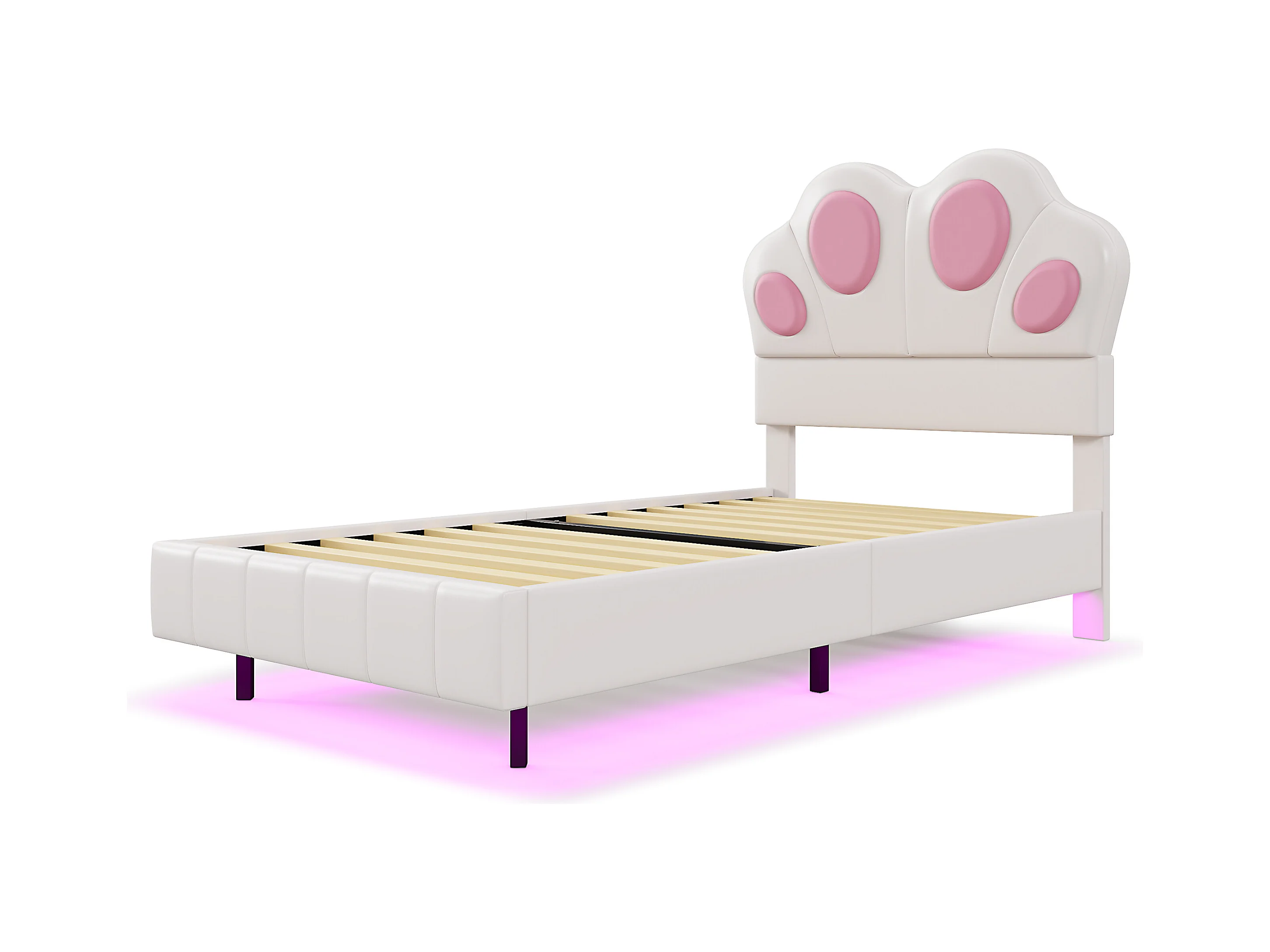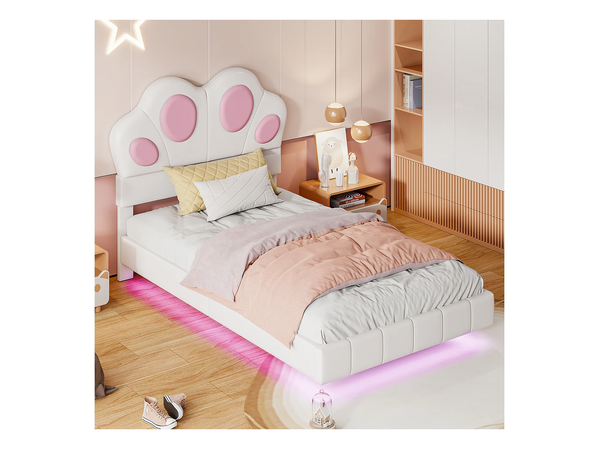 Cama infantil de 90 x 200 cm con forma de pata de gato - Cama flotante - LED - Piel sintética - beige