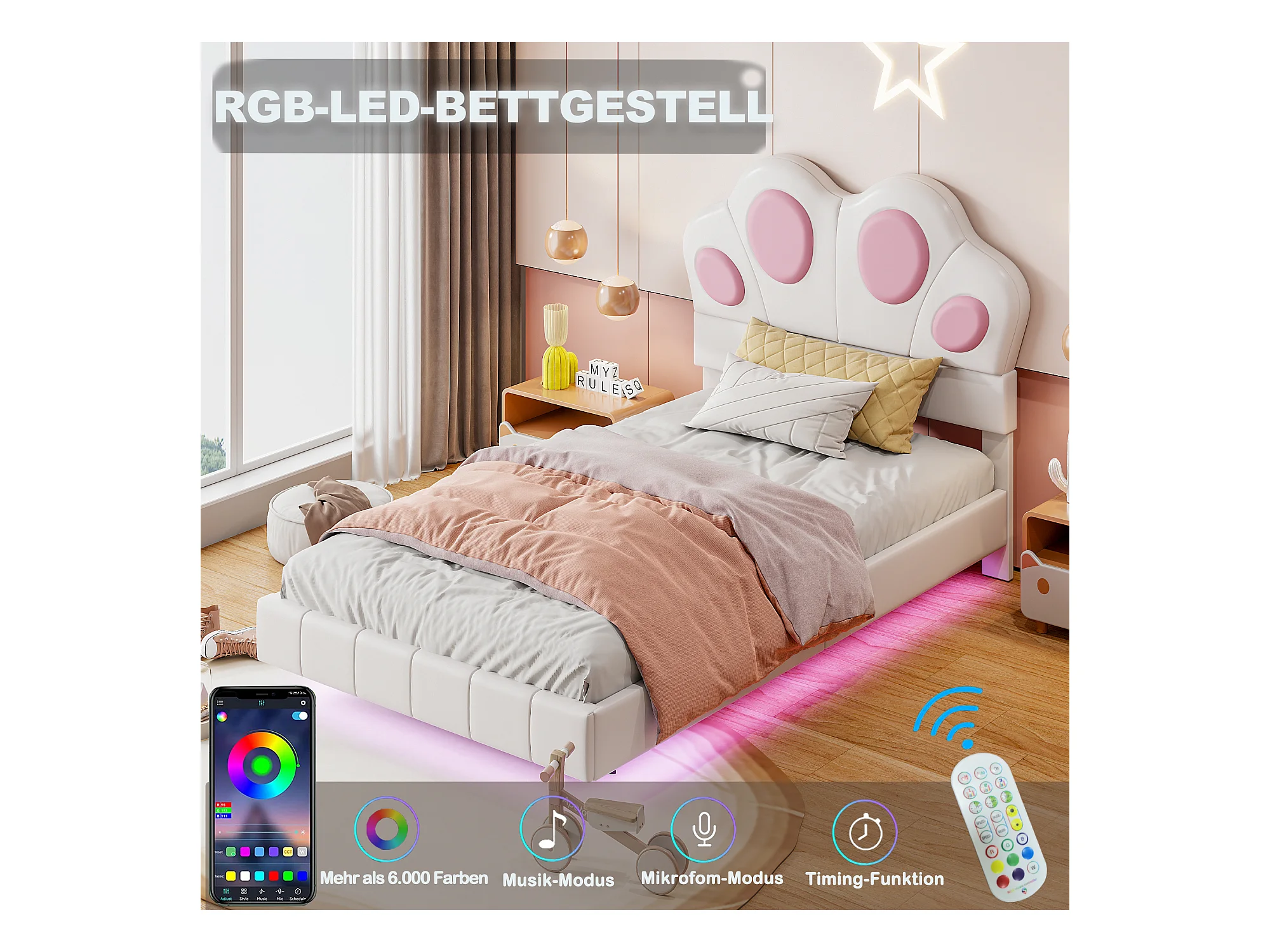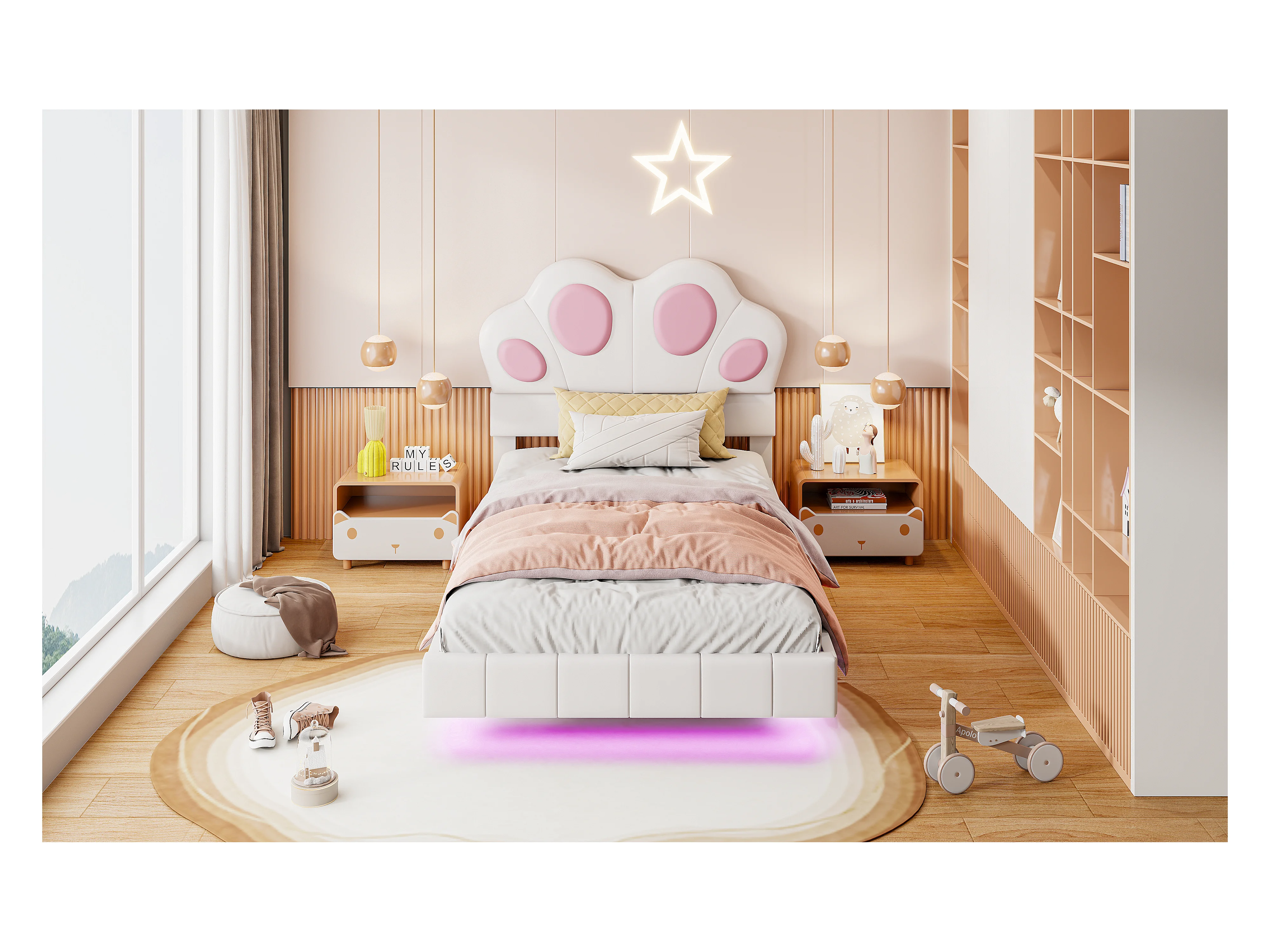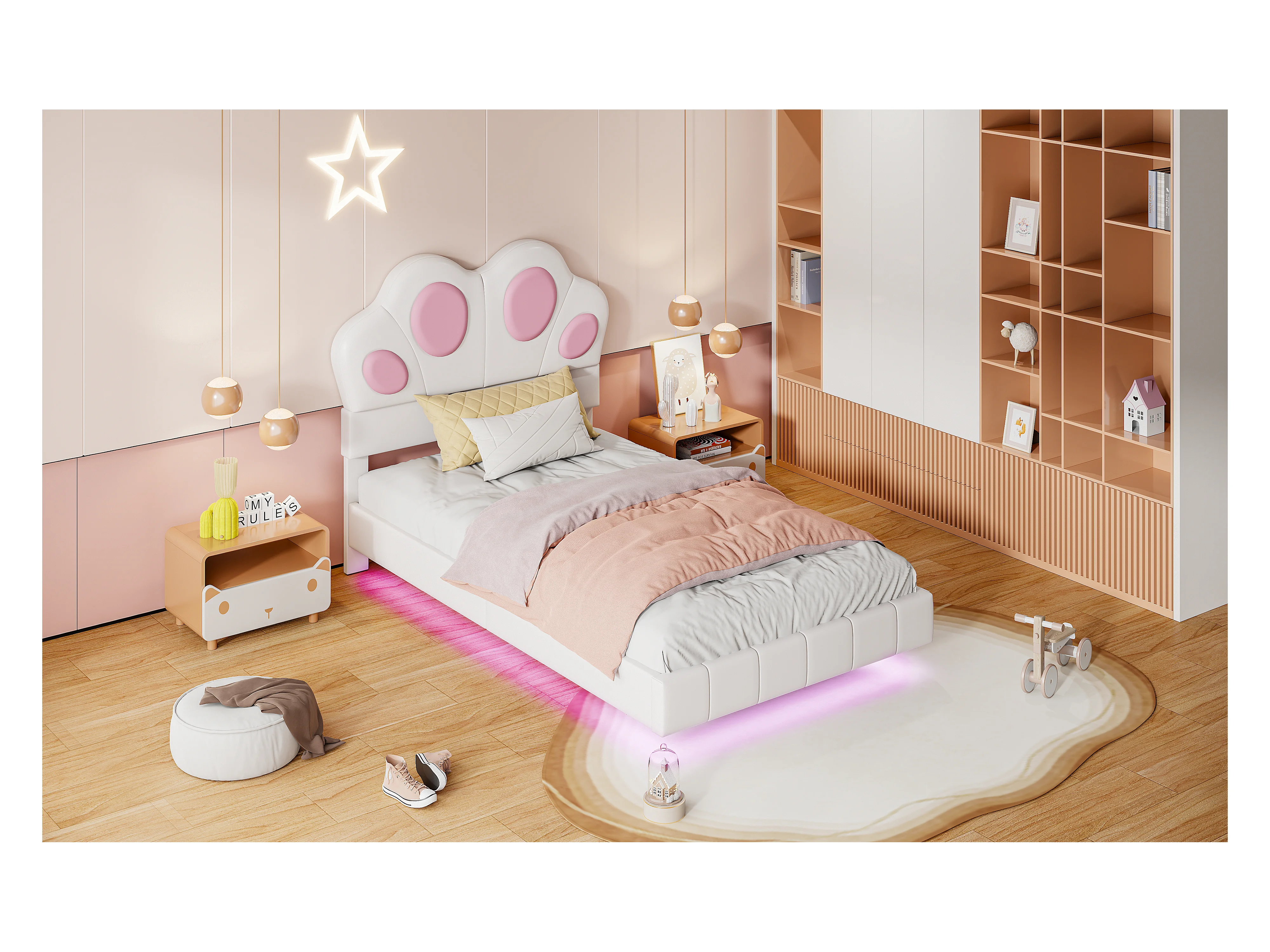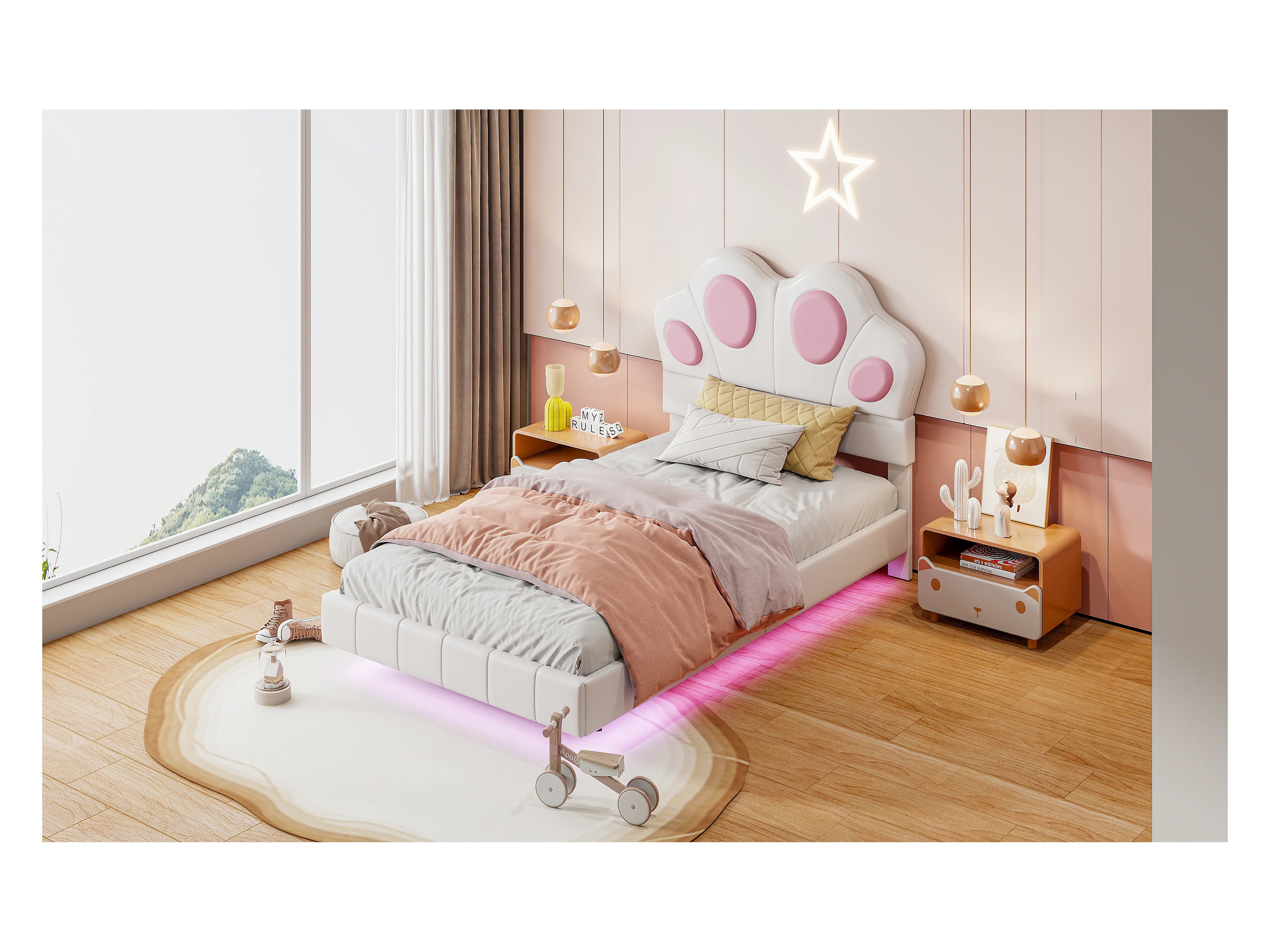 Cama infantil de 90 x 200 cm con forma de pata de gato - Cama flotante - LED - Piel sintética - beige