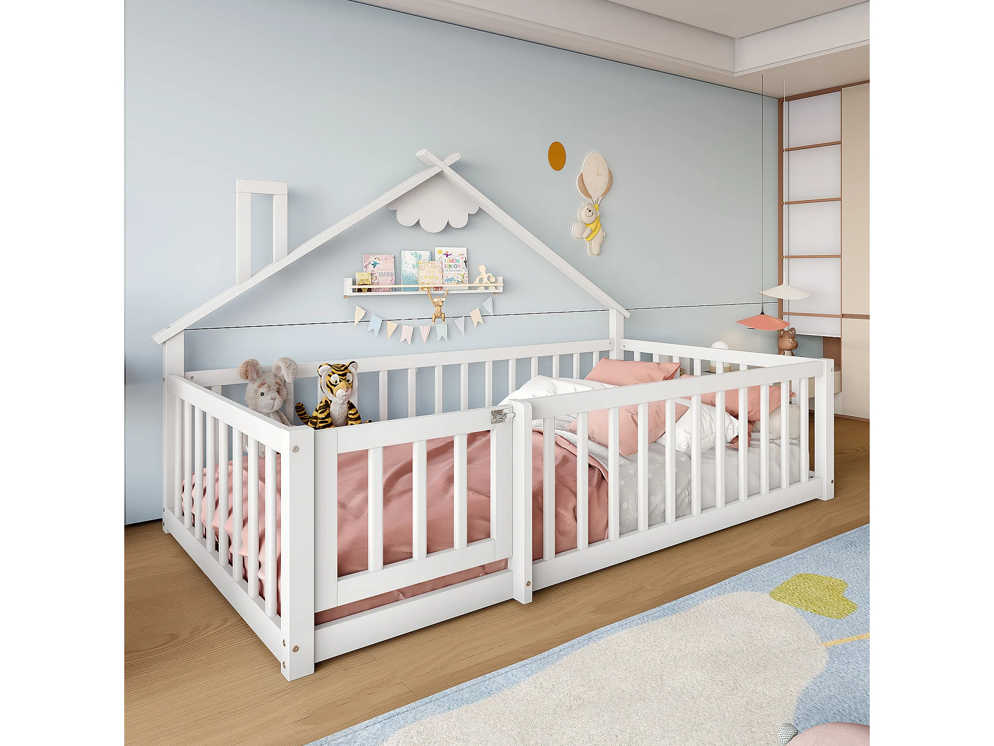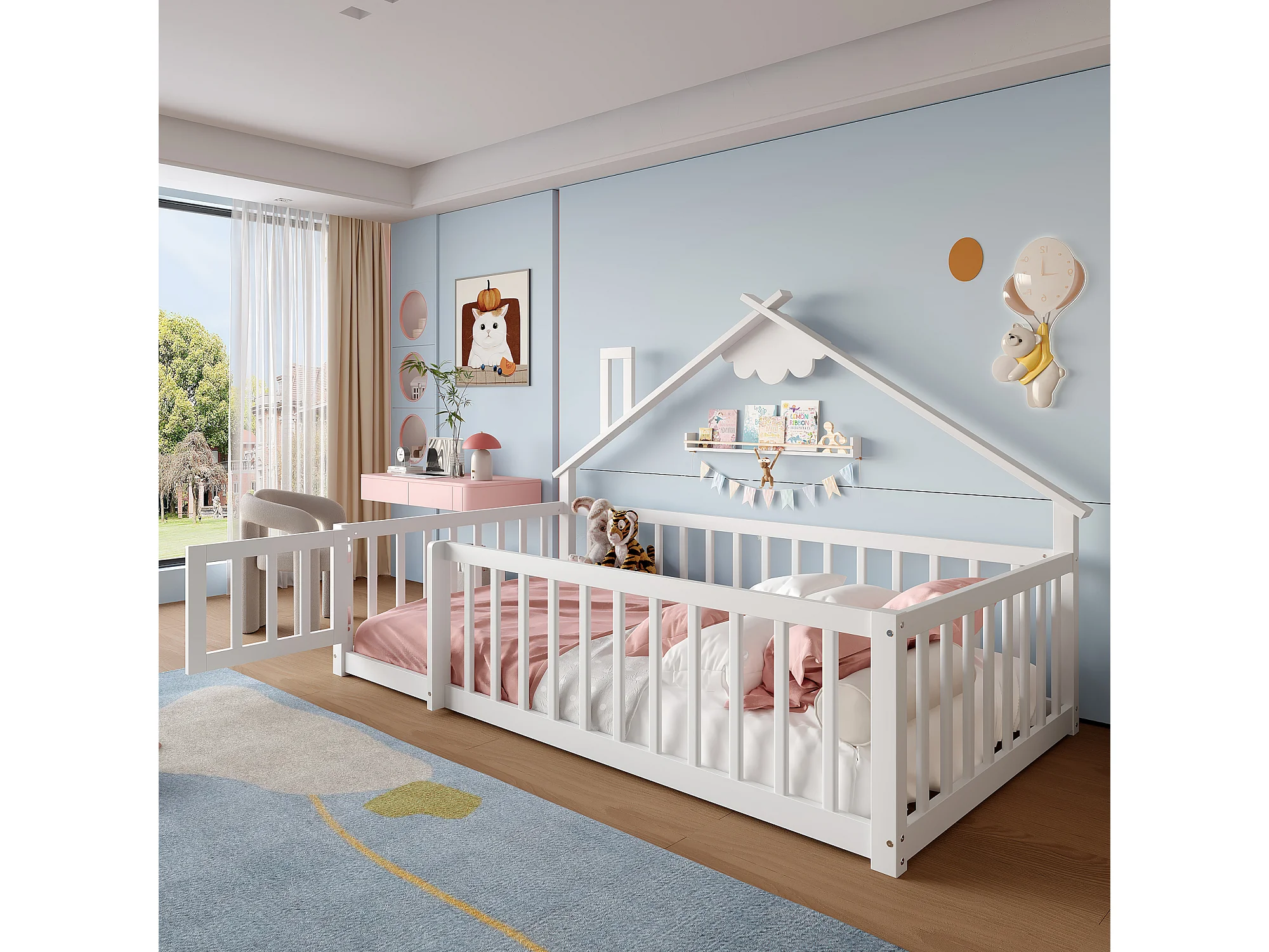 Cama infantil de 90x190 cm en madera maciza con barandilla blanca de seguridad.