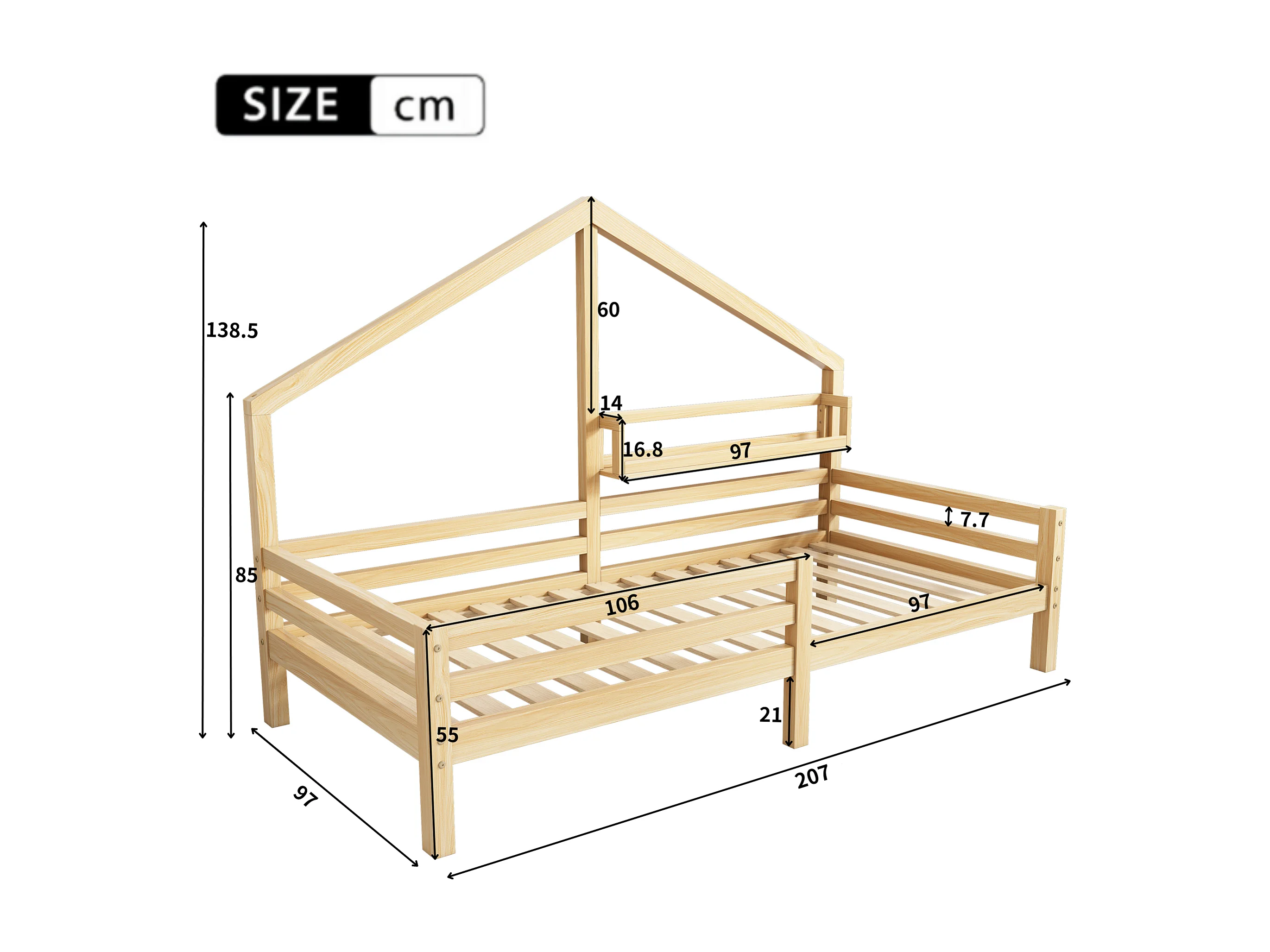 Cama infantil de 90x200 cm con somier de láminas, protección anticaídas y estantería, madera natural (sin colchón)