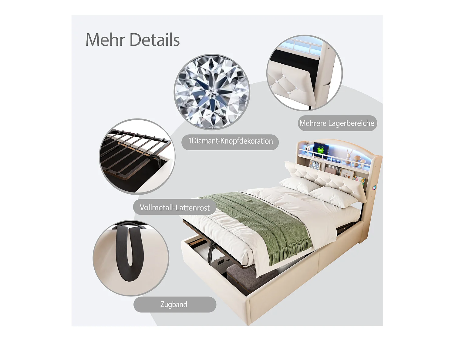 Cama infantil de 90x200 cm en terciopelo beige con LED, puerto USB y almacenaje – Cama individual multifuncional