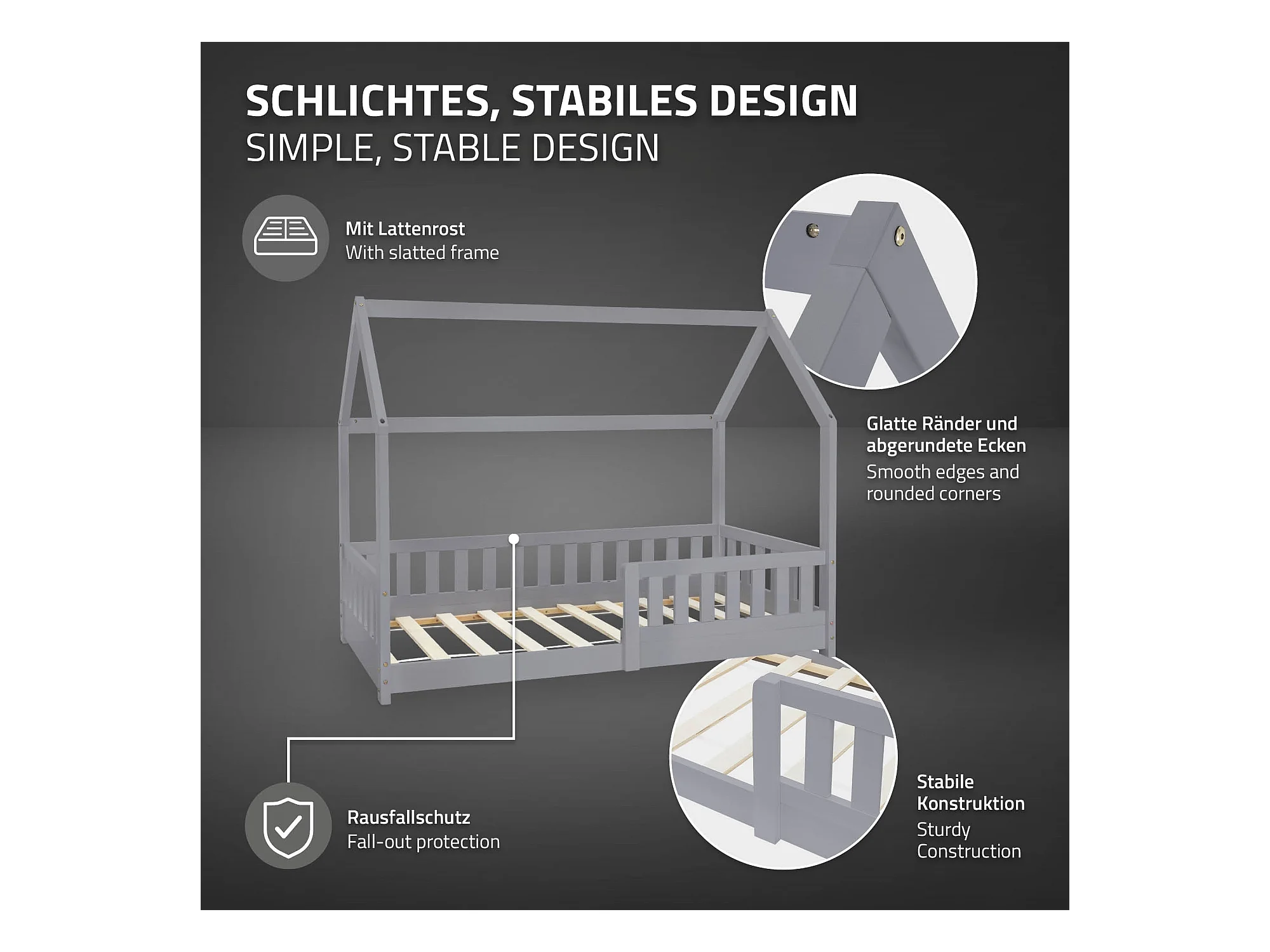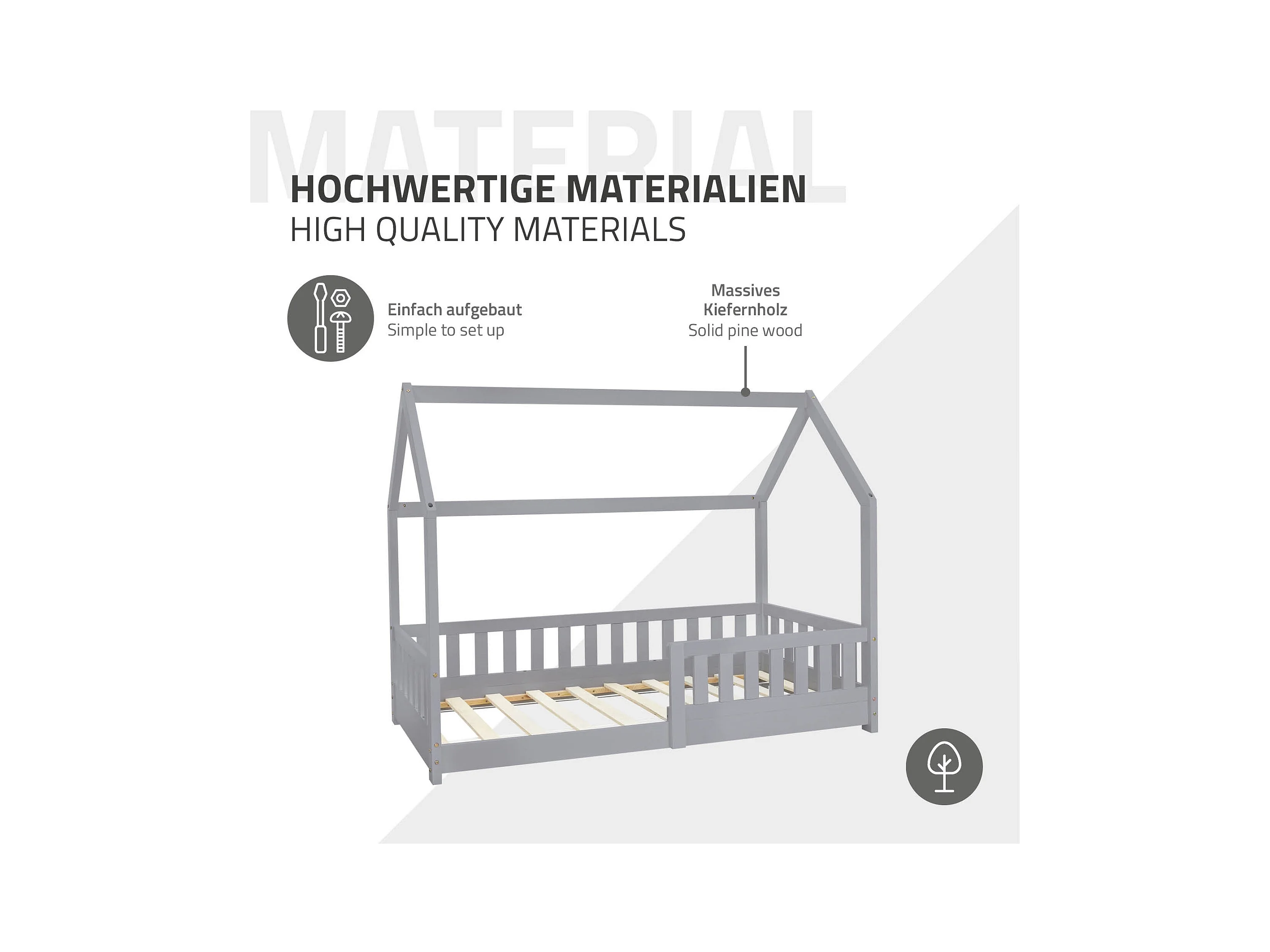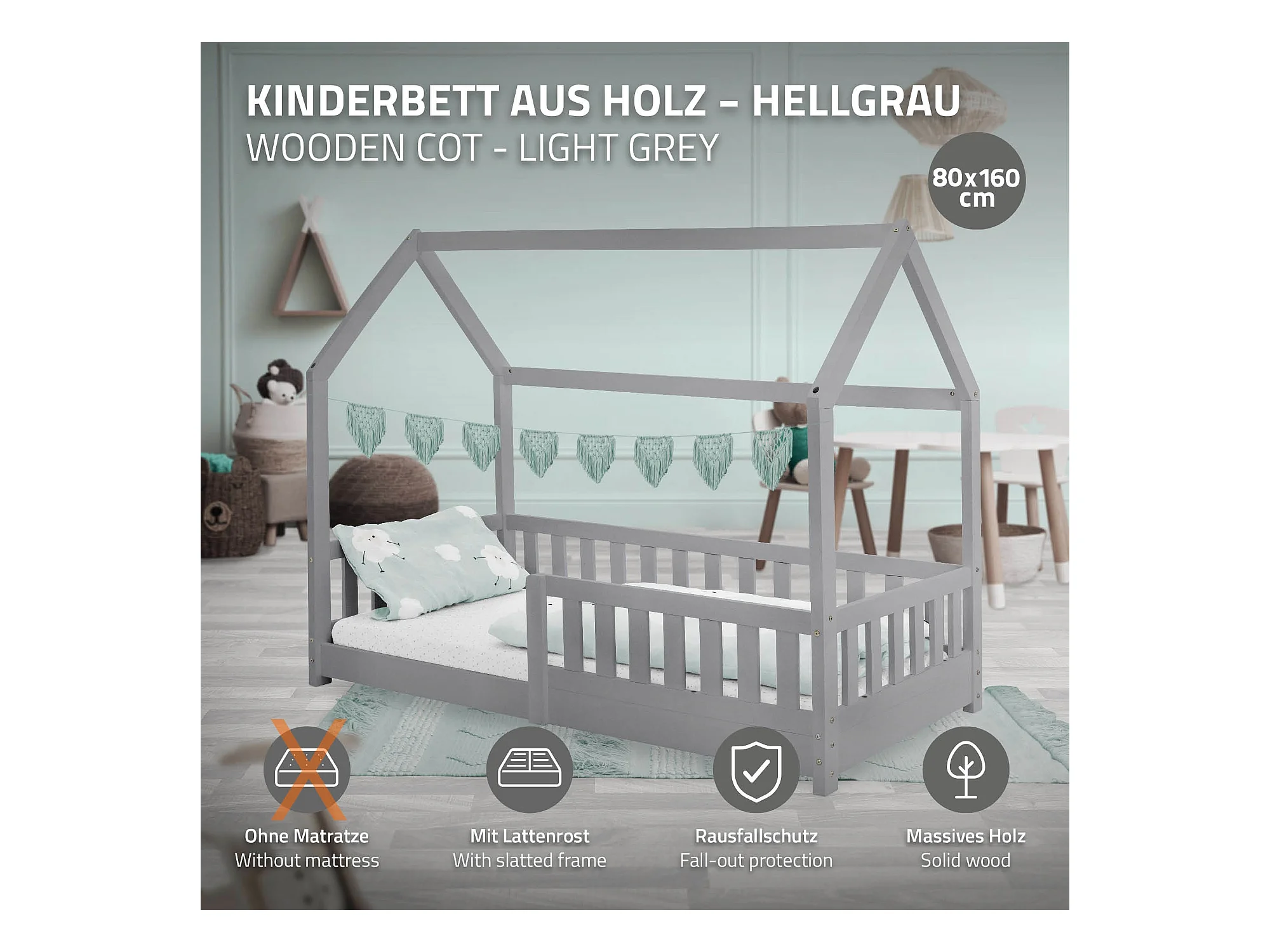 ML-Design Cama infantil casa 80x160cm color gris claro con protección anticaída y somier mobiliario con estructura de listones madera de pino maciza